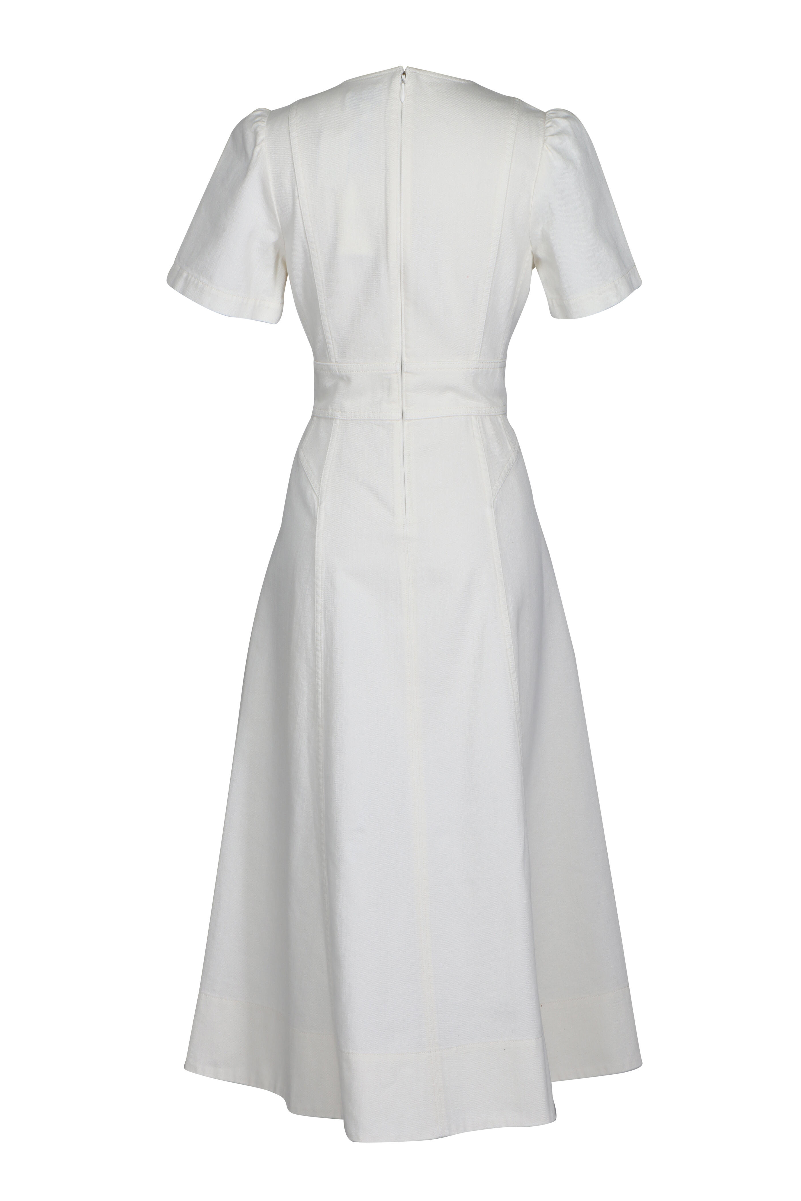 V-neckline. Short sleeves. Invisible back zipper. Slit at center front skirt. Imported. 100% Cotton. Dry clean.