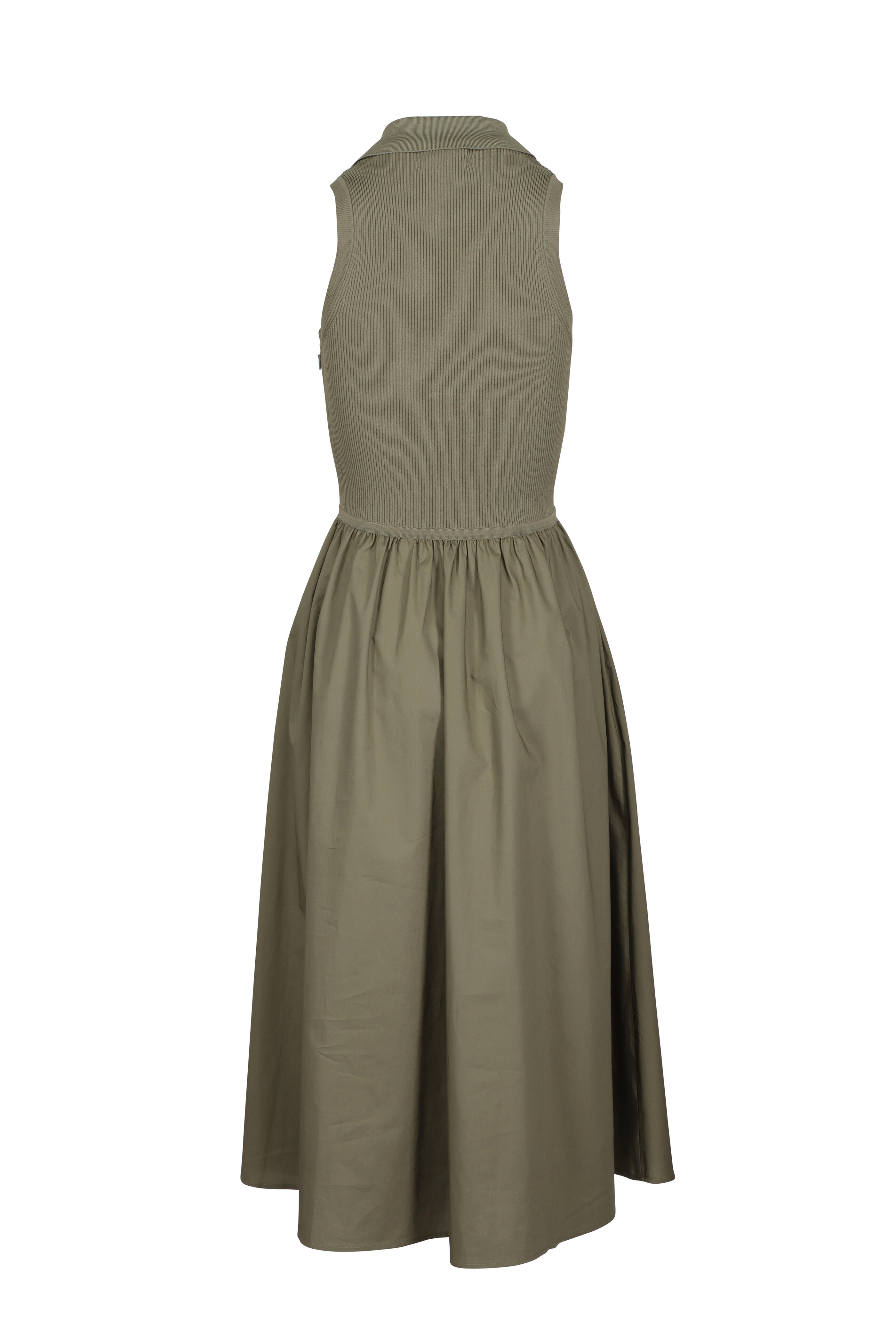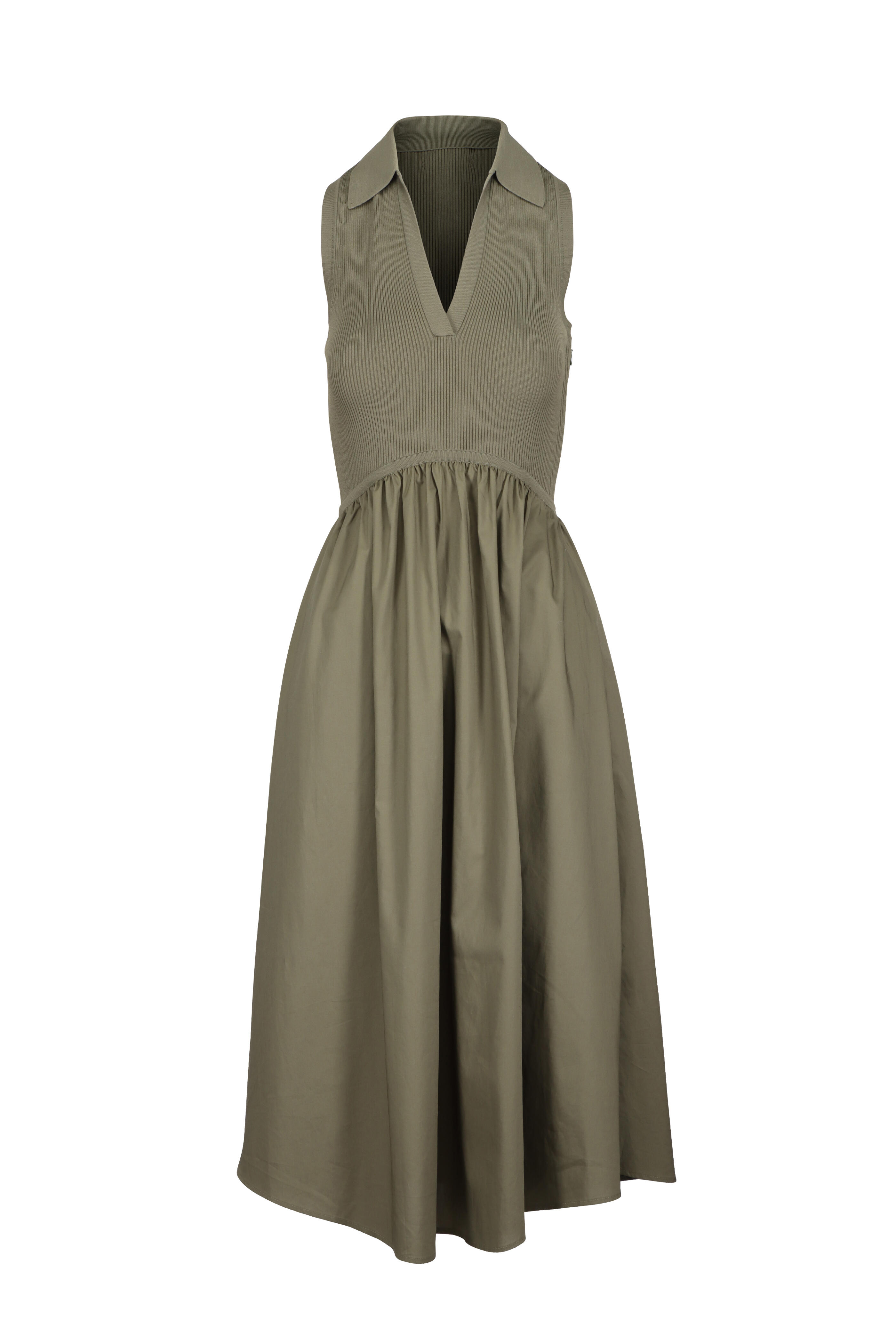Collared. V-neck. Knit bodice. High low waist seam. Hidden side zipper. Cotton skirt. Imported. True to size. 100% Cotton. Dry clean only.