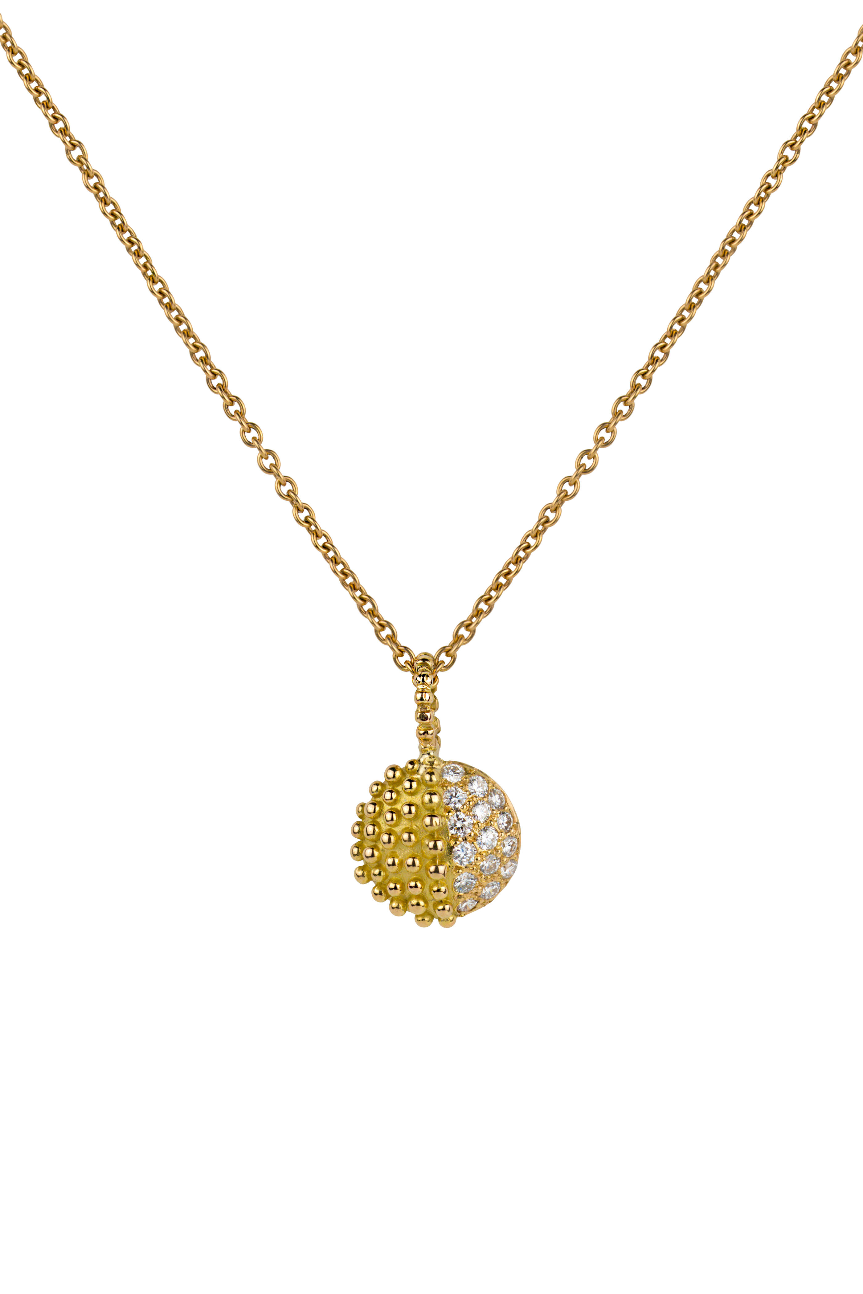Generous, round, luminous… the Ni Oui Ni Non pendant plays on the contrast between gold and sparkling diamond. Neither fully paved with golden granules nor entirely set with stones, it evokes the delicate dance of ambiguity — like an enigmatic riddle in motion.