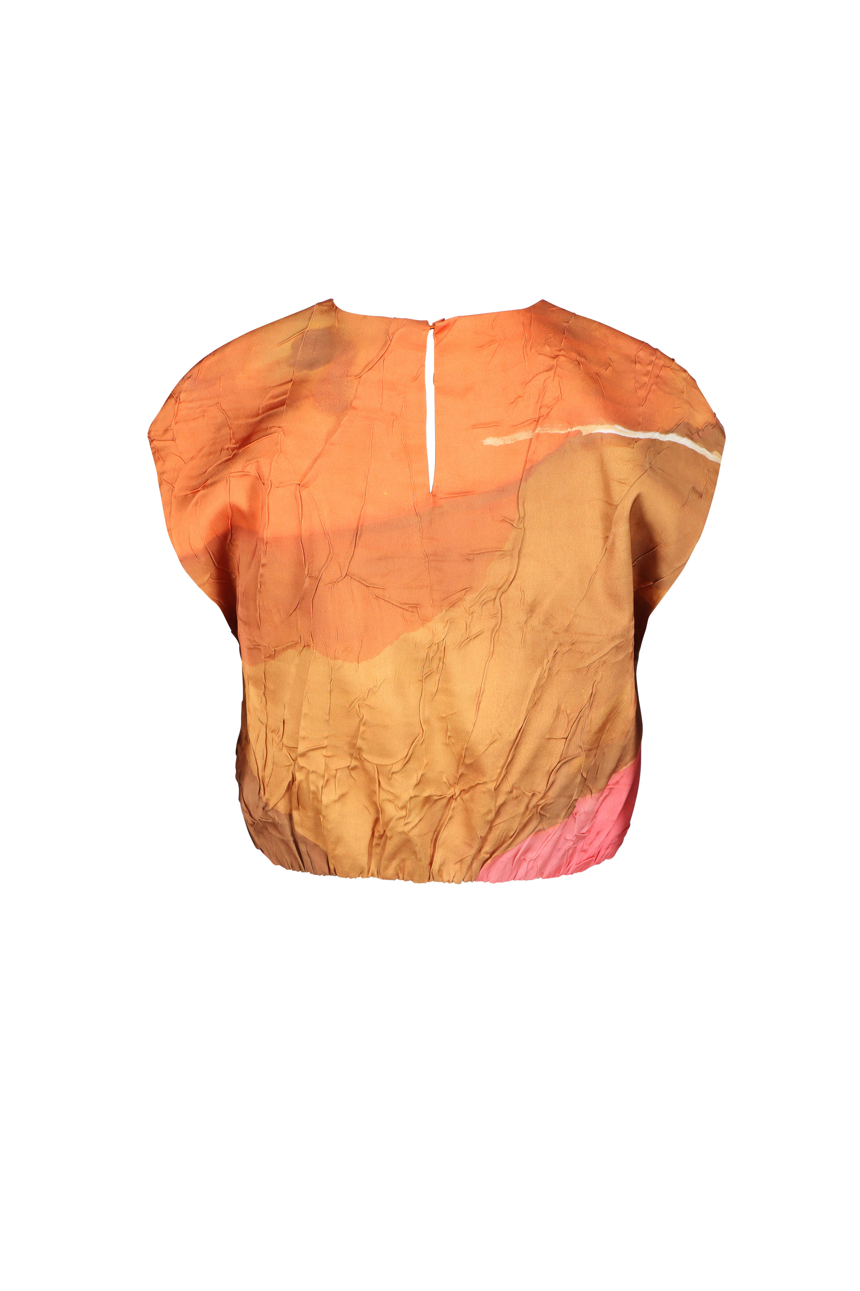 Round neckline. Sleeveless. Button keyhole at back. Elastic hem. Imported. Designed for a relaxed, cropped fit. 100% polyester; fully lined. Dry clean.