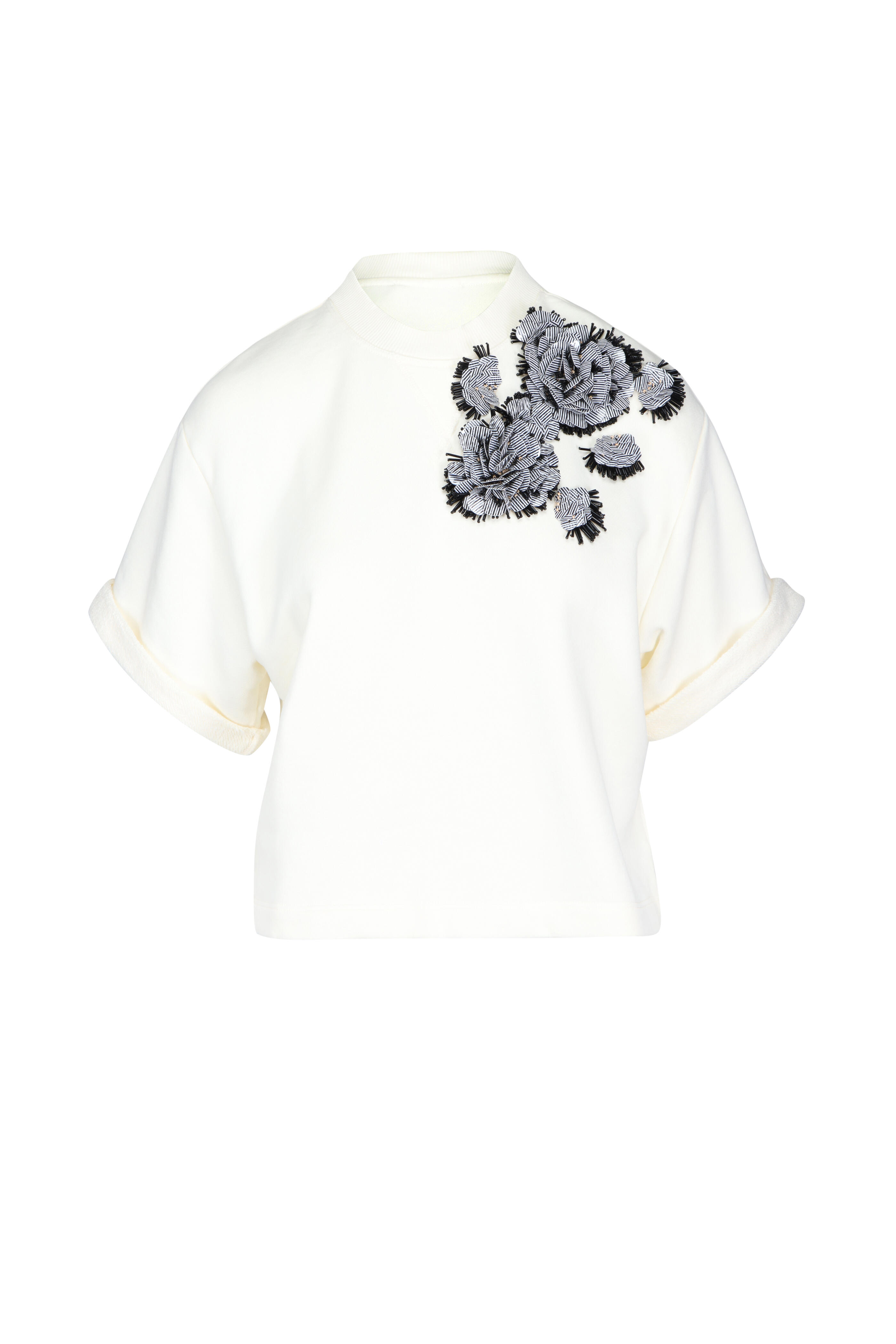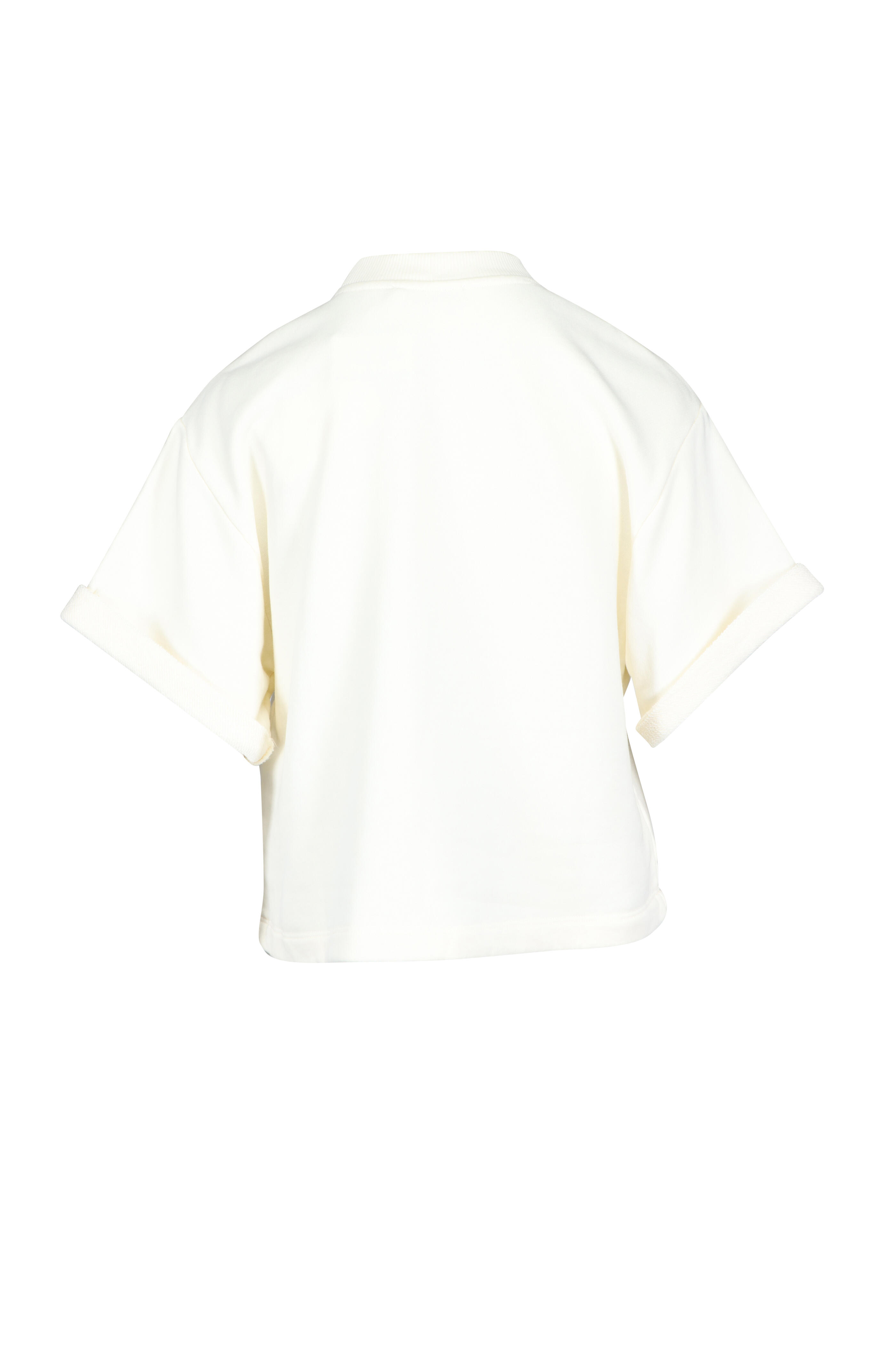 Crewneck collar. Short sleeves with folded cuffs. Loop-back french terry. Pullover style. Imported. Designed for a boxy fit. 100% cotton. Hand wash.