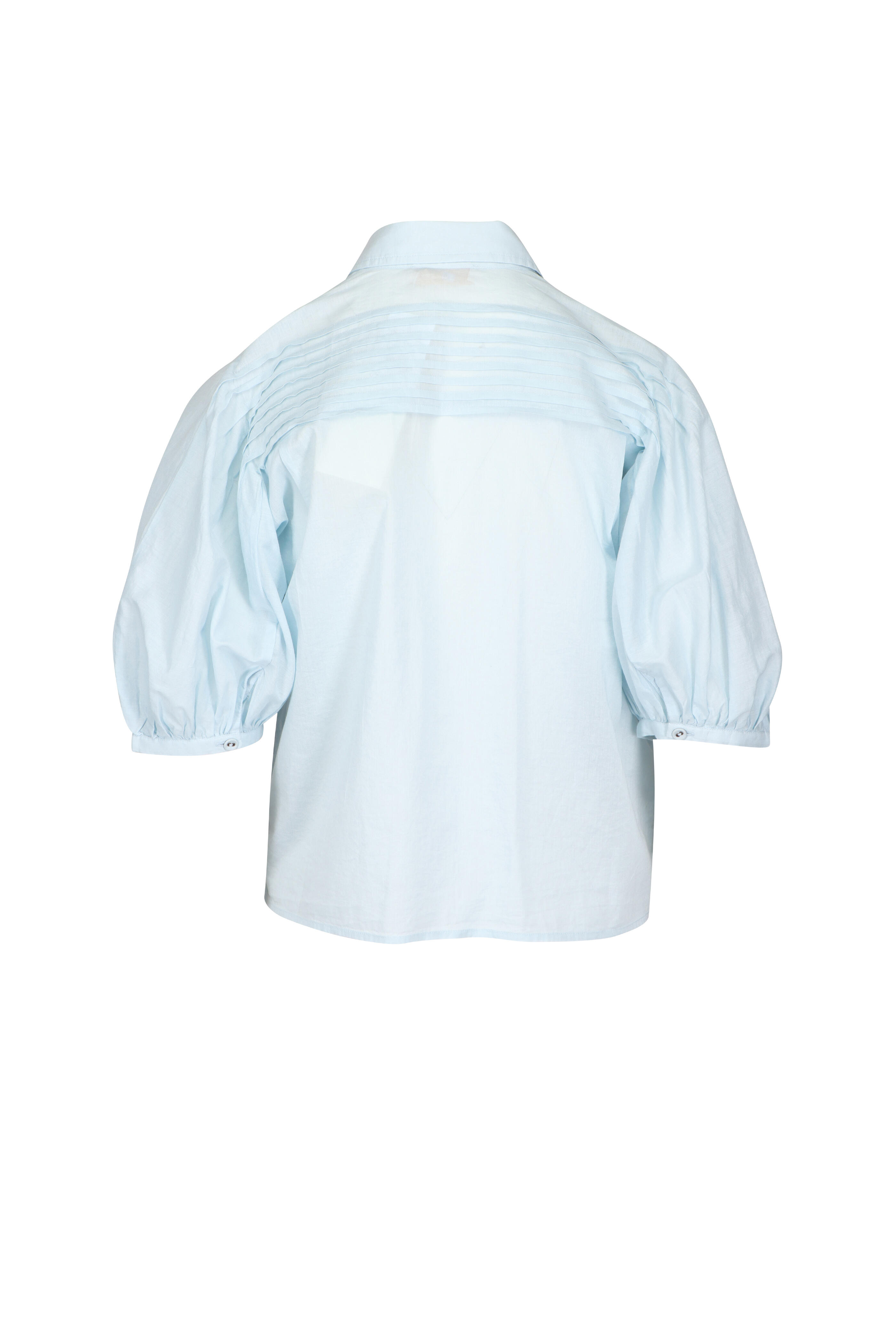 Collared neck. Button placket. Short puff sleeves. Pintuck details at front. Gathered at sleeves. Imported. 100% cotton. Dry clean.