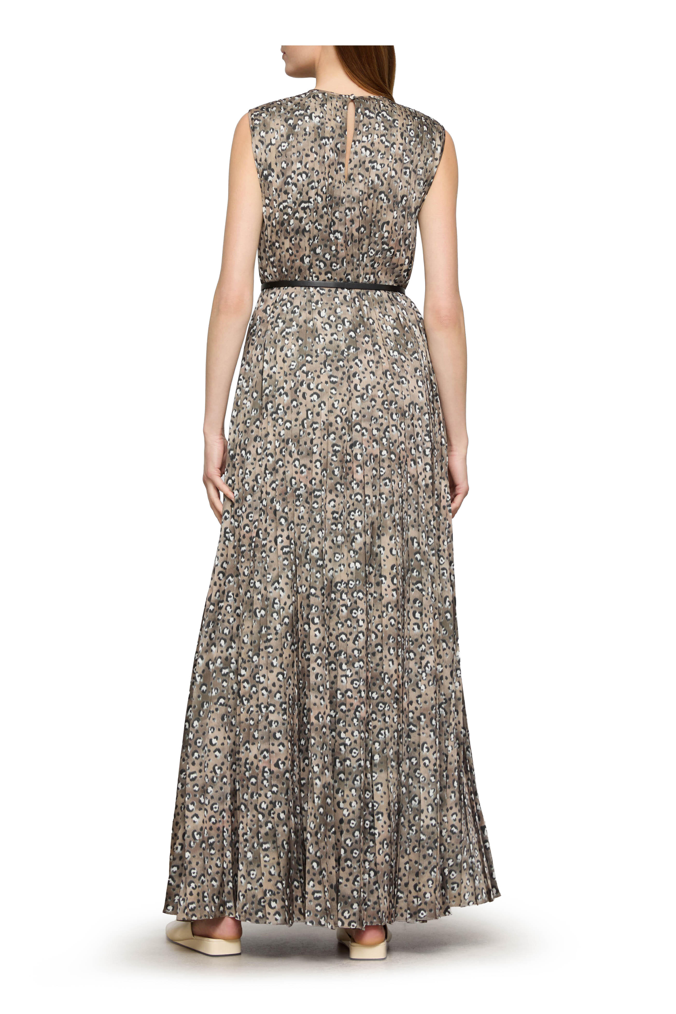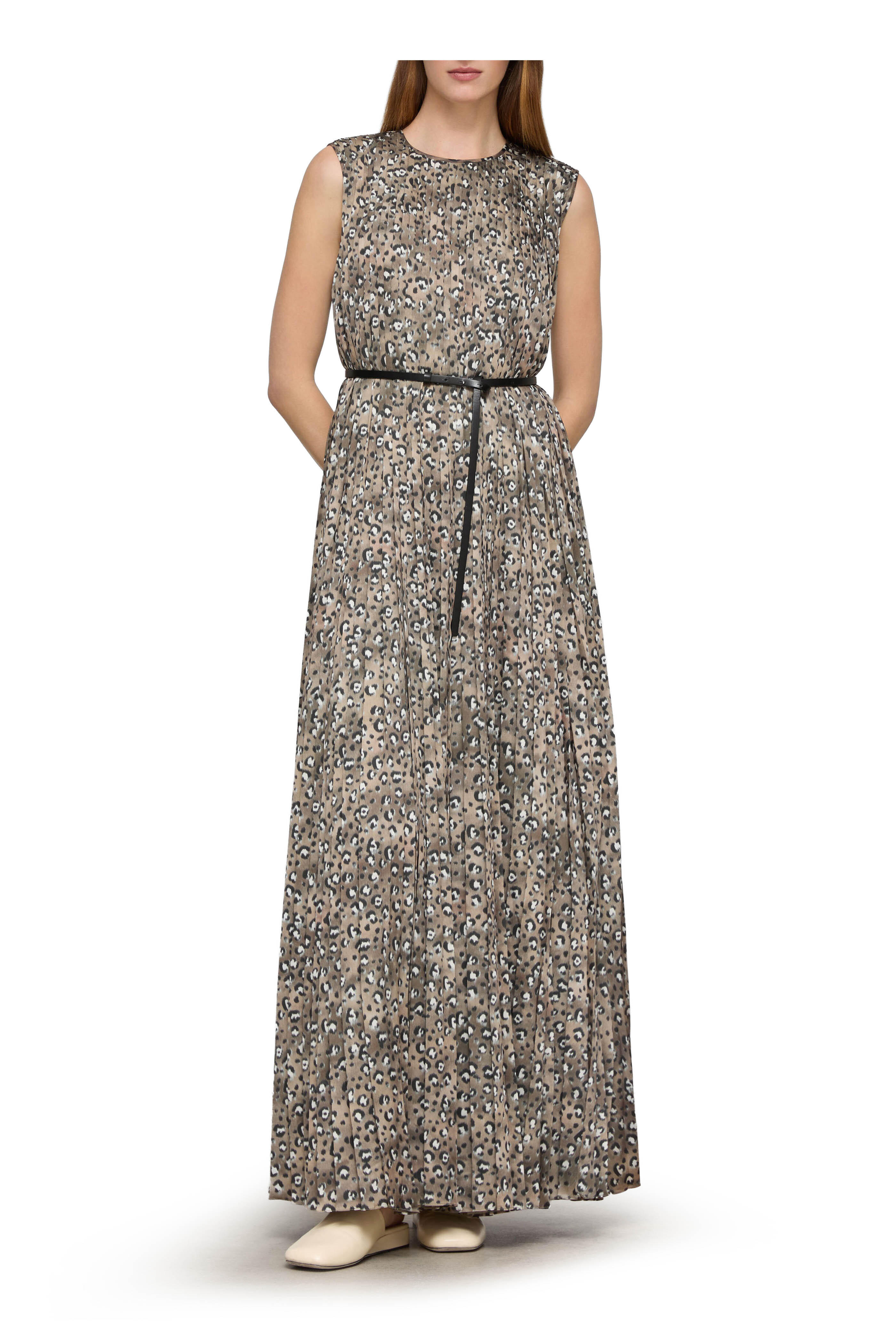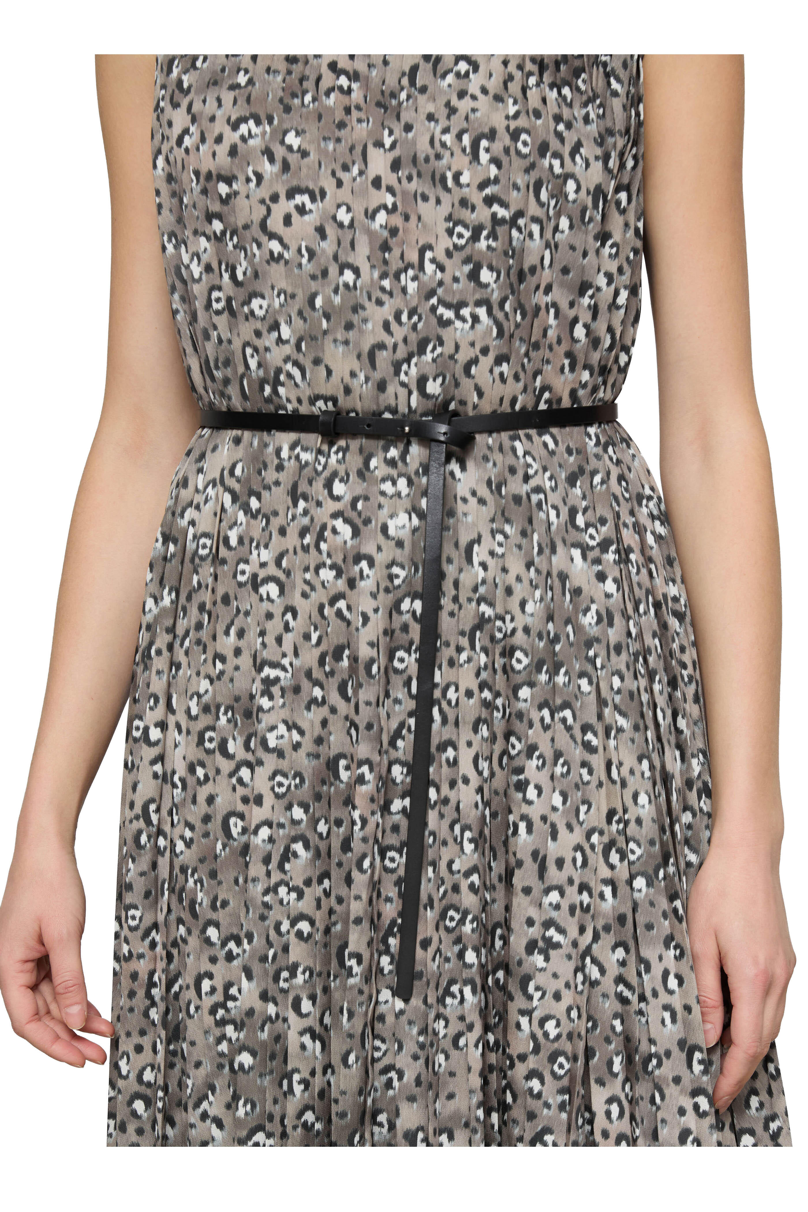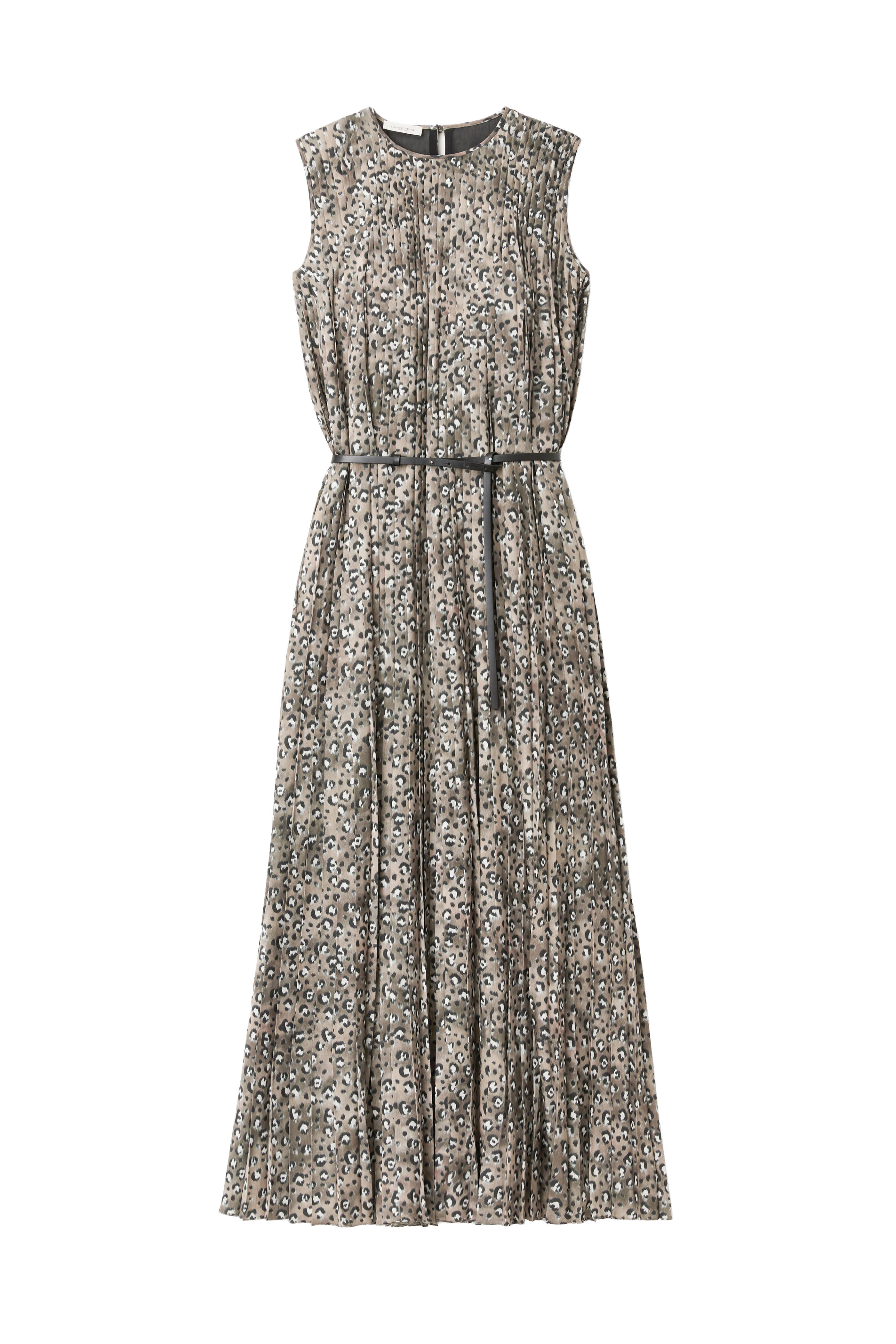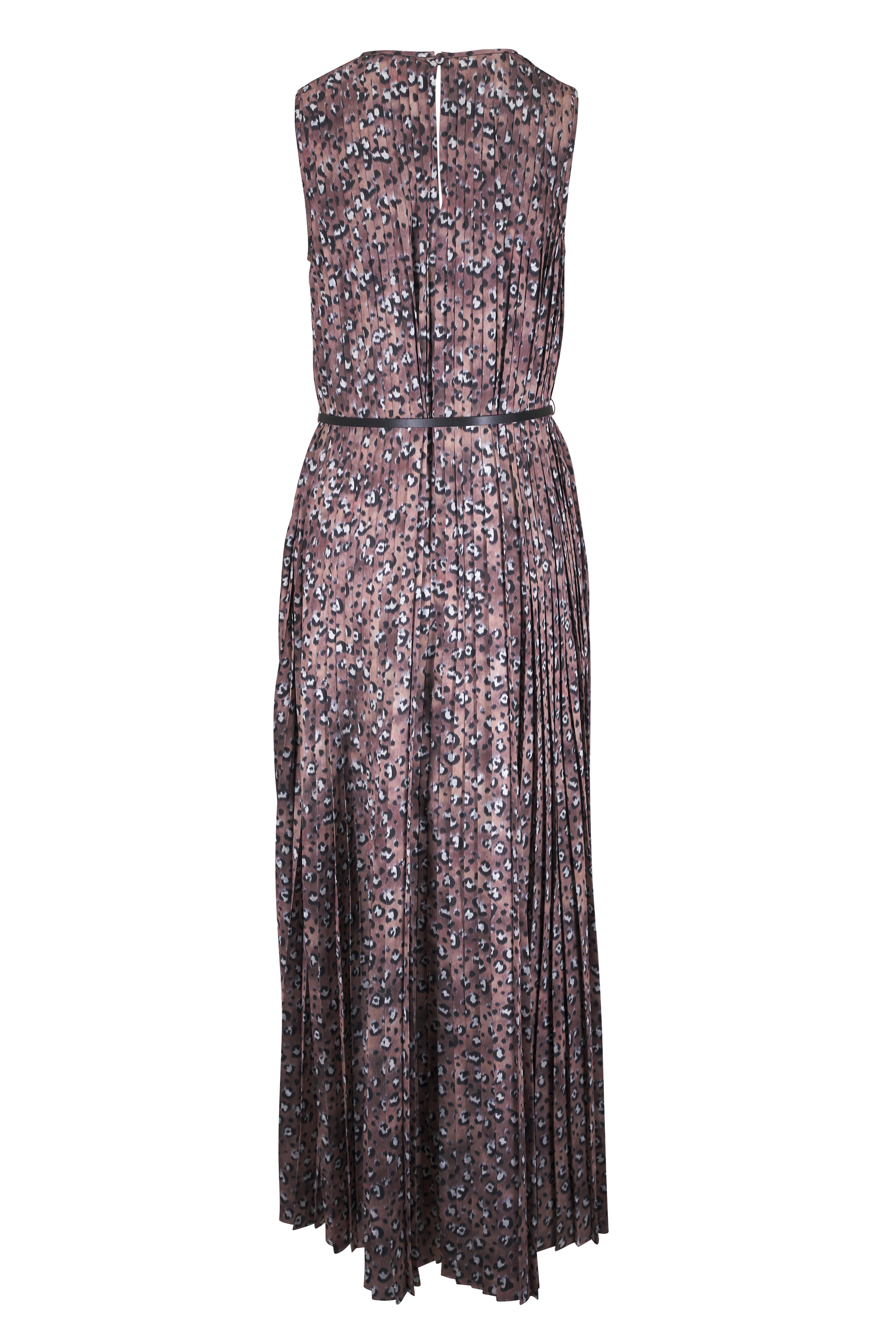 Crew neckline. Keyhole button back. Removable leather belt. Pleated. Imported. Approximately 58" shoulder to hem (measurements taken from size M). 100% polyester; lined. Dry clean.