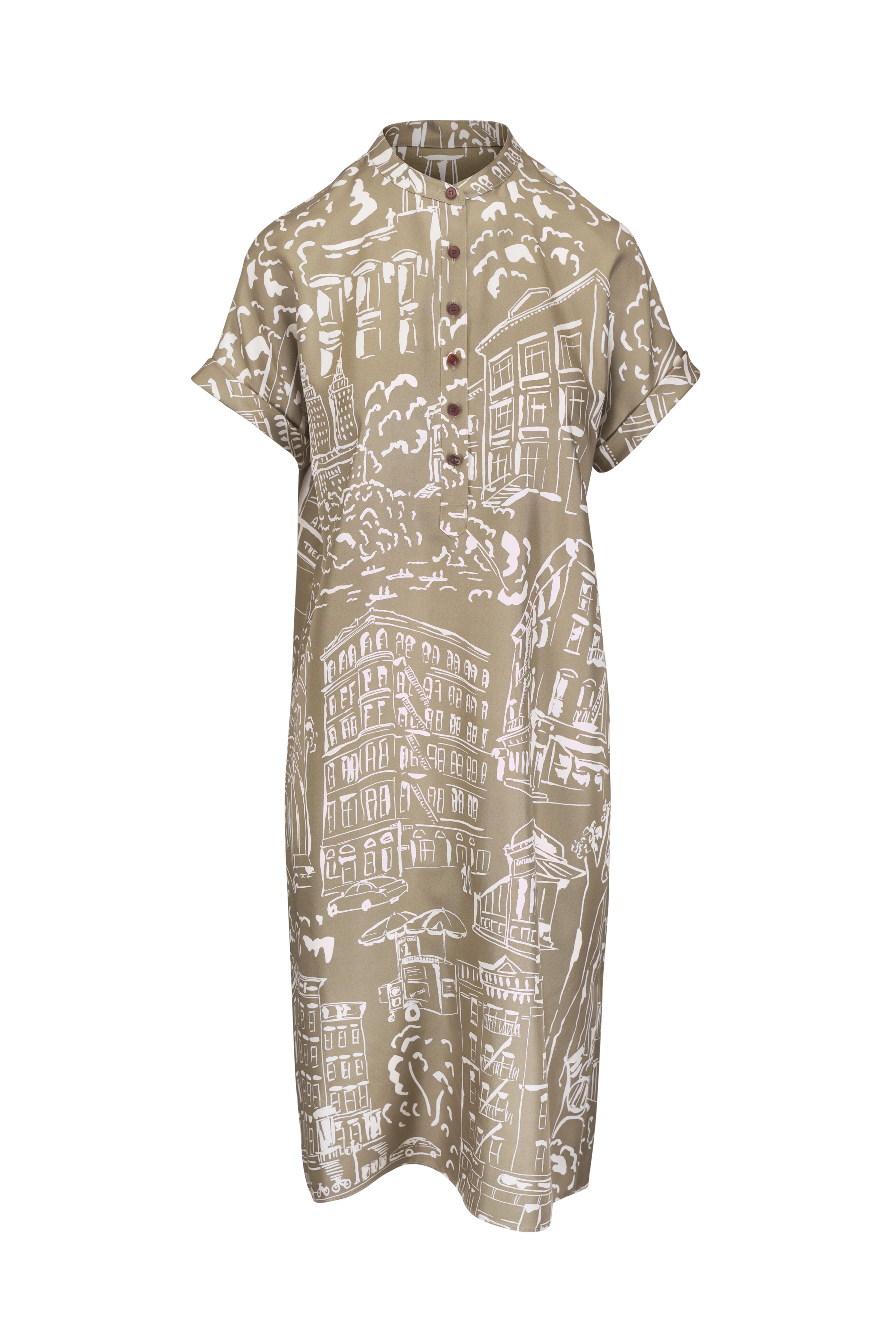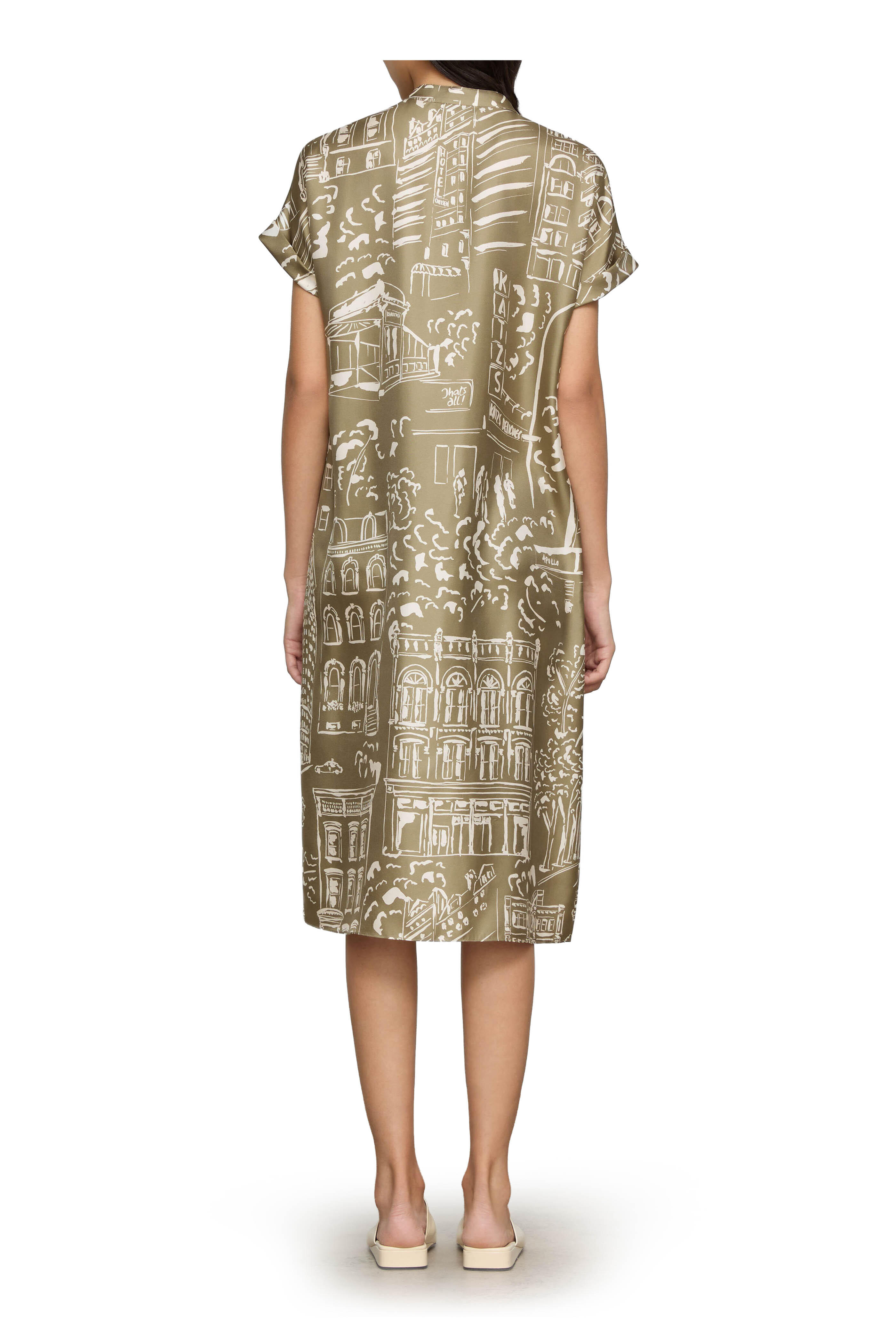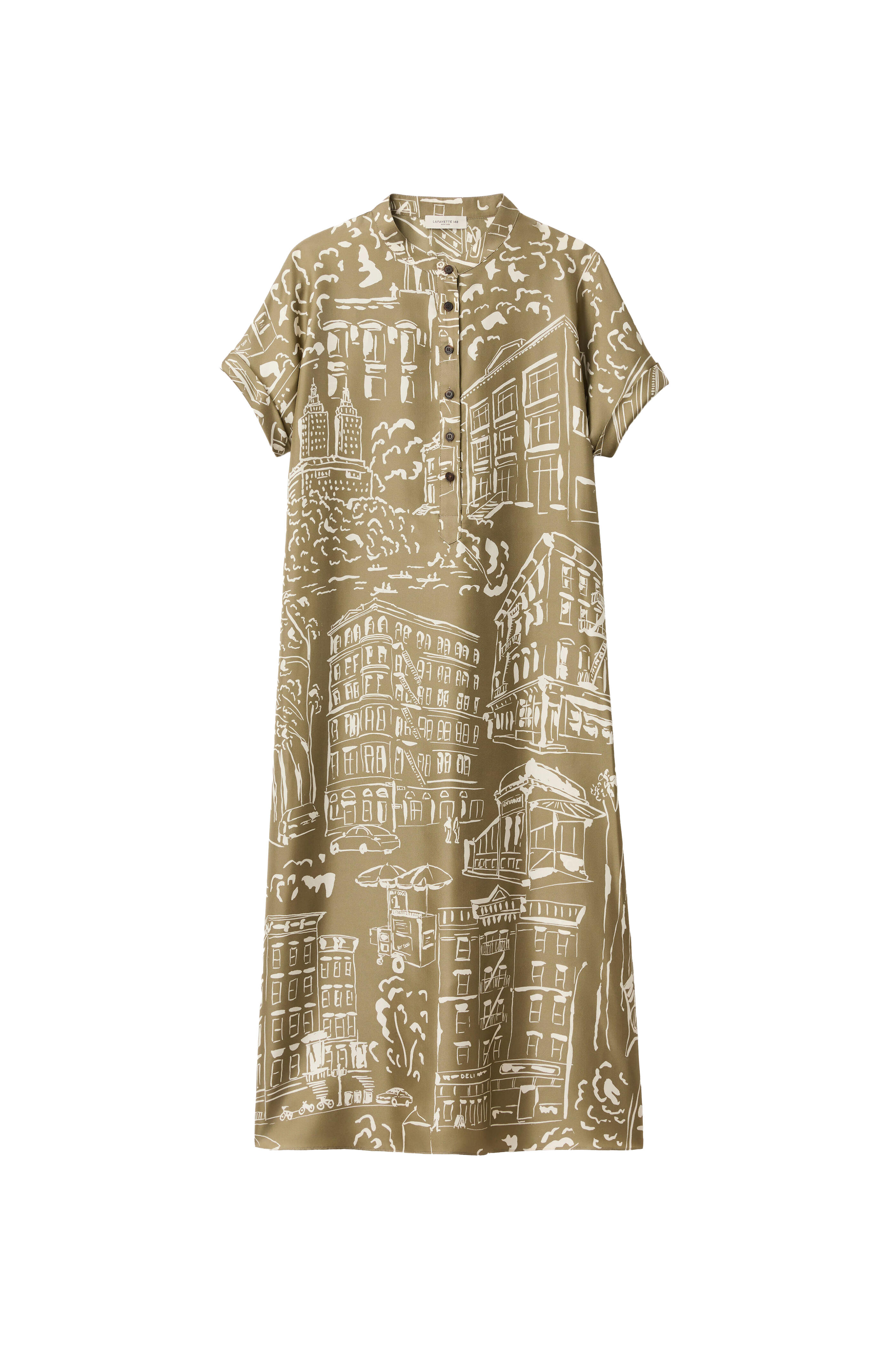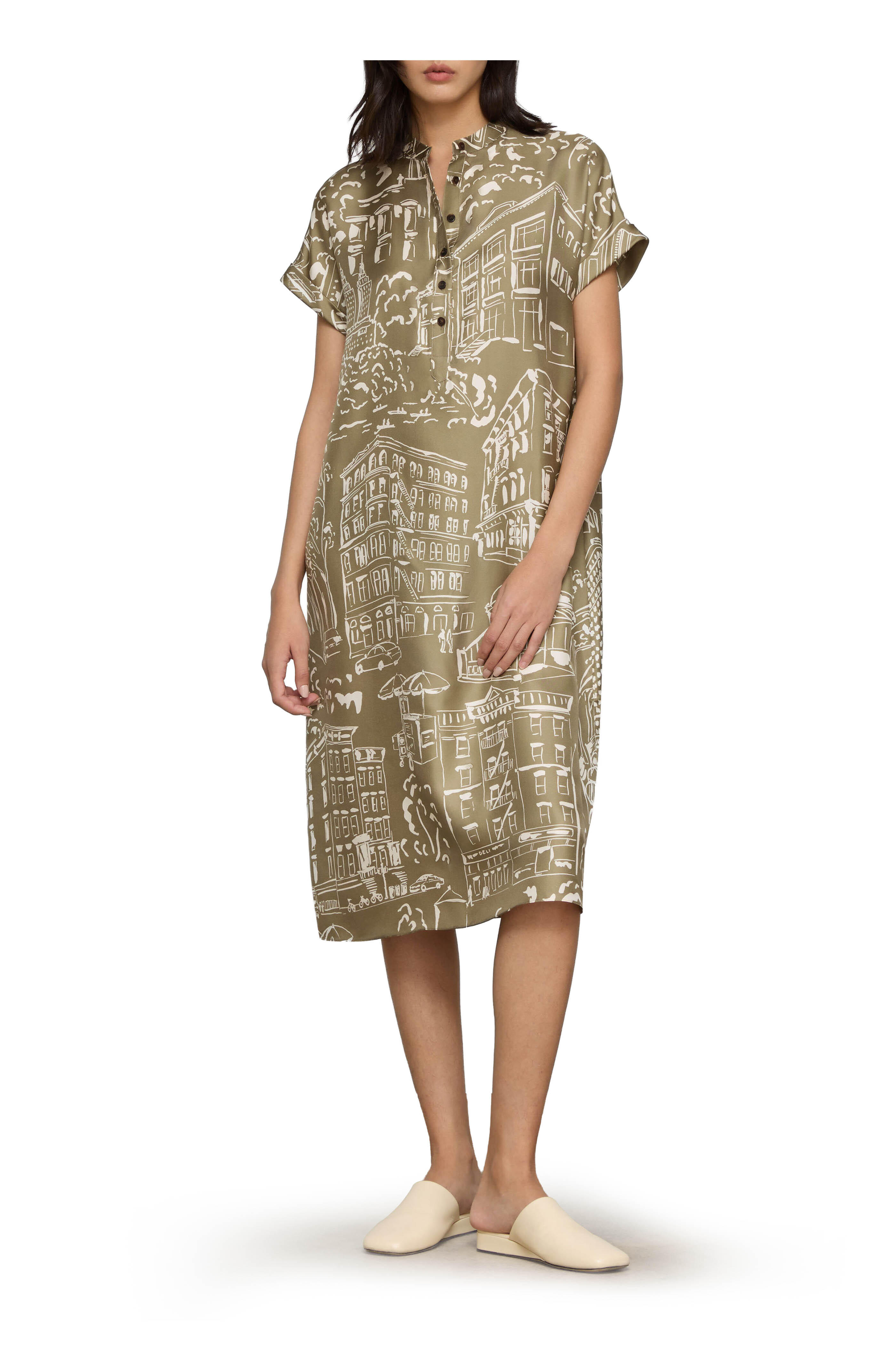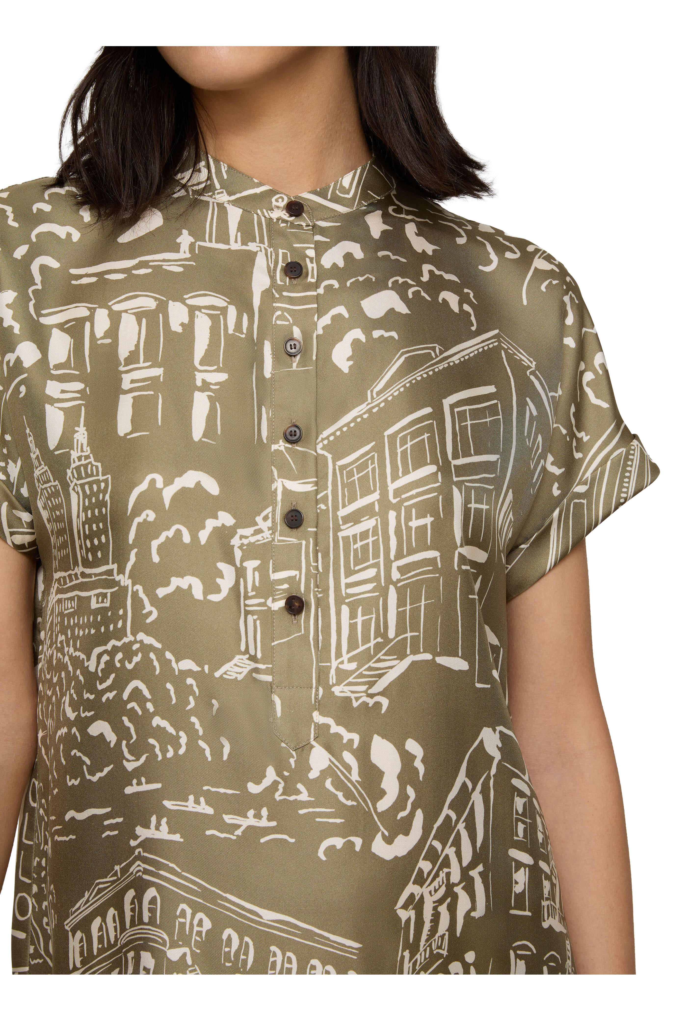 Mandarin collar. Half button placket. Dolman cuffed short sleeves. Imported. Approximately 43" shoulder to hem (measurements taken from size S). 100% silk. Dry clean.