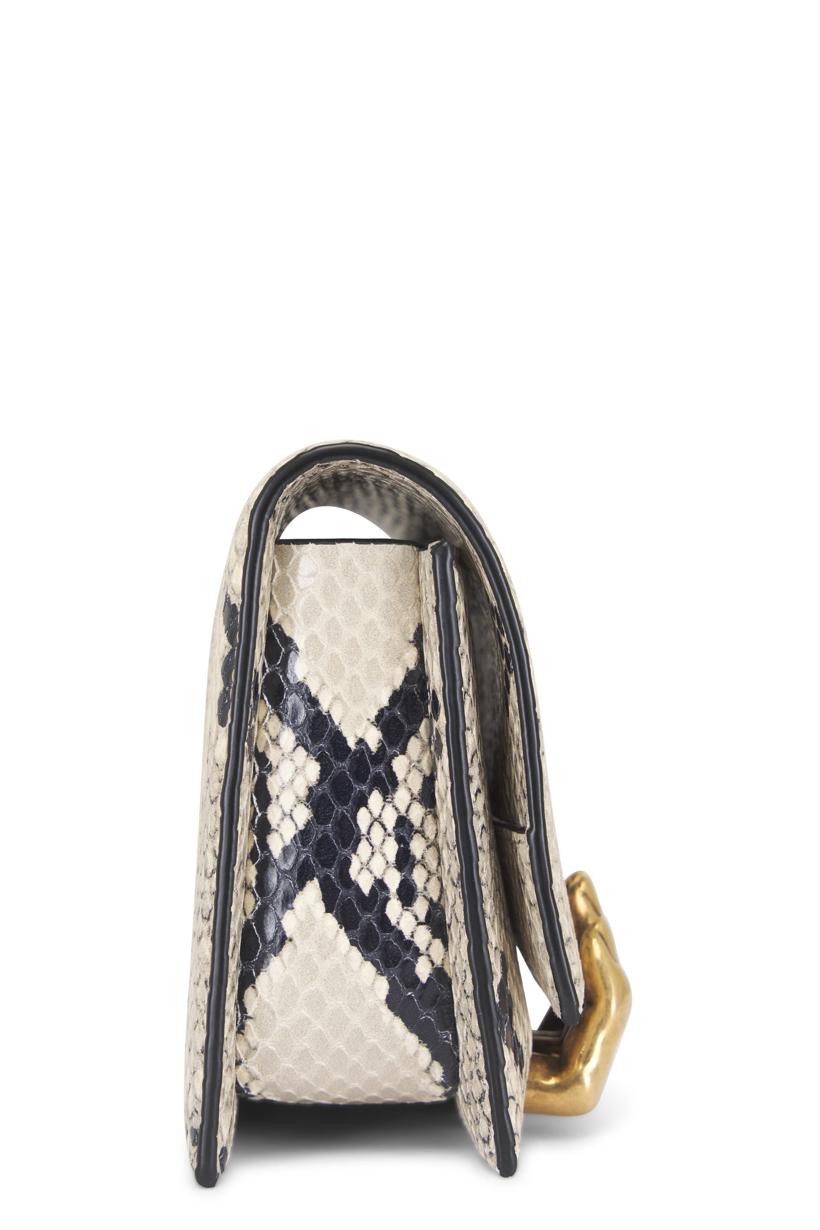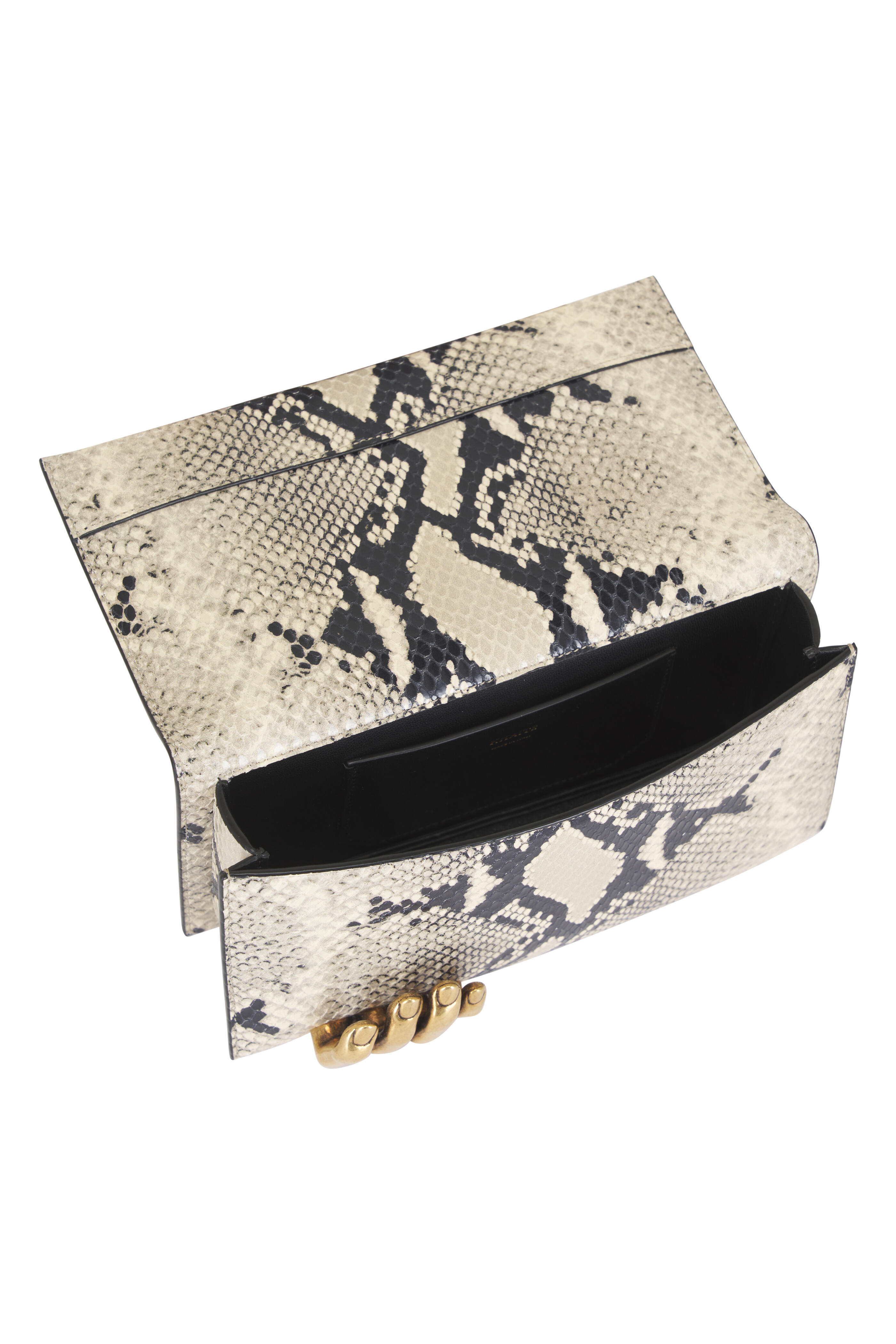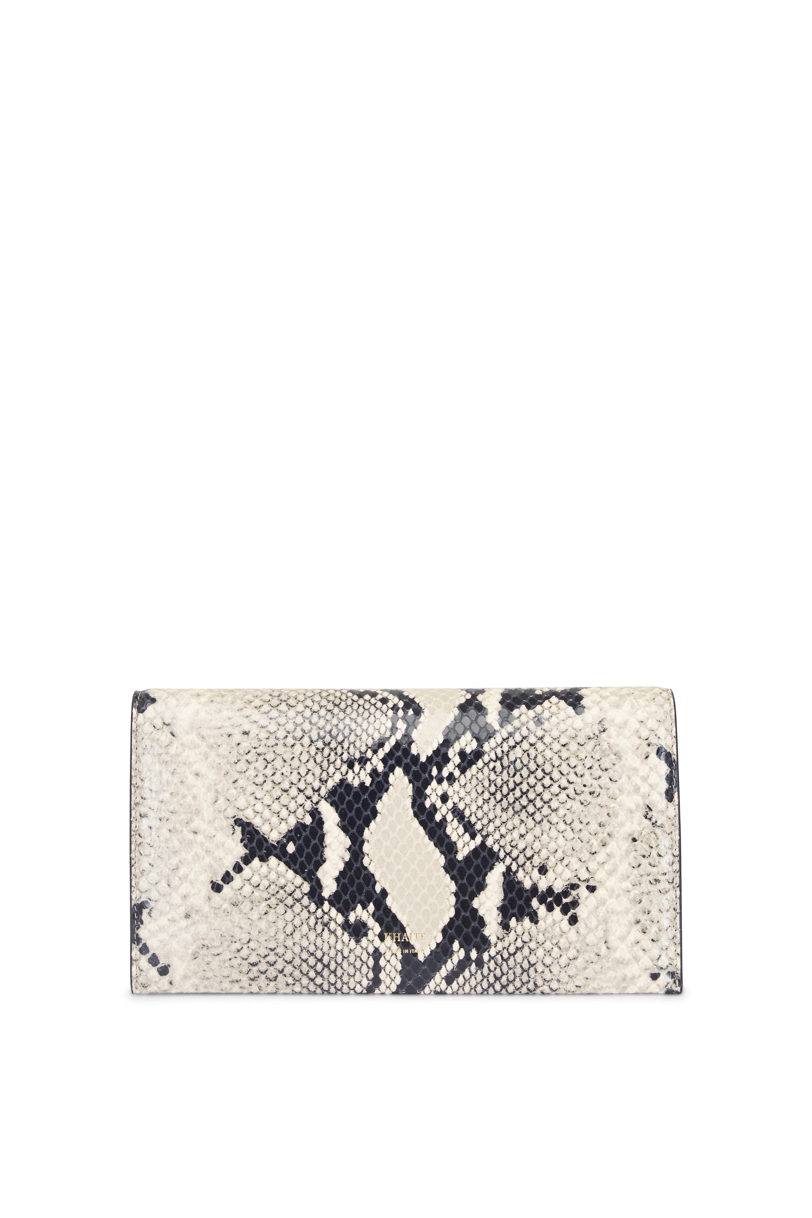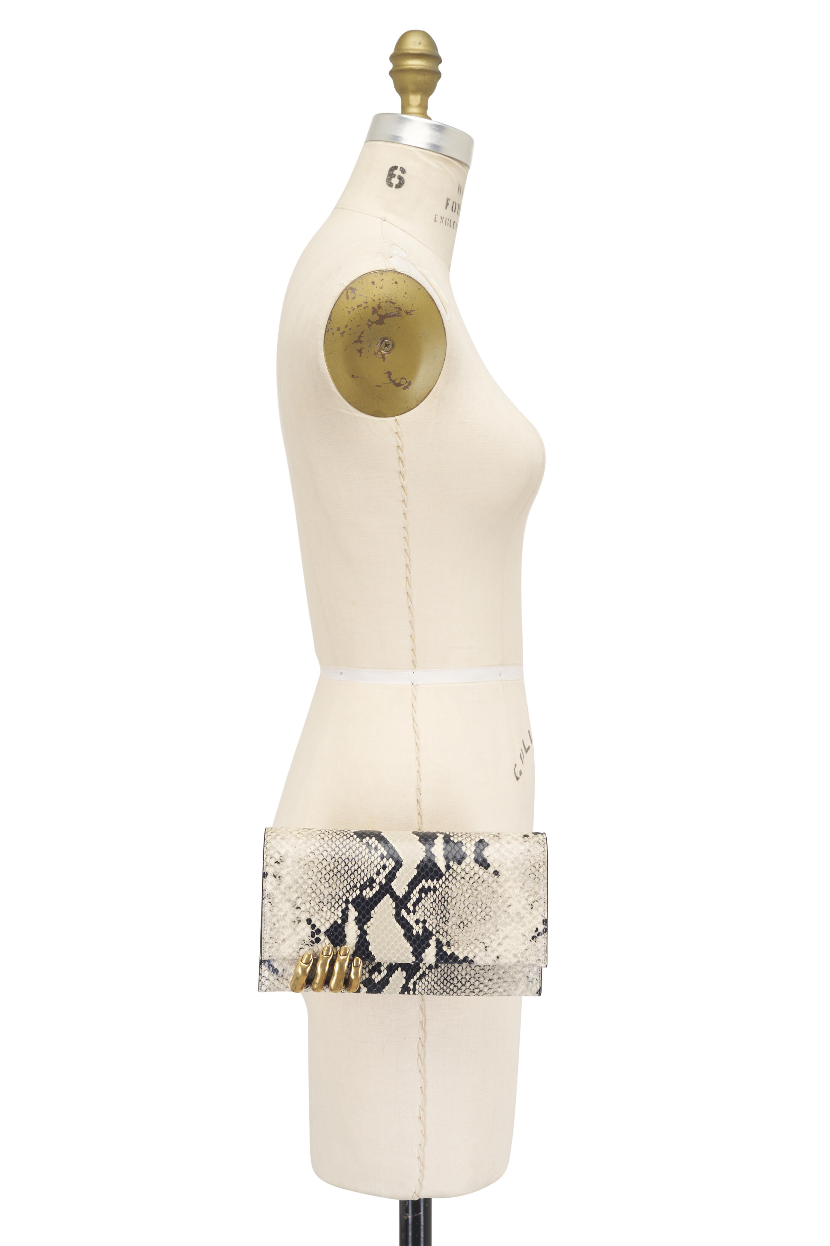 Snake effect leather. Front flap; magnetic closure. Interior card slot. 18k gold plated brass fingers. Made in Italy. Length: 8.5 in. Width: 2.5 in. Height: 4.8 in.