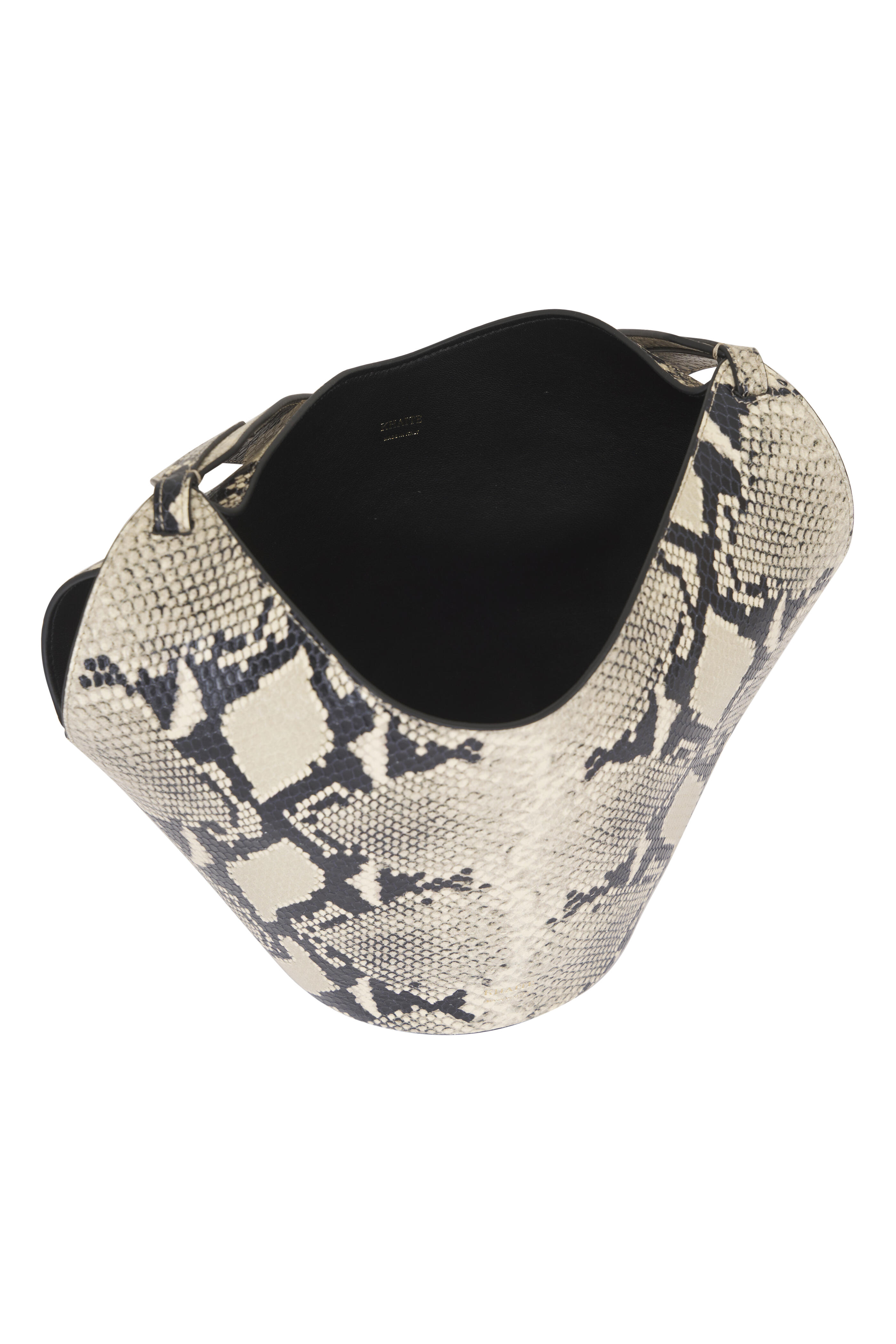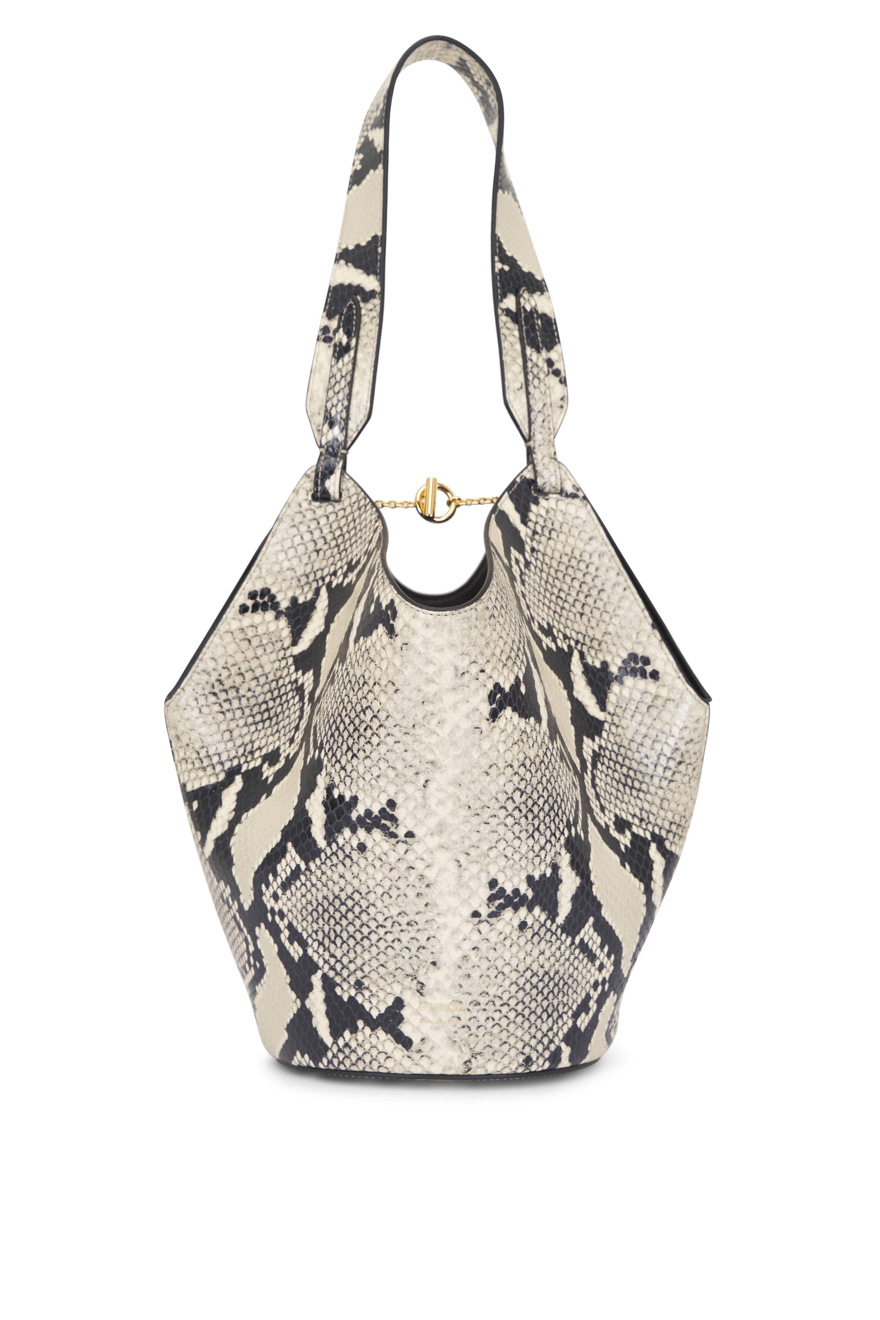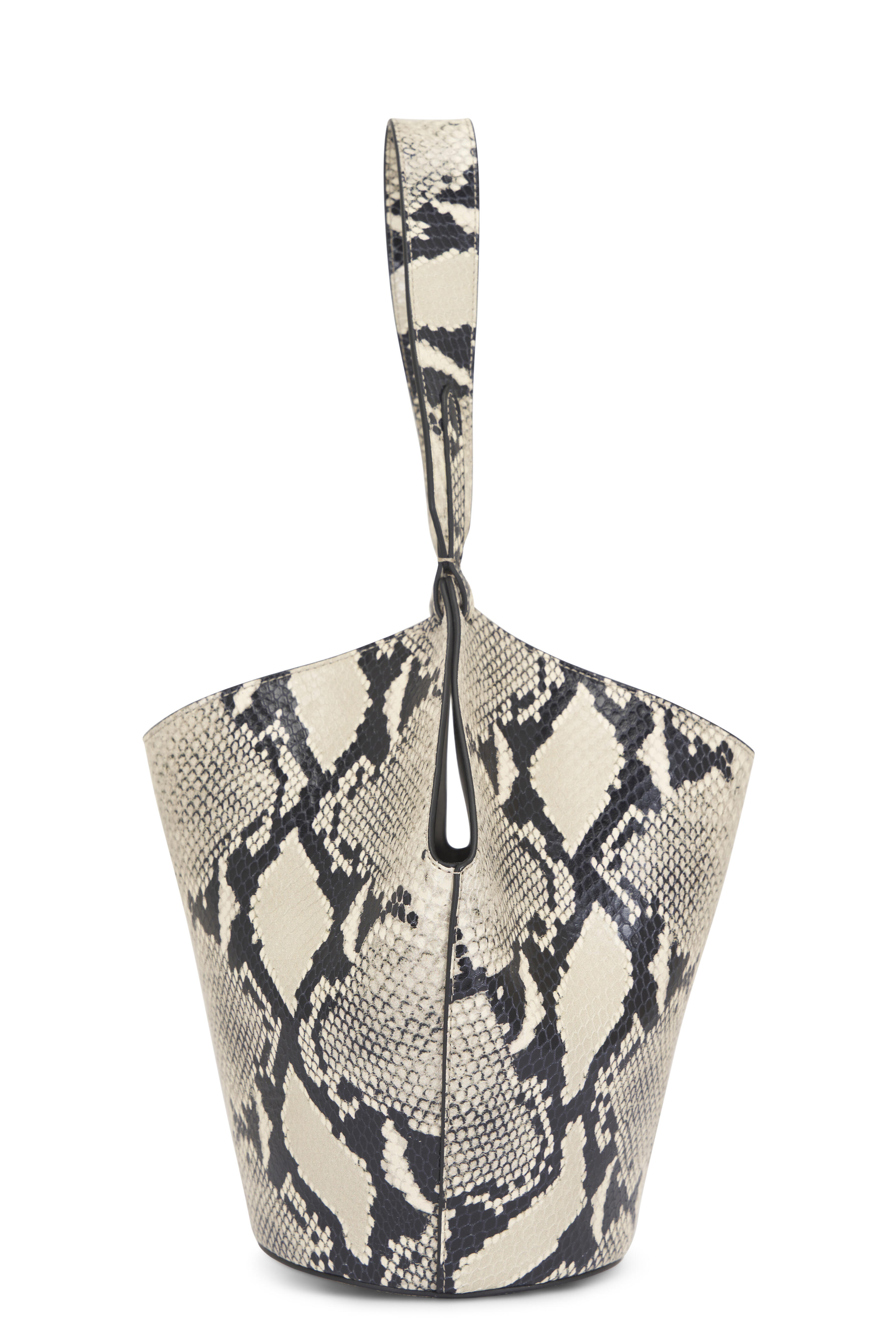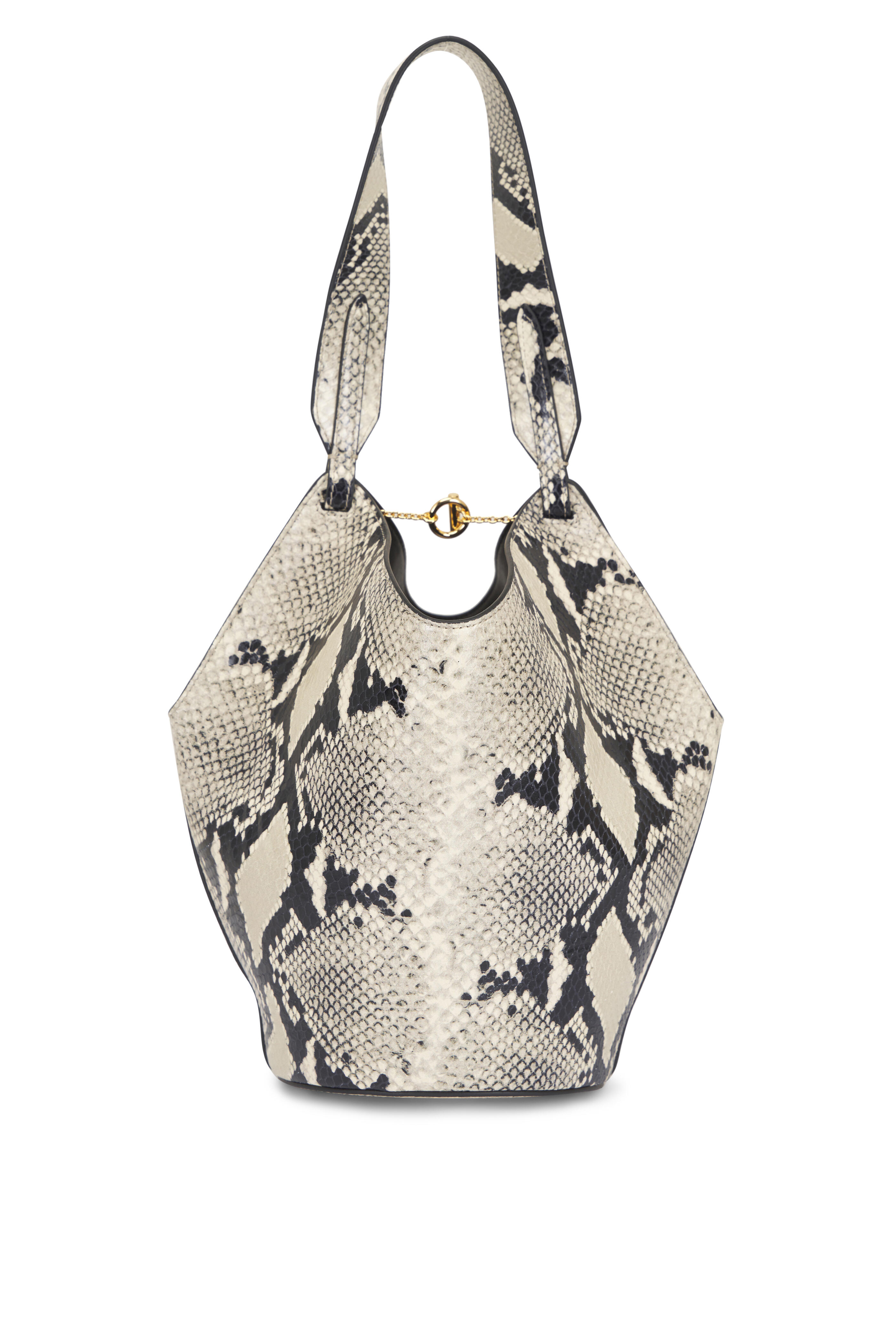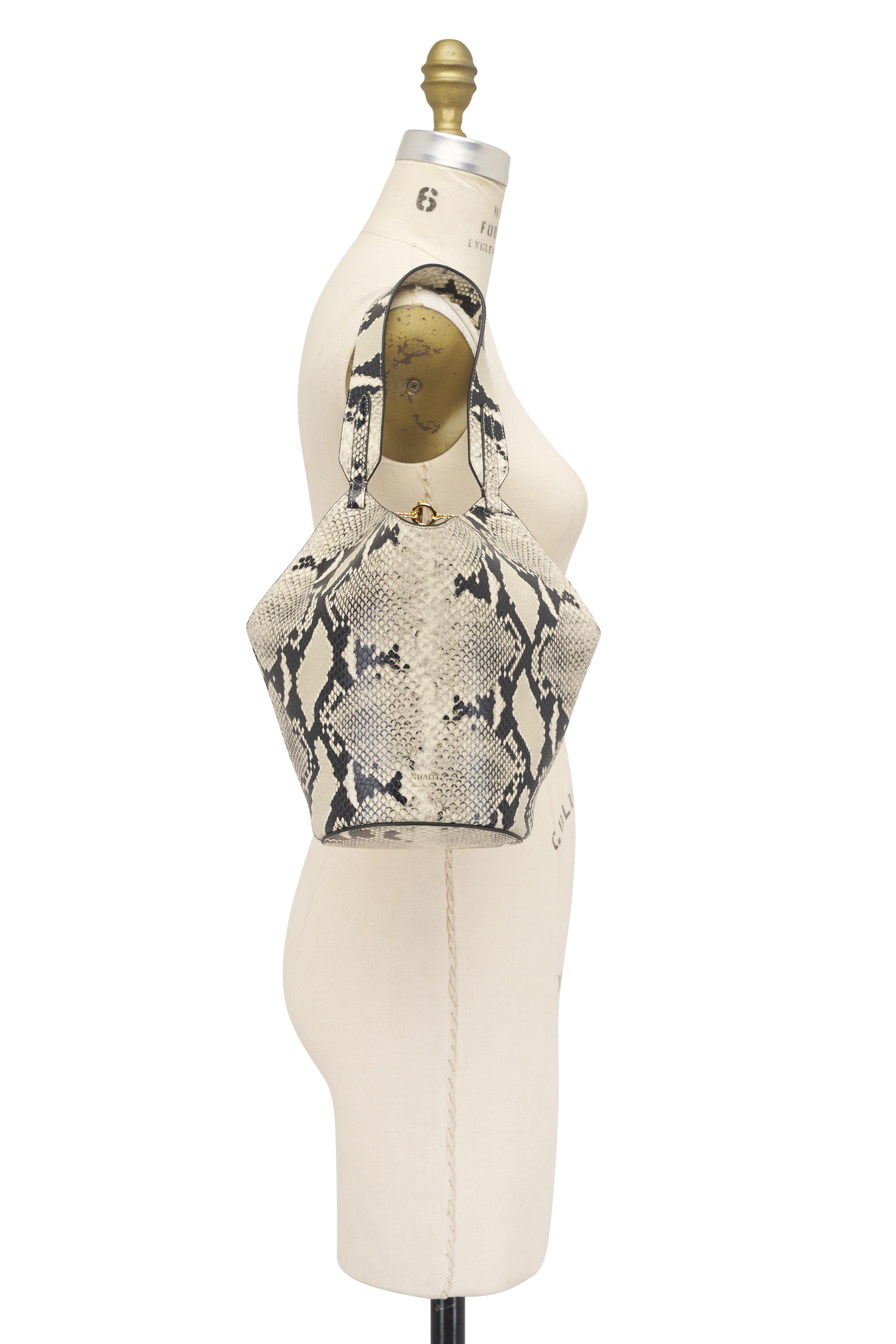Python embossed leather. Single top handle. Gold-tone top toggle closure. Leather lining. Made in Italy. Length: 9 in. Width: 9 in. Height: 10.25 in. Handle Drop: 8 in.
