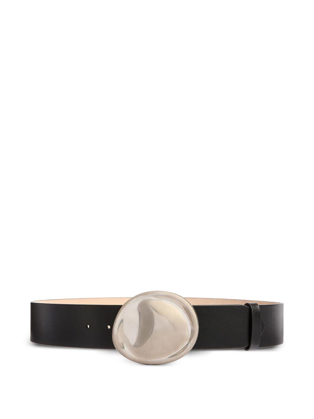 Leather. Sculptural domed buckle. Tapered tip. Single loop keeper. Palladium-plated brass hardware. Made in Italy. Width: 35mm.