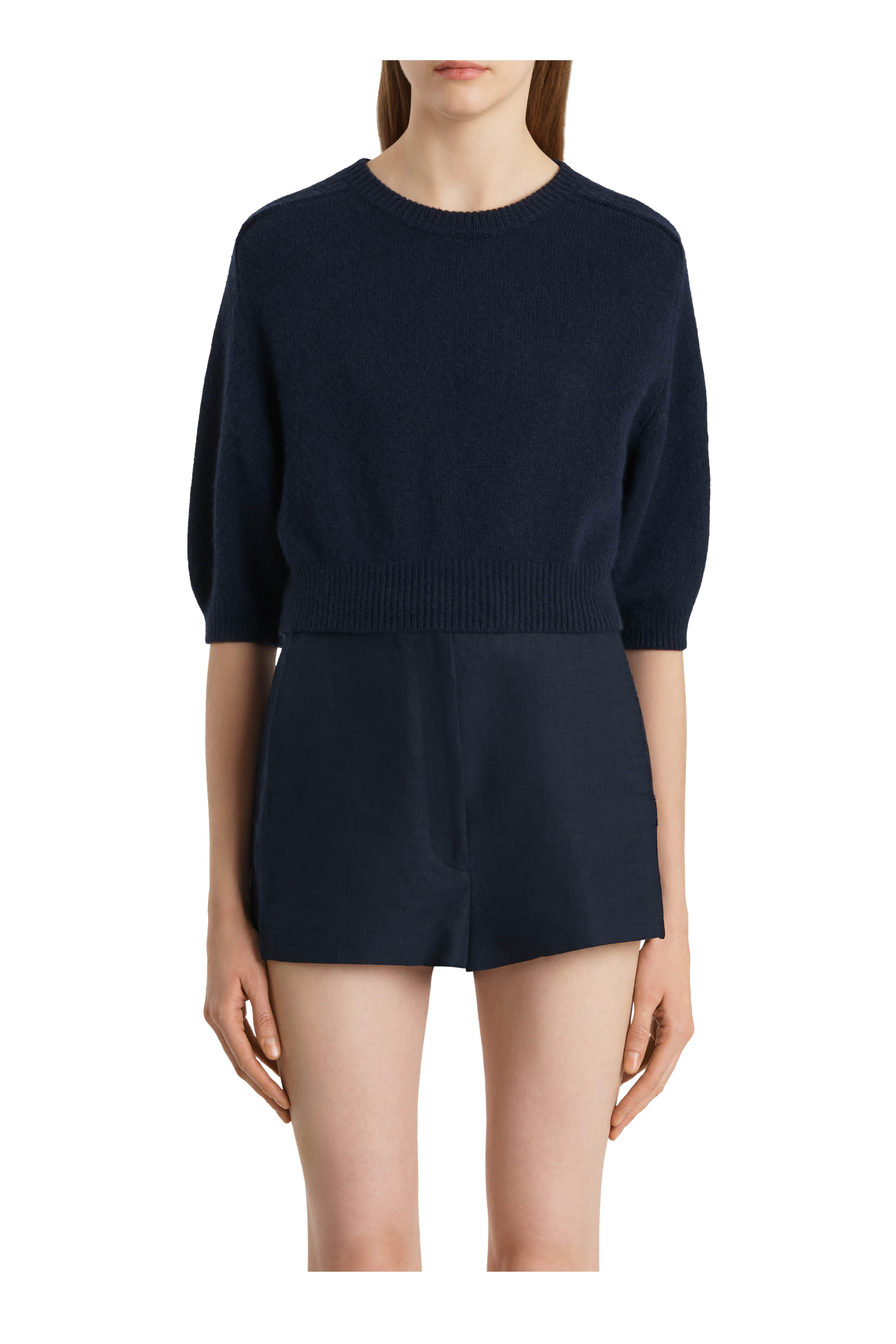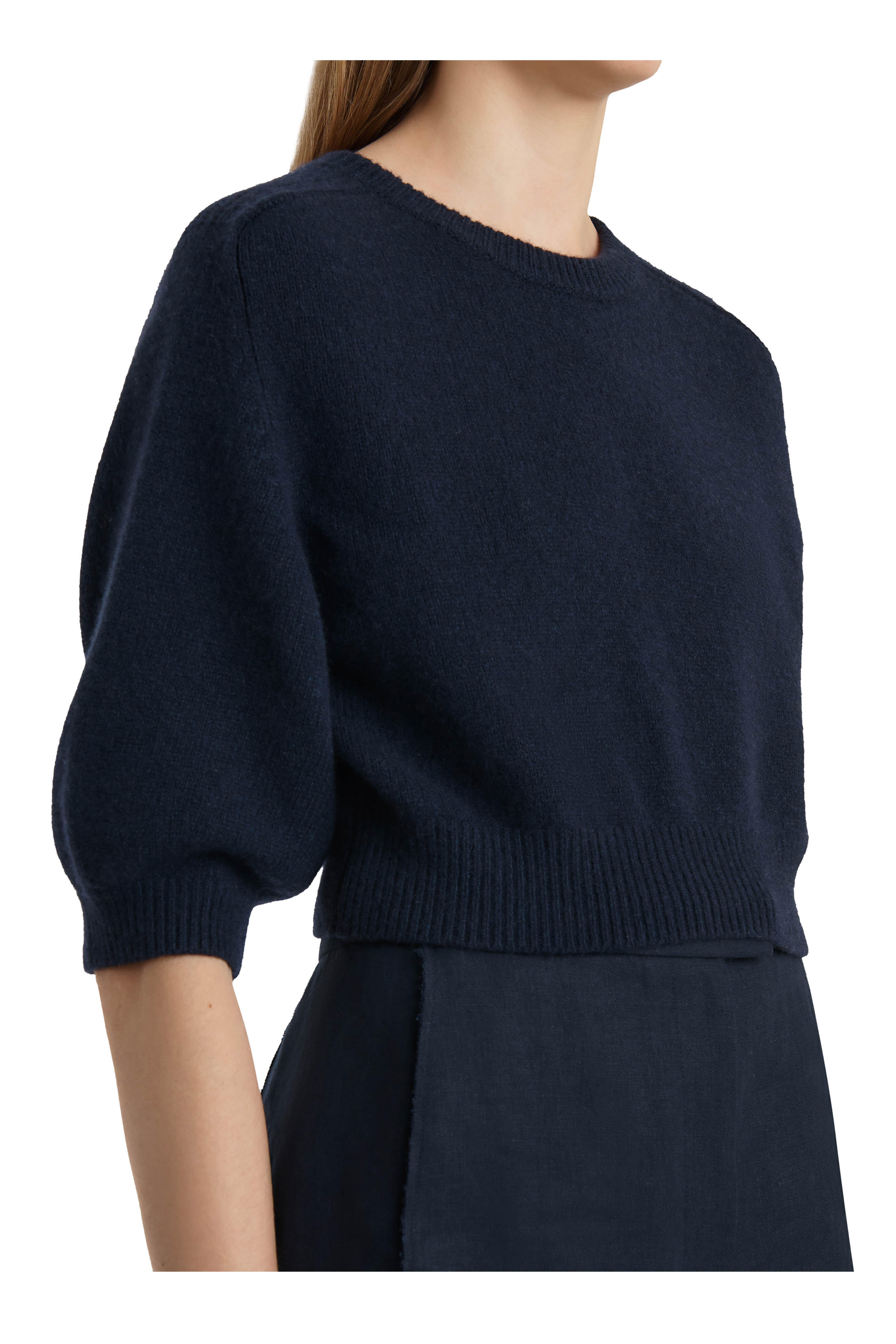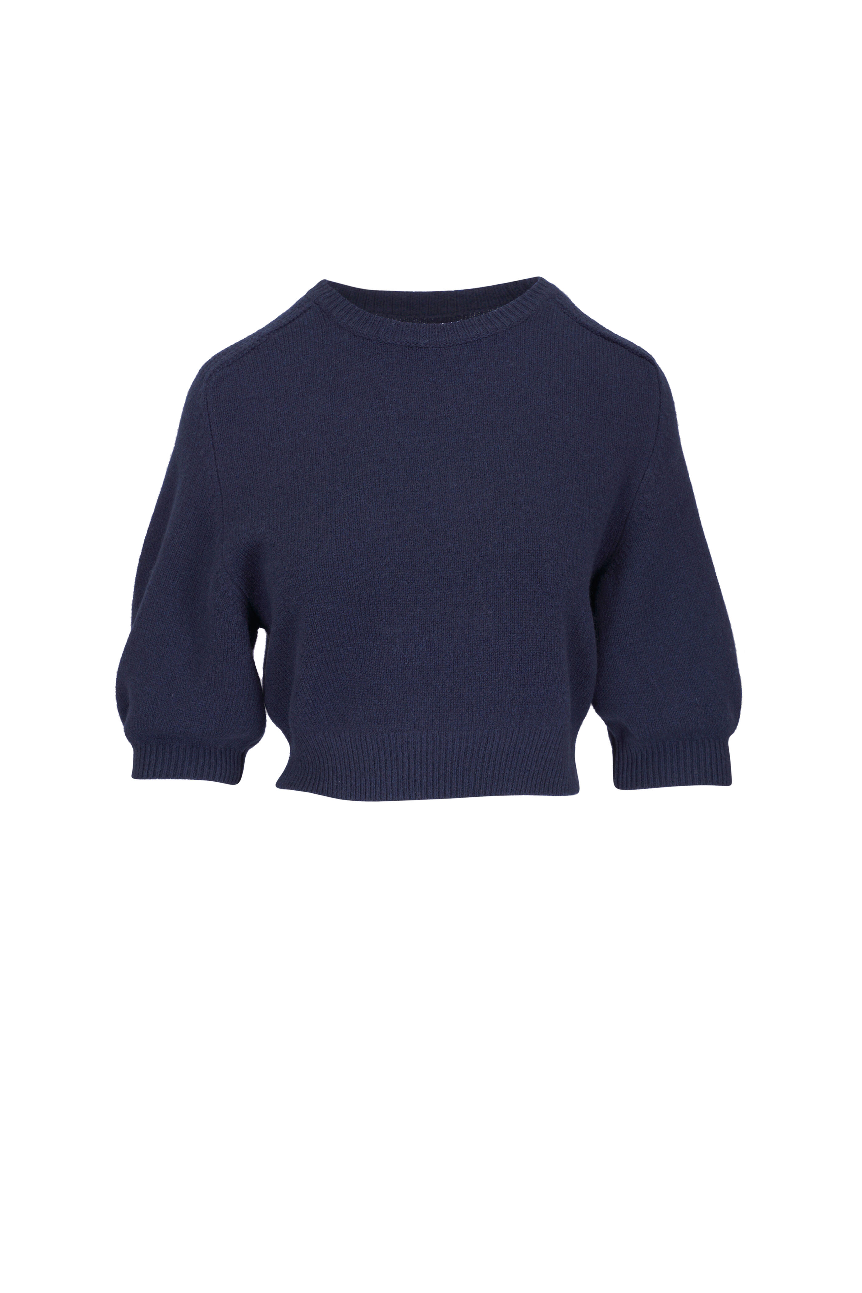 Crew neckline. Ribbed trims. Imported. 16" length (size XS). 60% wool, 33% cashmere, 7% elastane. Dry clean.
