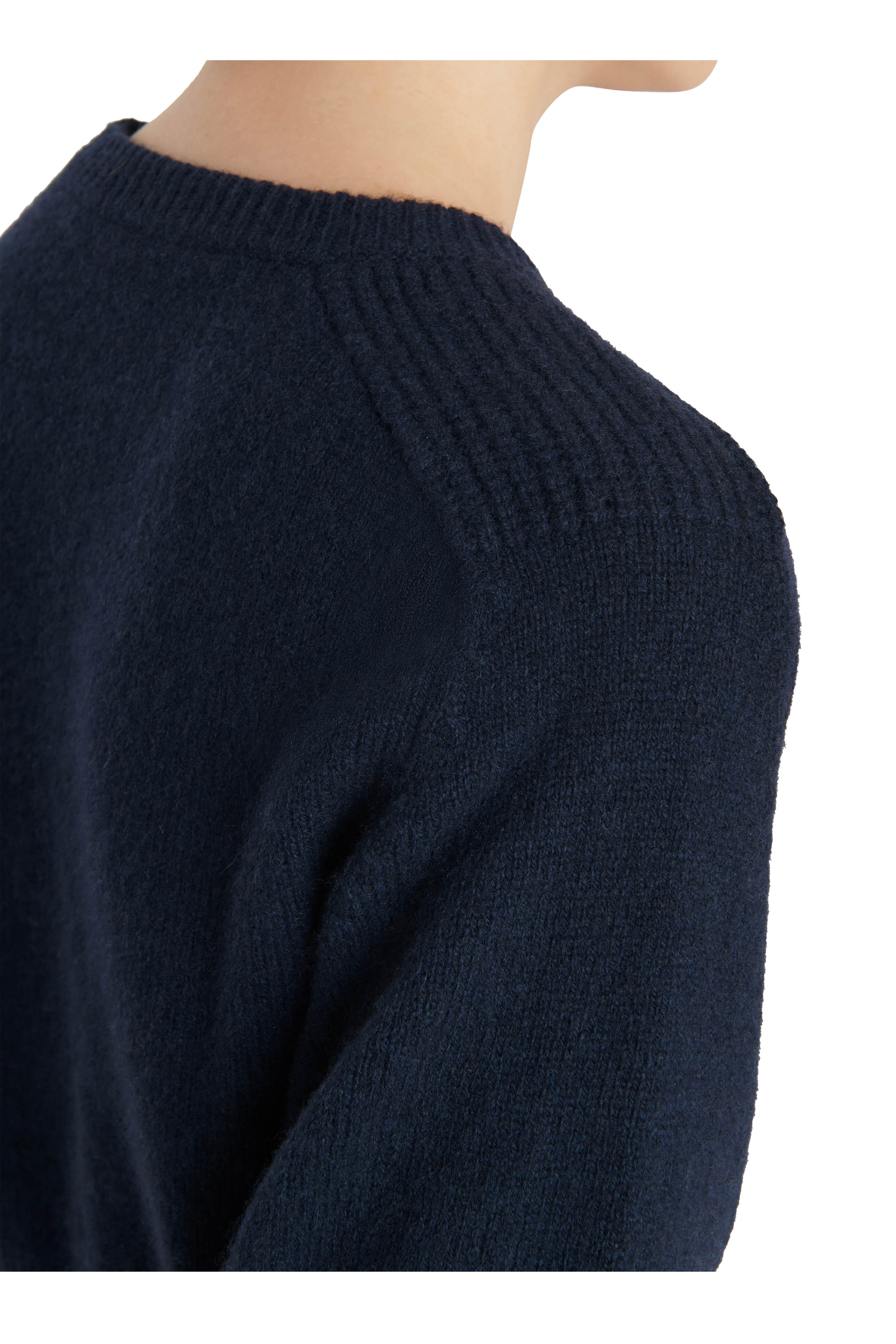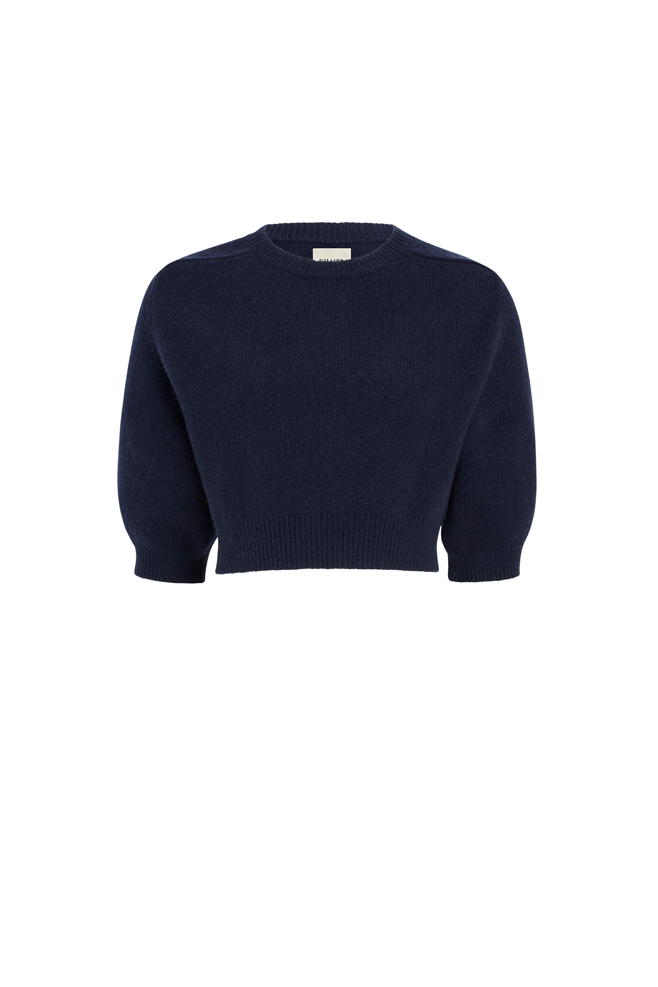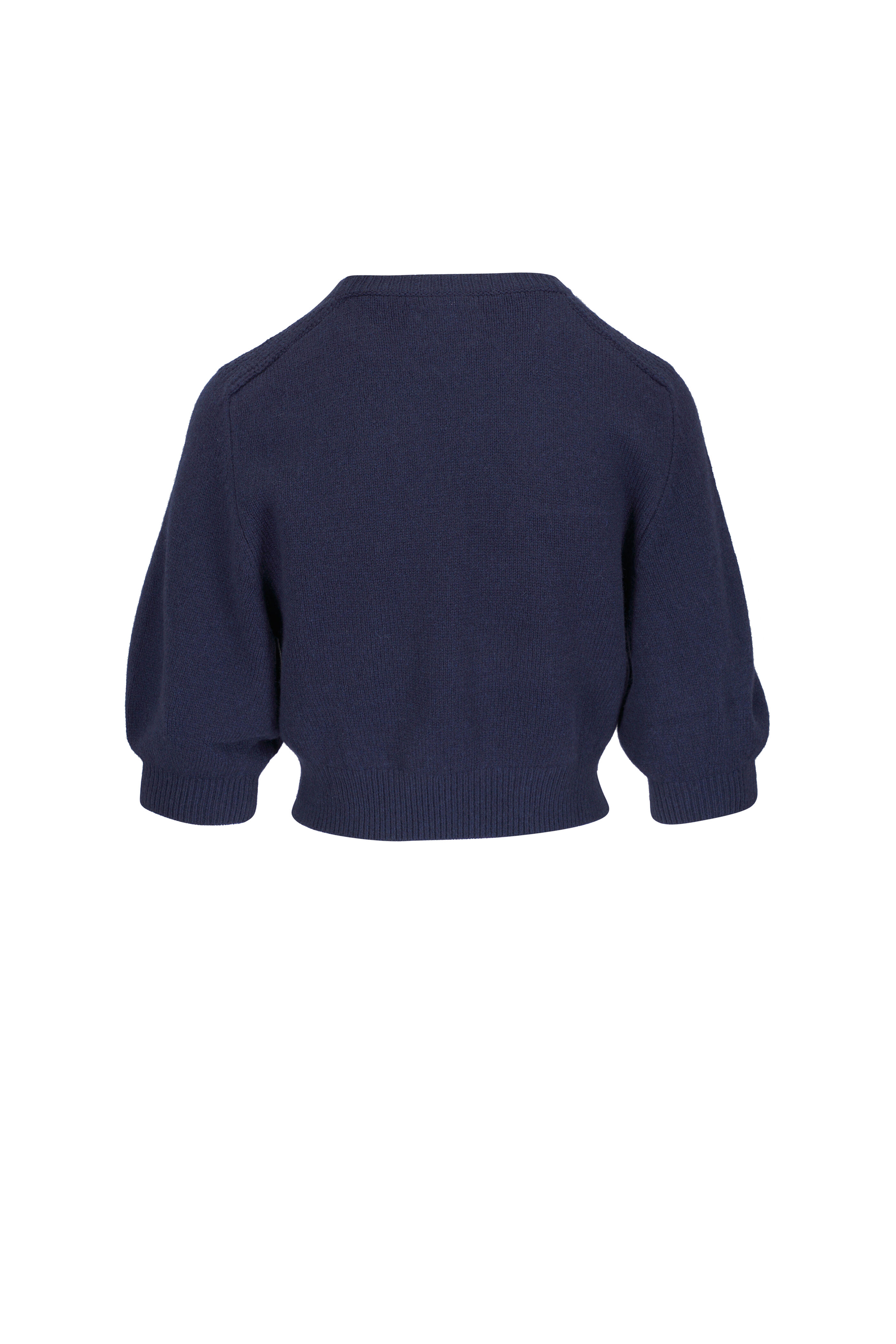 Crew neckline. Ribbed trims. Imported. 16" length (size XS). 60% wool, 33% cashmere, 7% elastane. Dry clean.