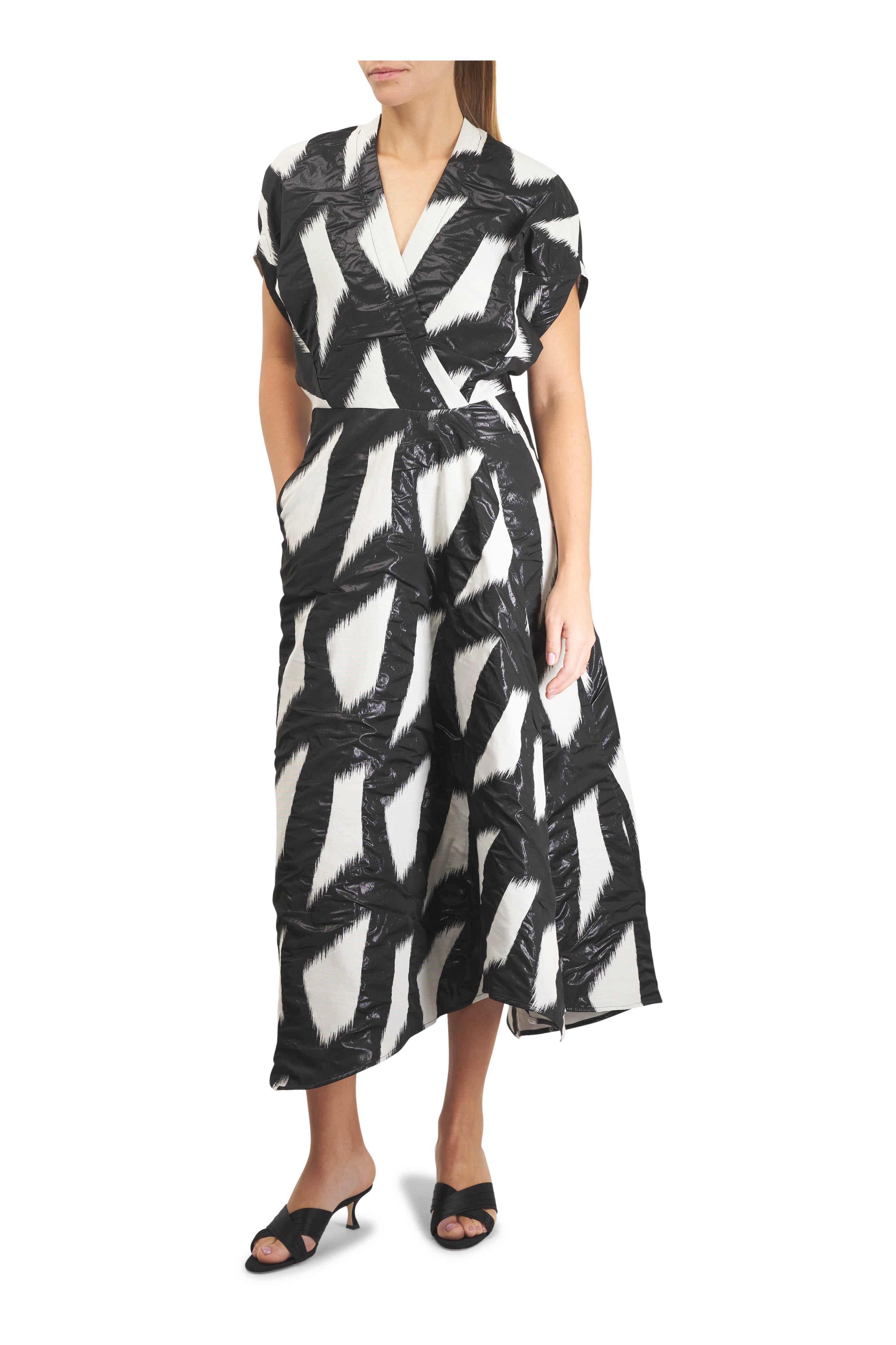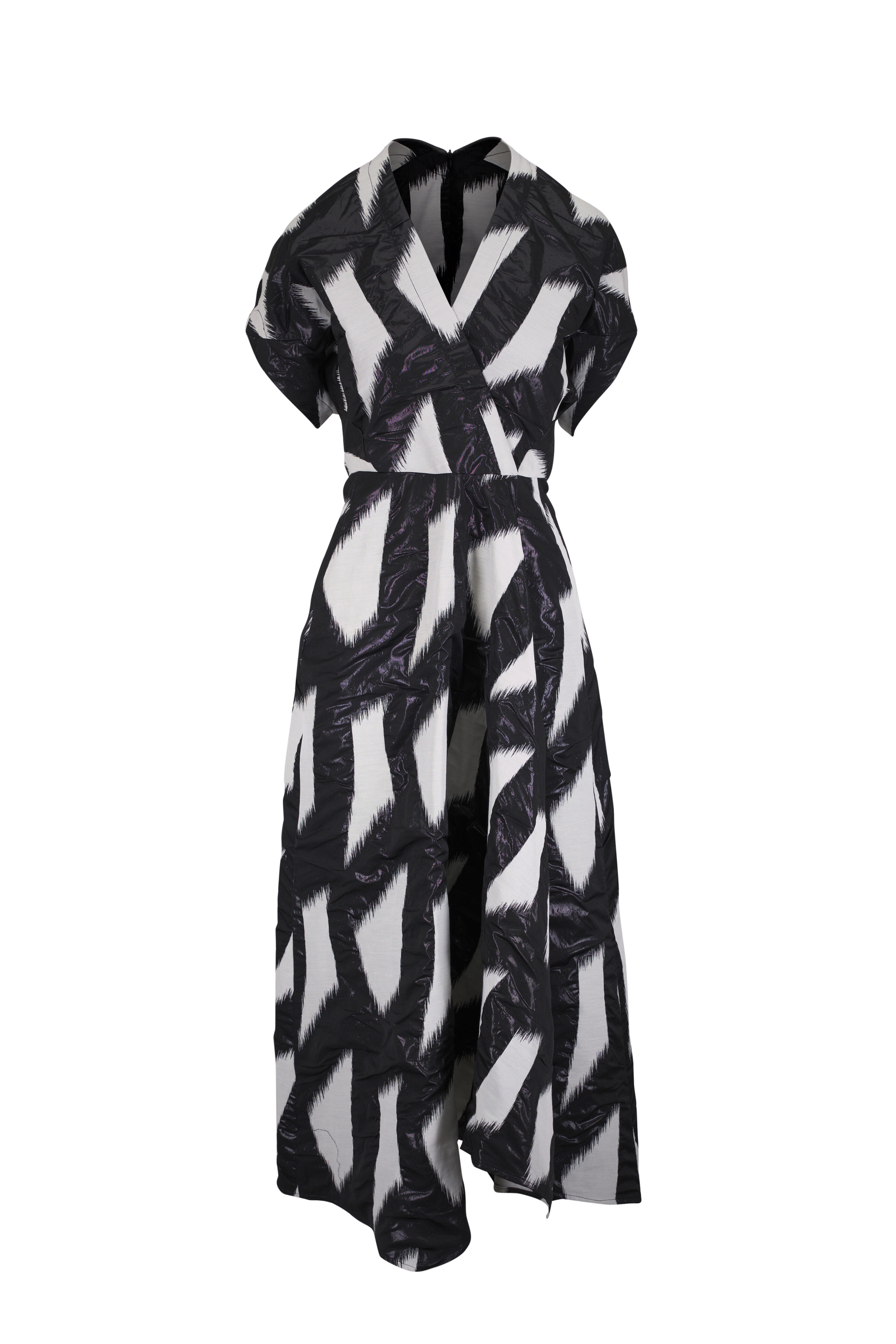 V-neckline. Concealed back zip closure. Draped sleeves. Asymmetric skirt. Front wrap-effect. Seamed waistline. Made in the USA. 50% recycled polyester, 39% organic cotton, 11% metal fibers. Dry clean.