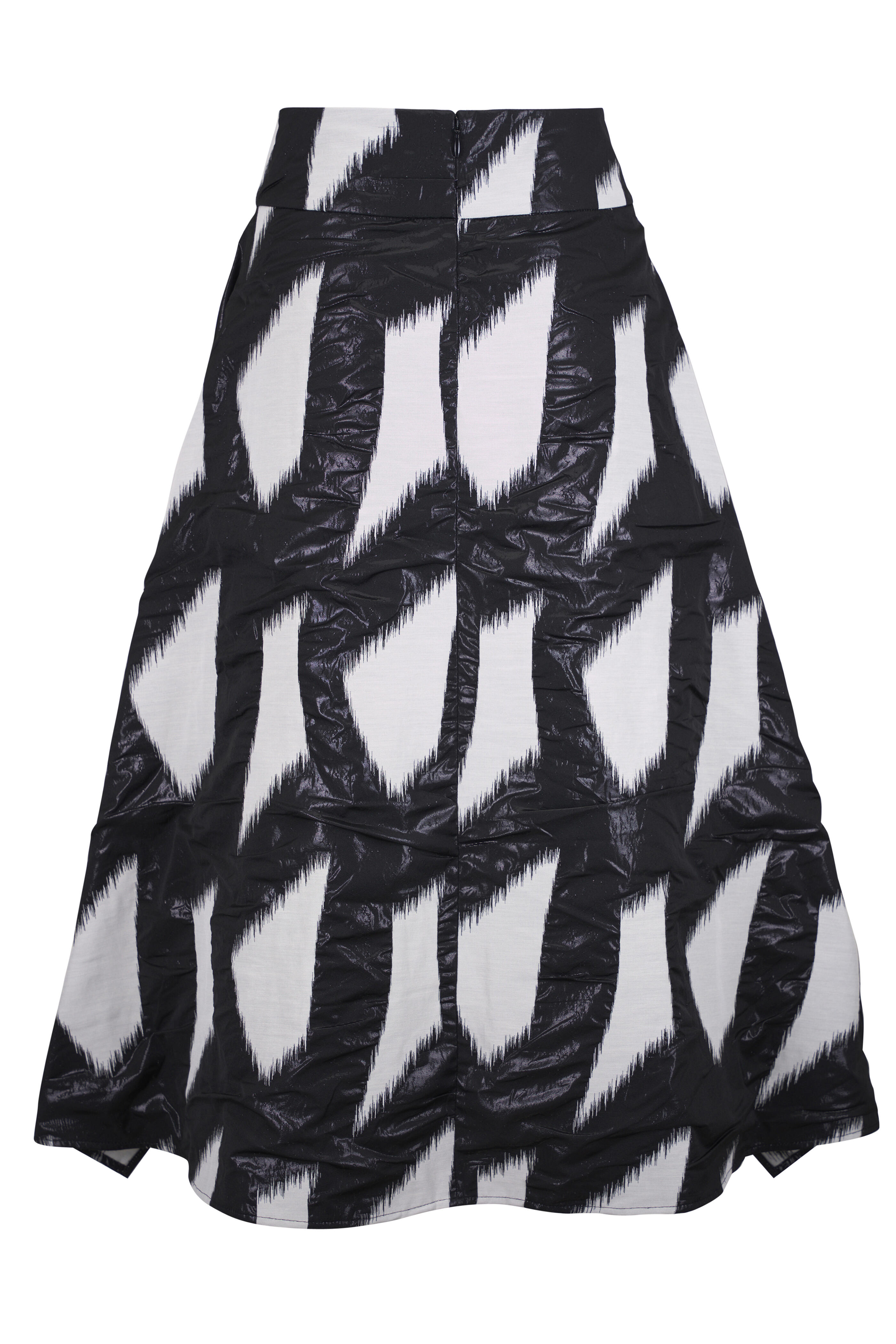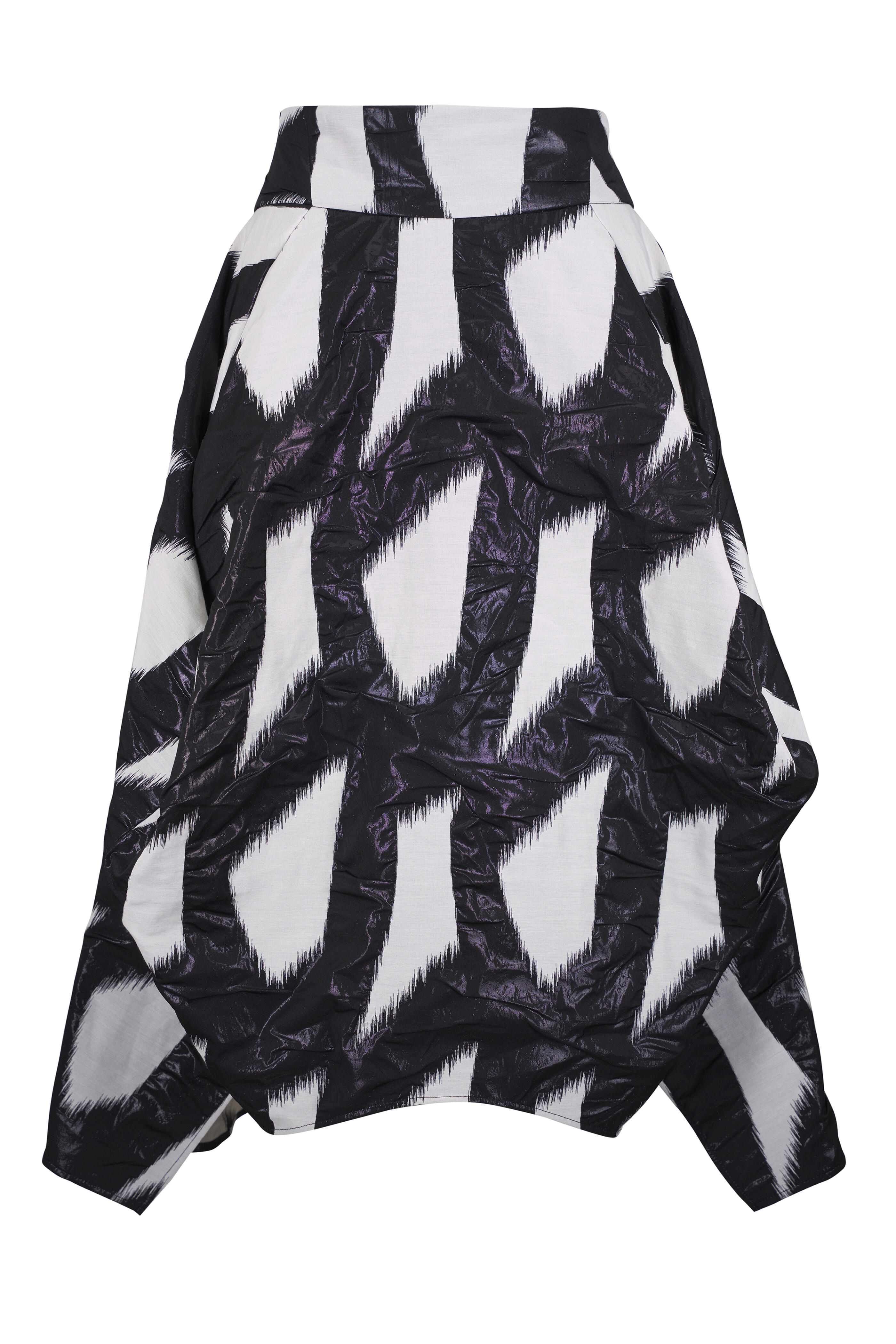 High waisted; seamed. Hidden front pockets. Back zip and hook closure. Geometric folded silhouette. Imported. 50% recycled polyester, 39% organic cotton, 11% metal fibers. Dry clean only.