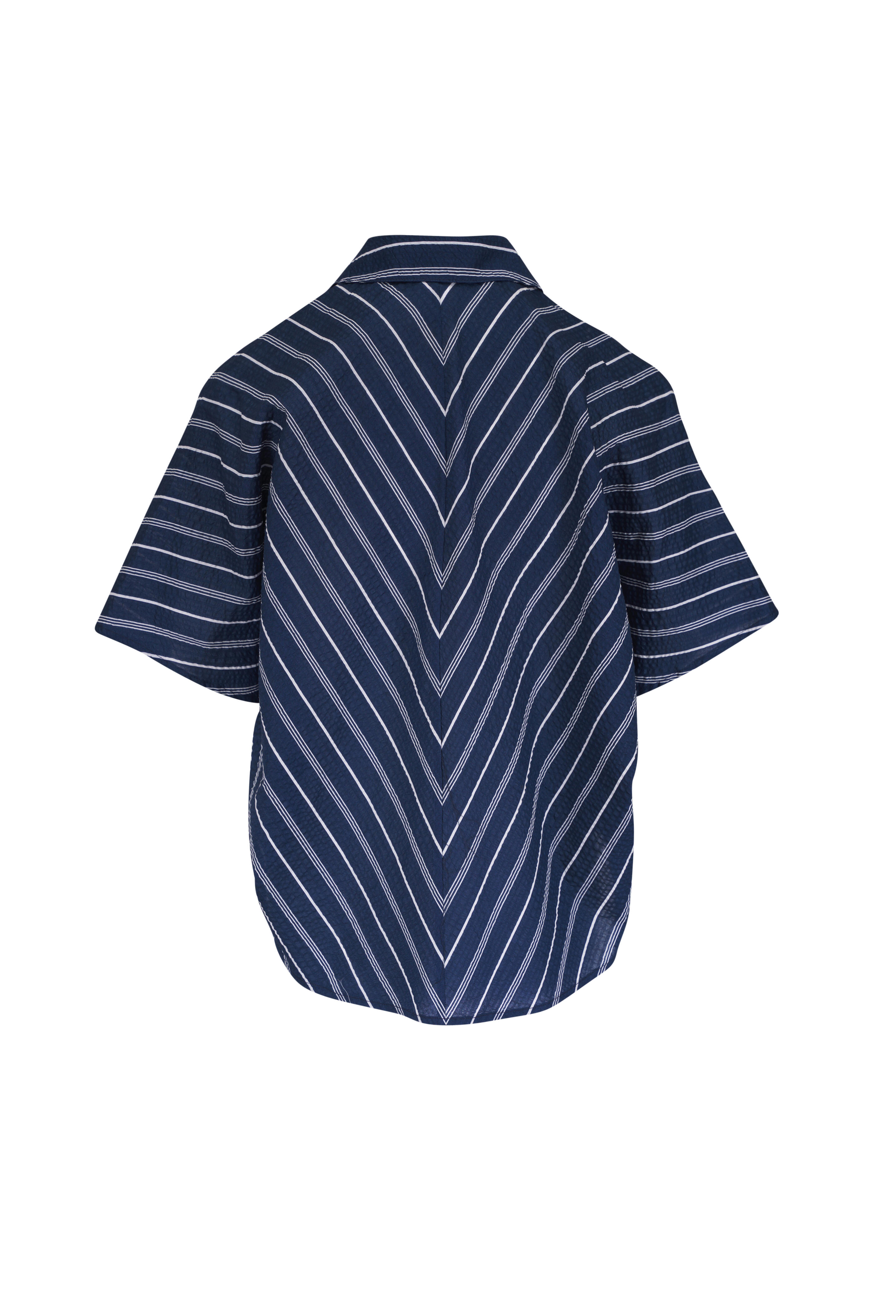Spread collar. Concealed front button placket. Made in the USA. 100% cotton. Hand wash.