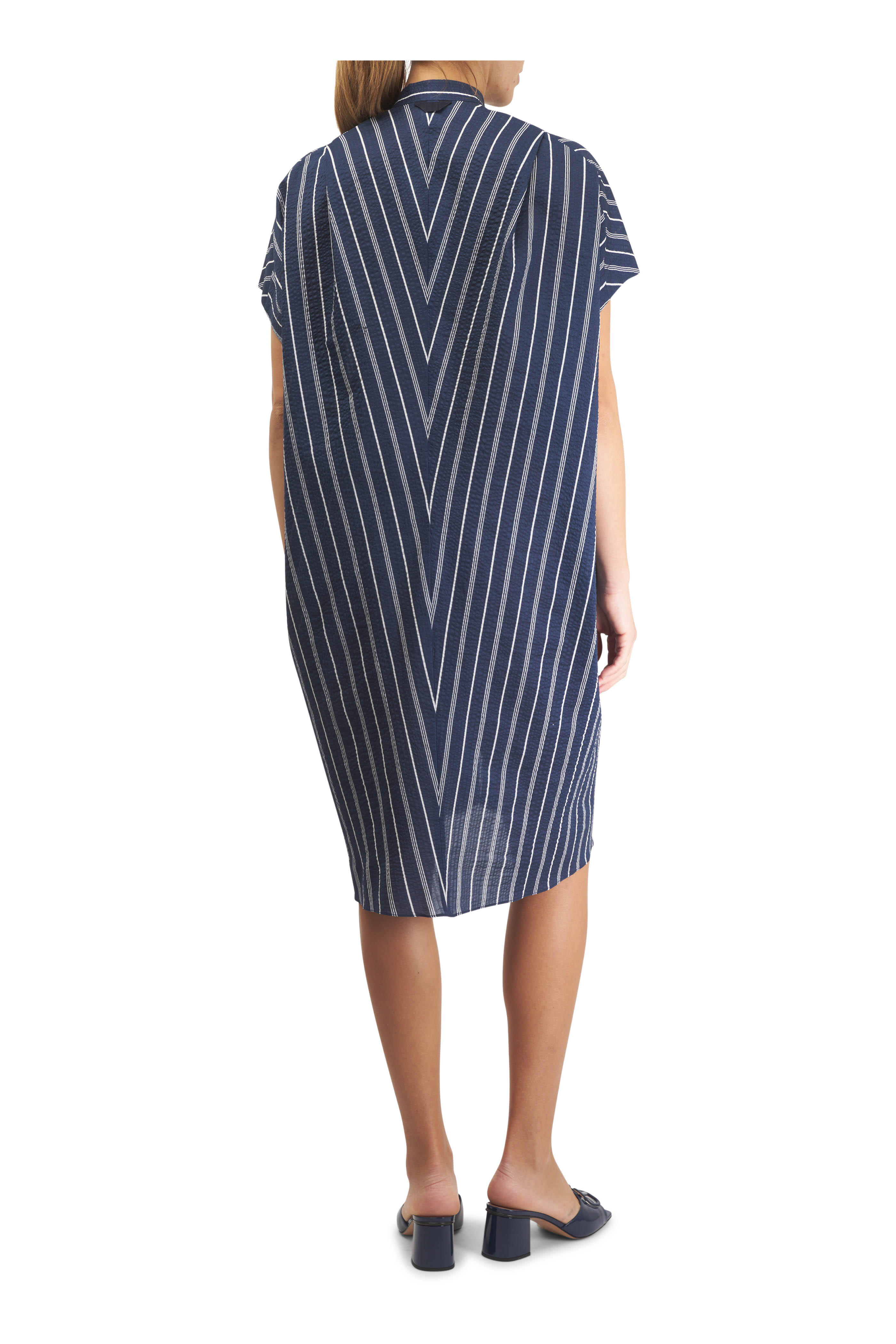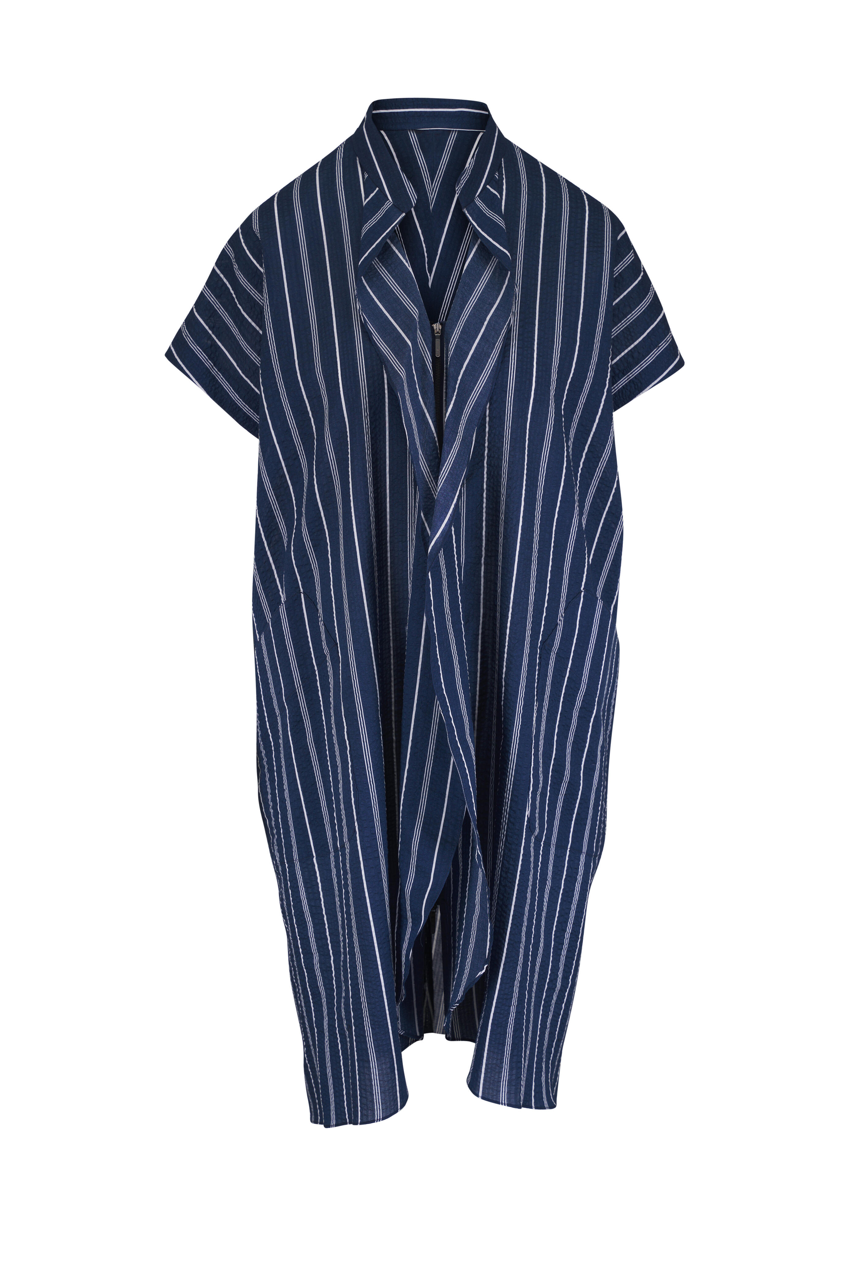Banded collar; v-neckline. Front zip closure. Lower patch pockets. Ruffle details. Made in the USA. 39" shoulder to hem. 100% cotton. Hand wash.