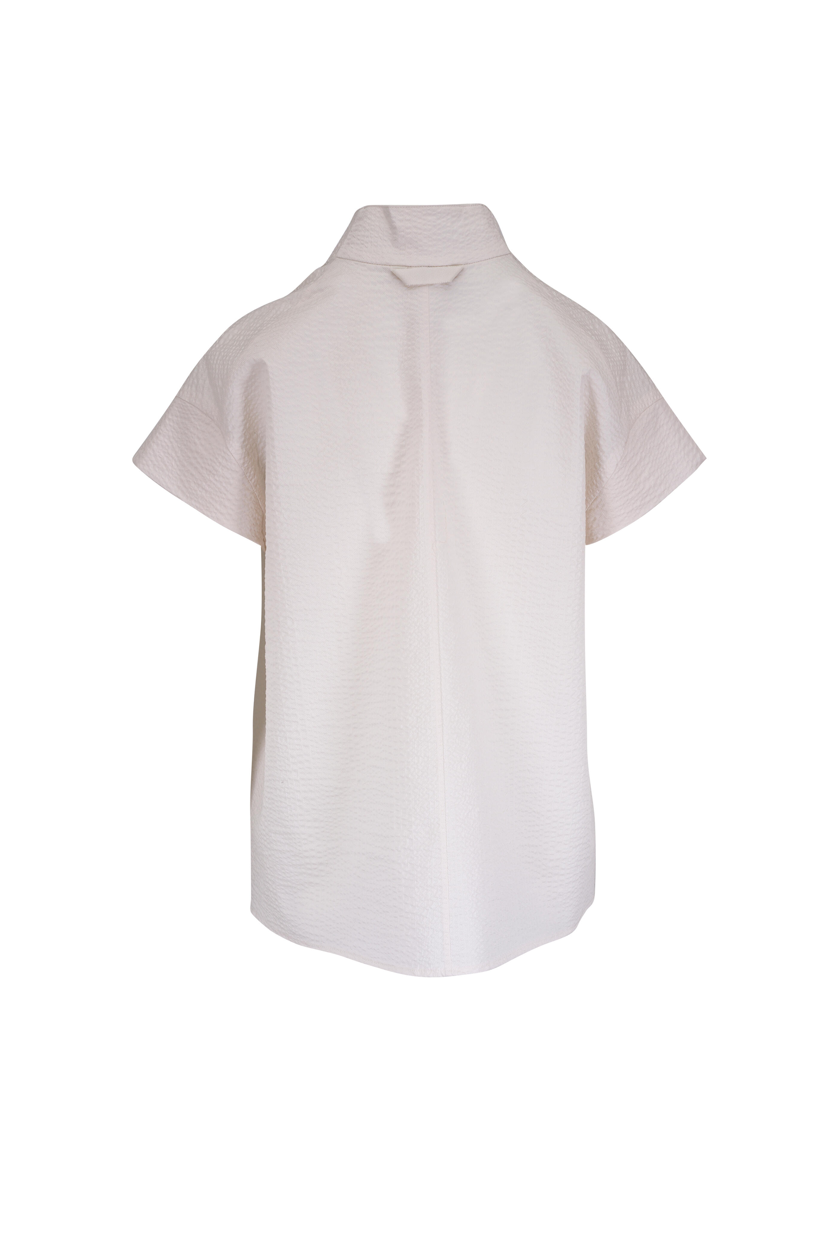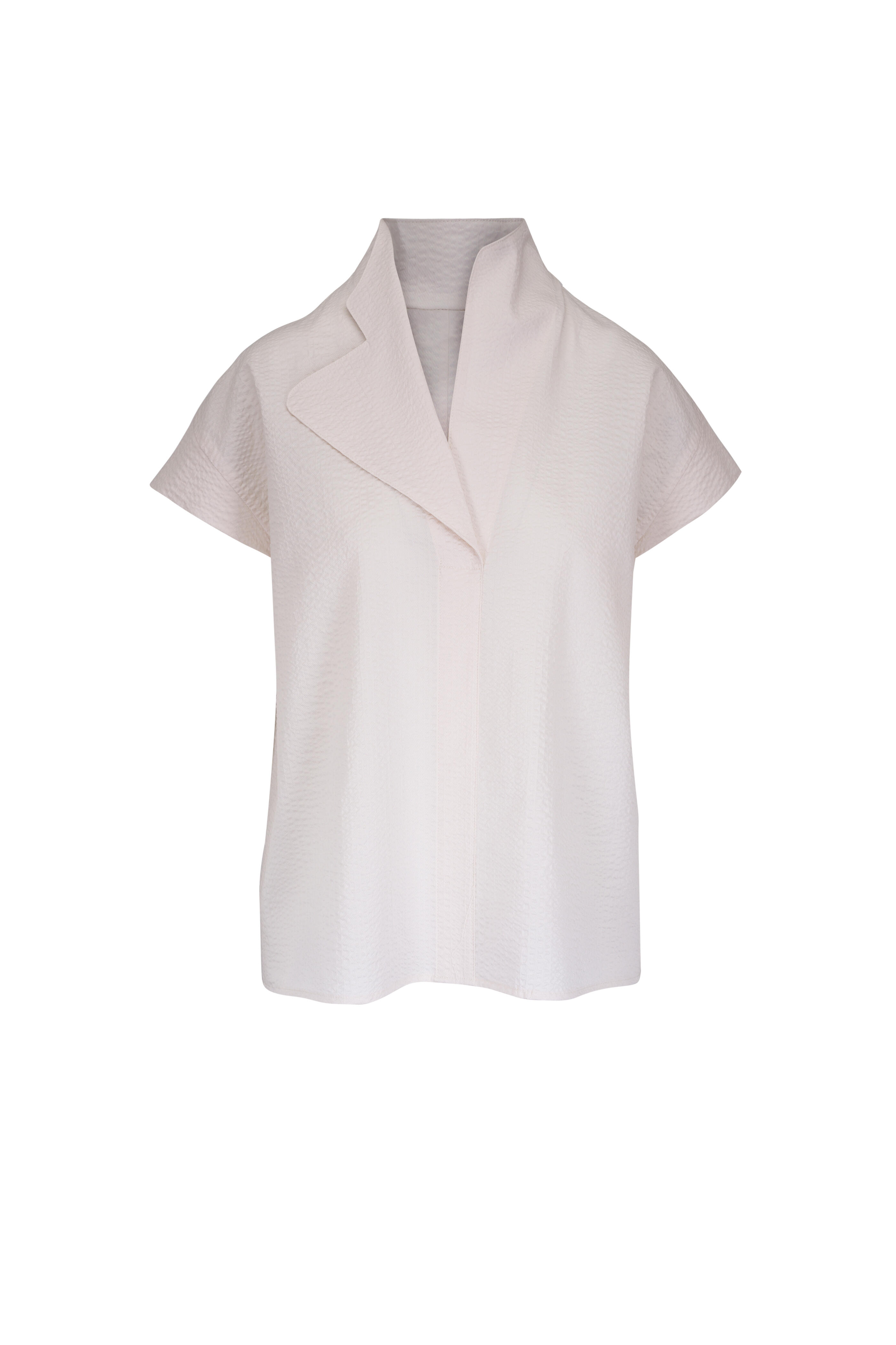 Stand collar. V-neckline. Made in USA. 100% cotton. Hand wash.