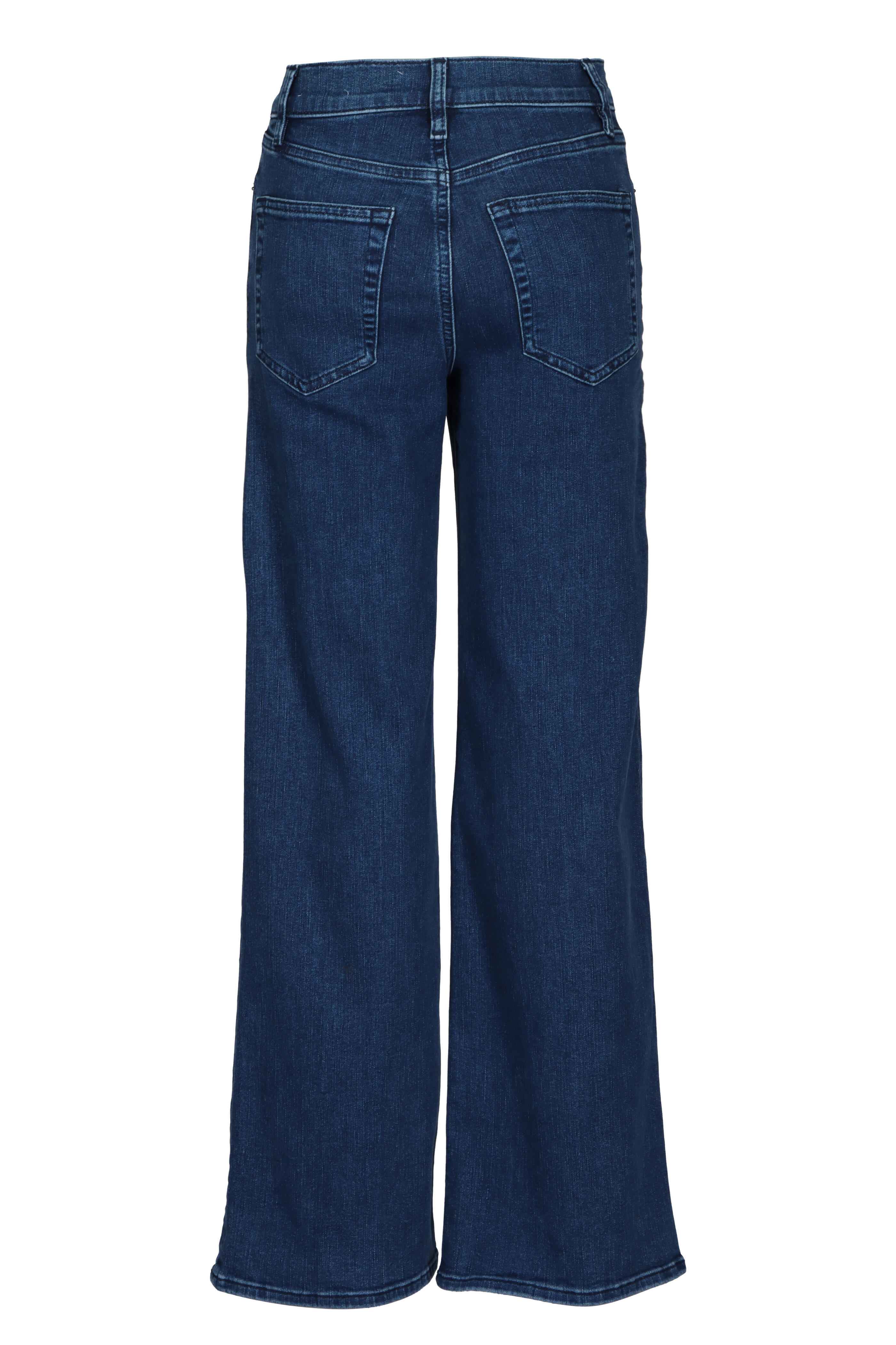 Zip fly; button closure. High rise fit. Banded waist; belt loops. Five pocket styling. Wide-leg silhouette. Imported. 29 1/2" inseam; 22" leg opening; 11" front rise; 14 1/2" back rise (size 29). 49% cotton, 21% recycled cotton, 17% recycled polyester, 11% lyocell, 2% elastane. Machine wash.