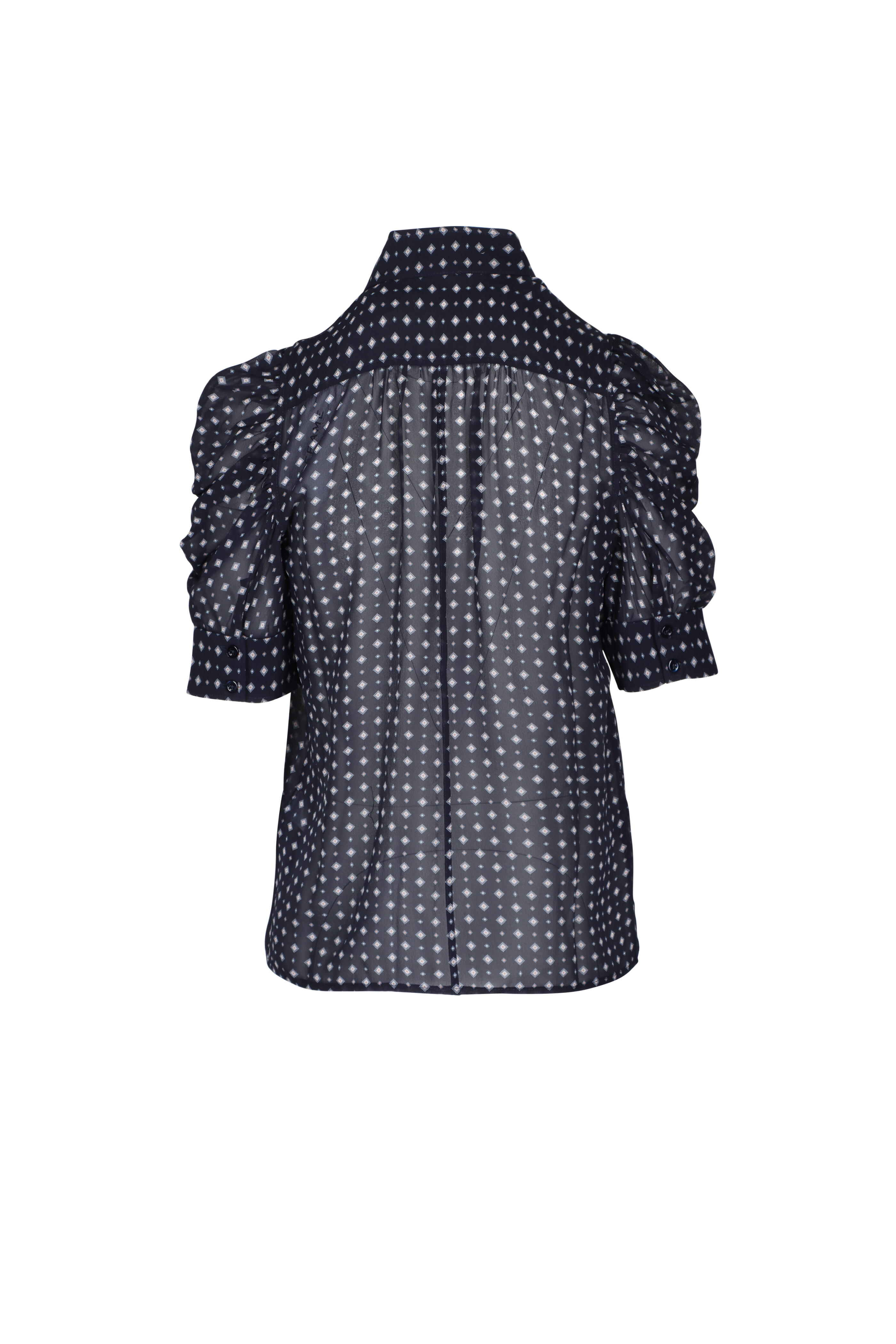 Stand collar. Short sleeves; button cuffs. Hidden button-front. Straight hem. Imported. Fits true to size.. 100% Silk. Dry clean only.