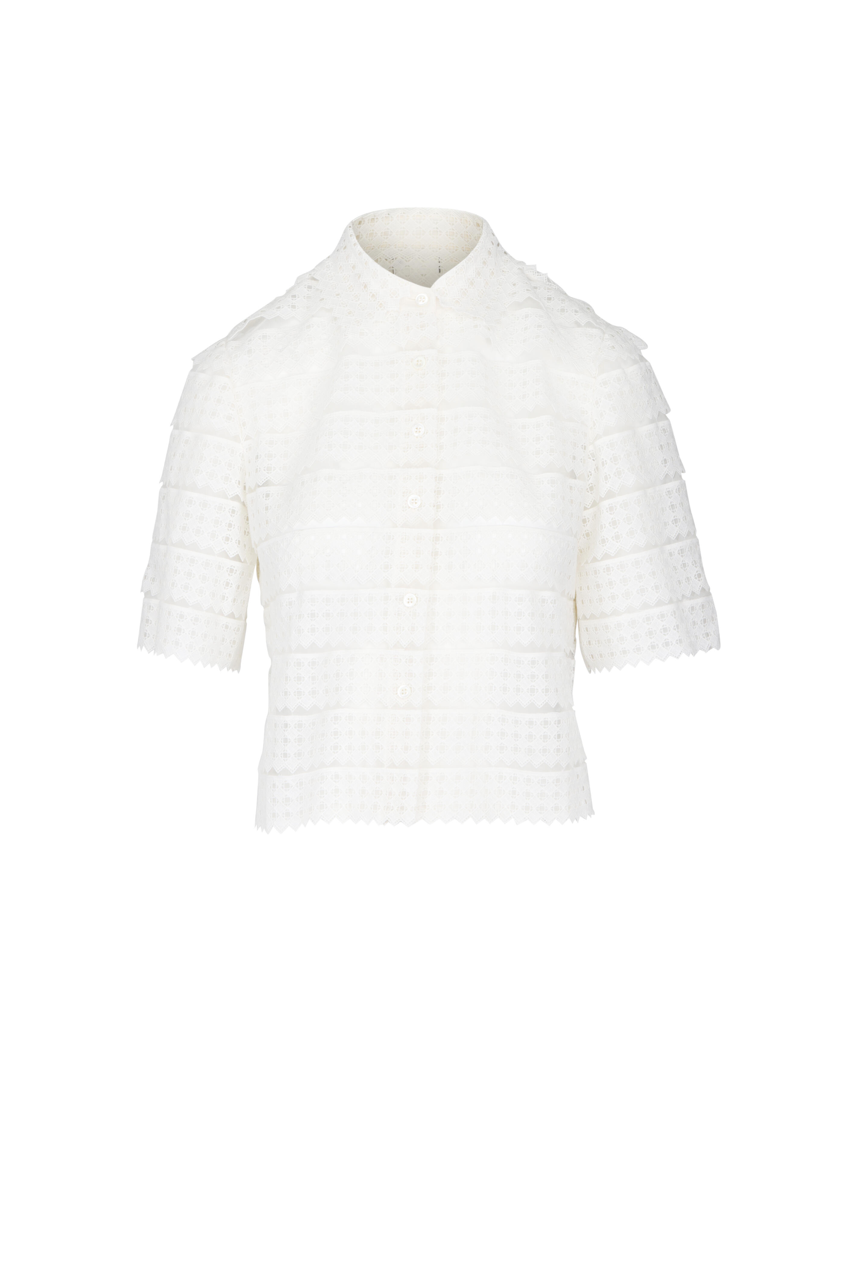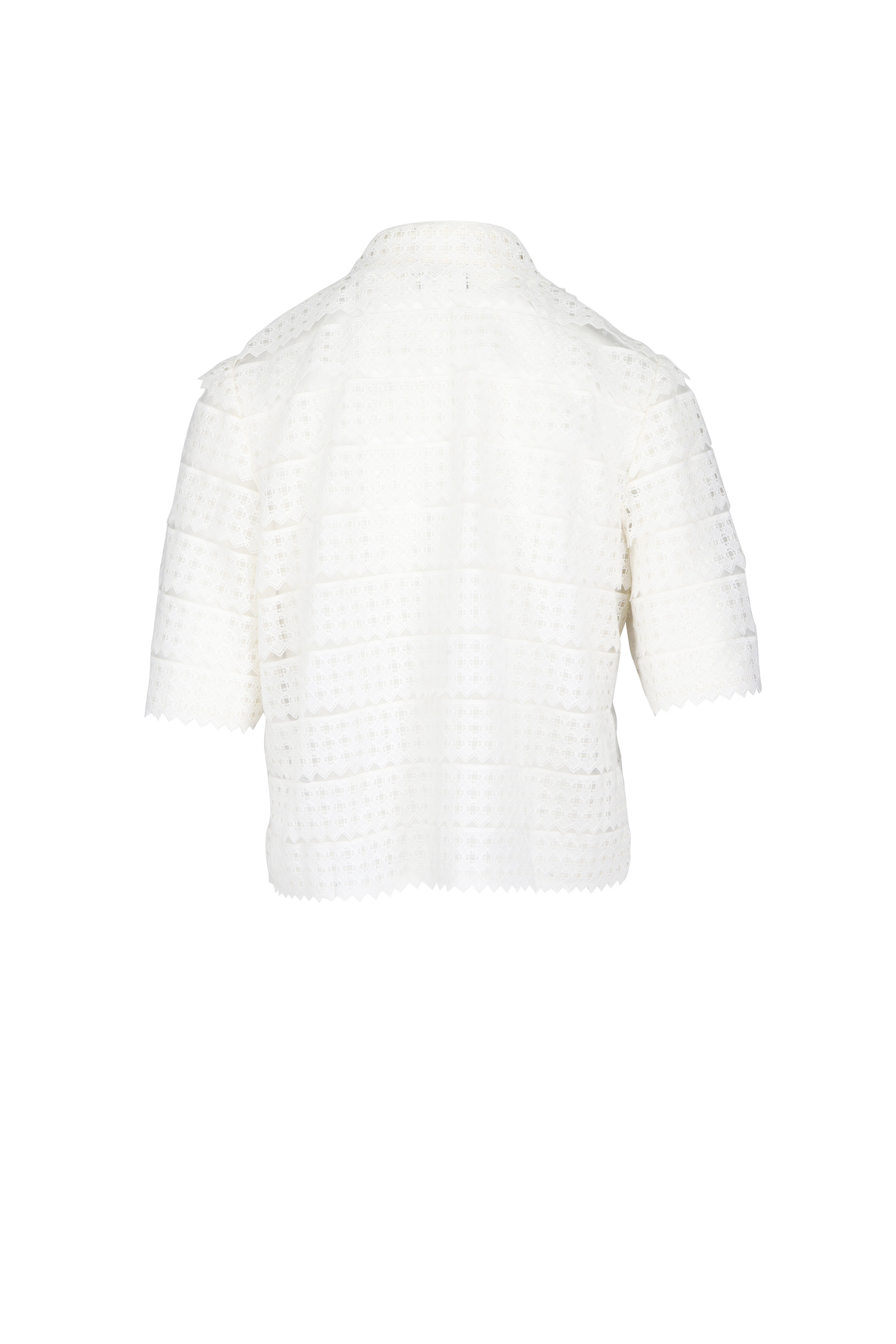 Point collar. Button-front. Short sleeves. Imported. Cropped, boxy fit. 100% nylon. Dry clean.