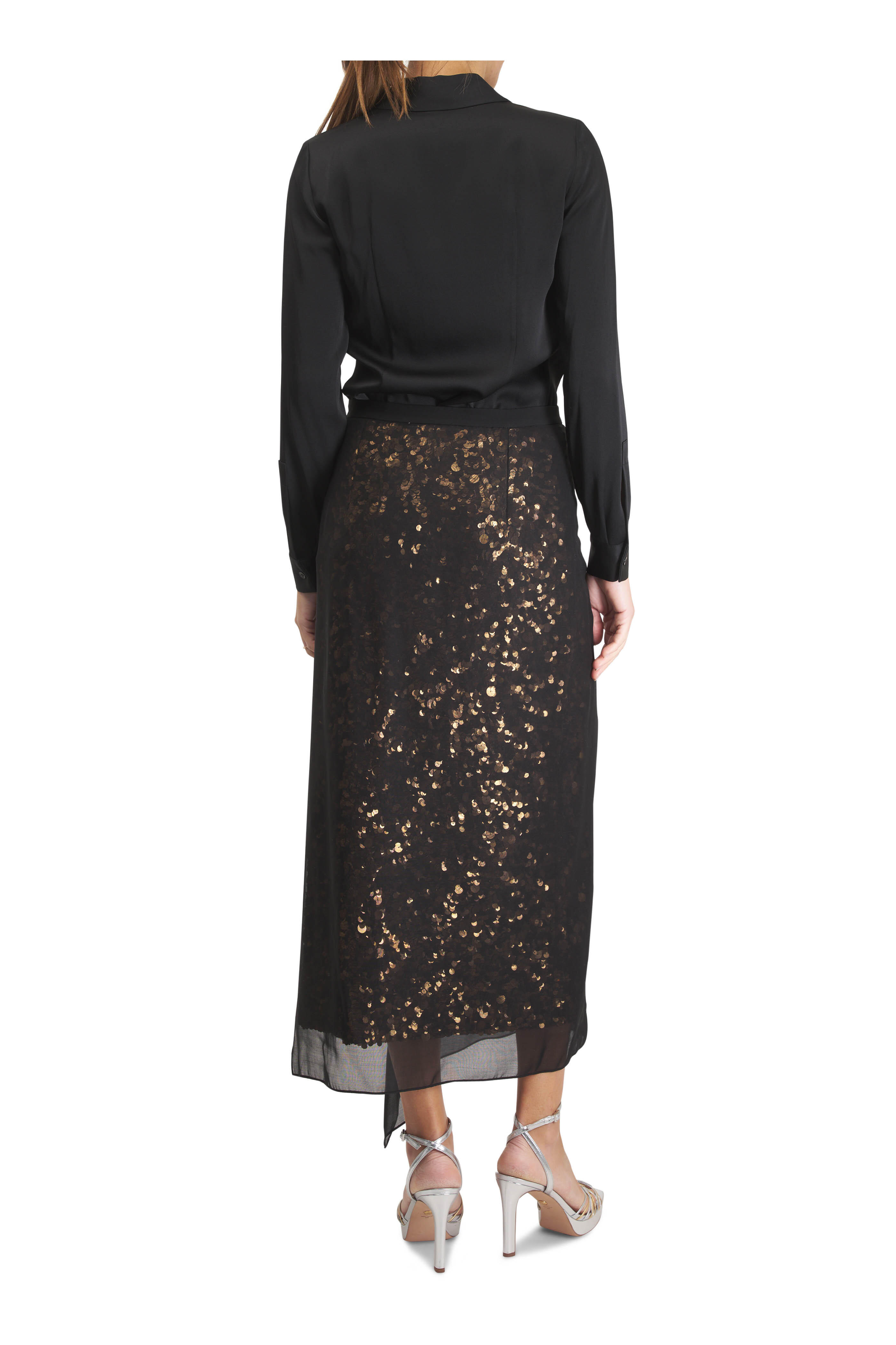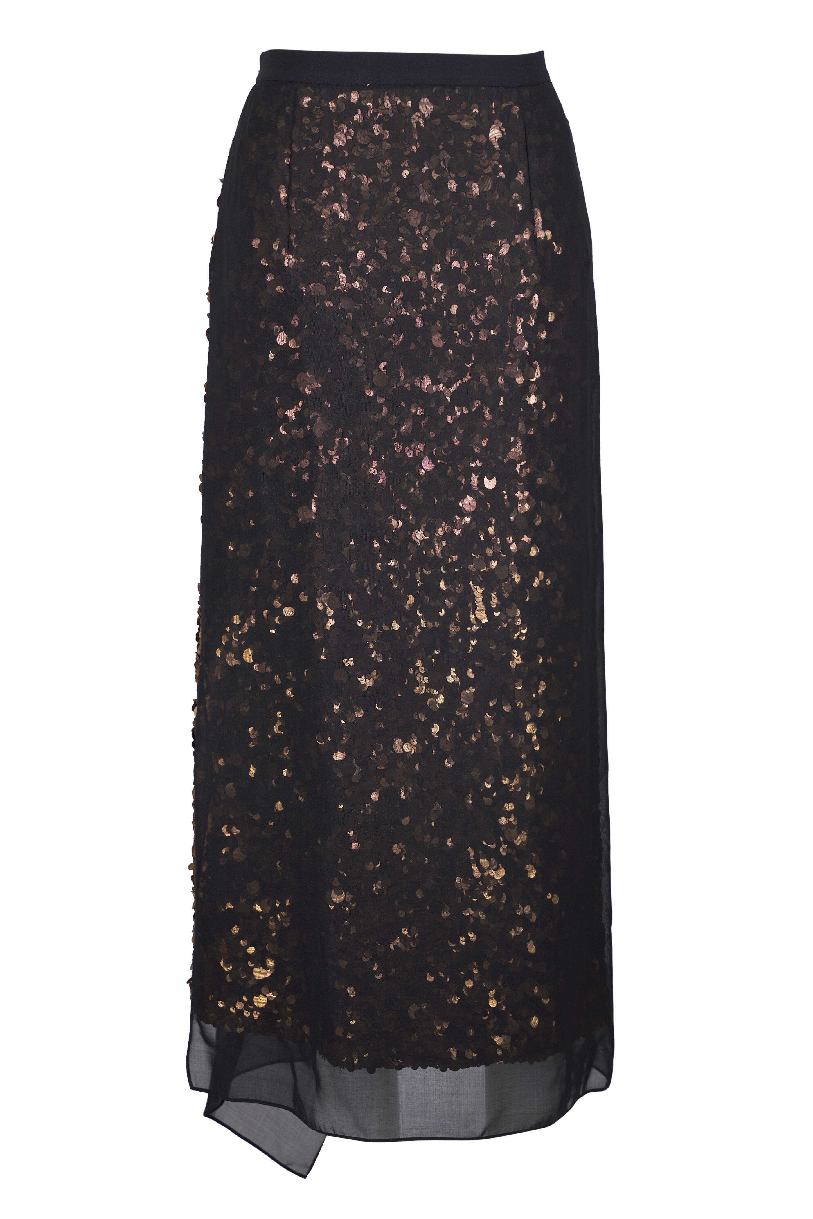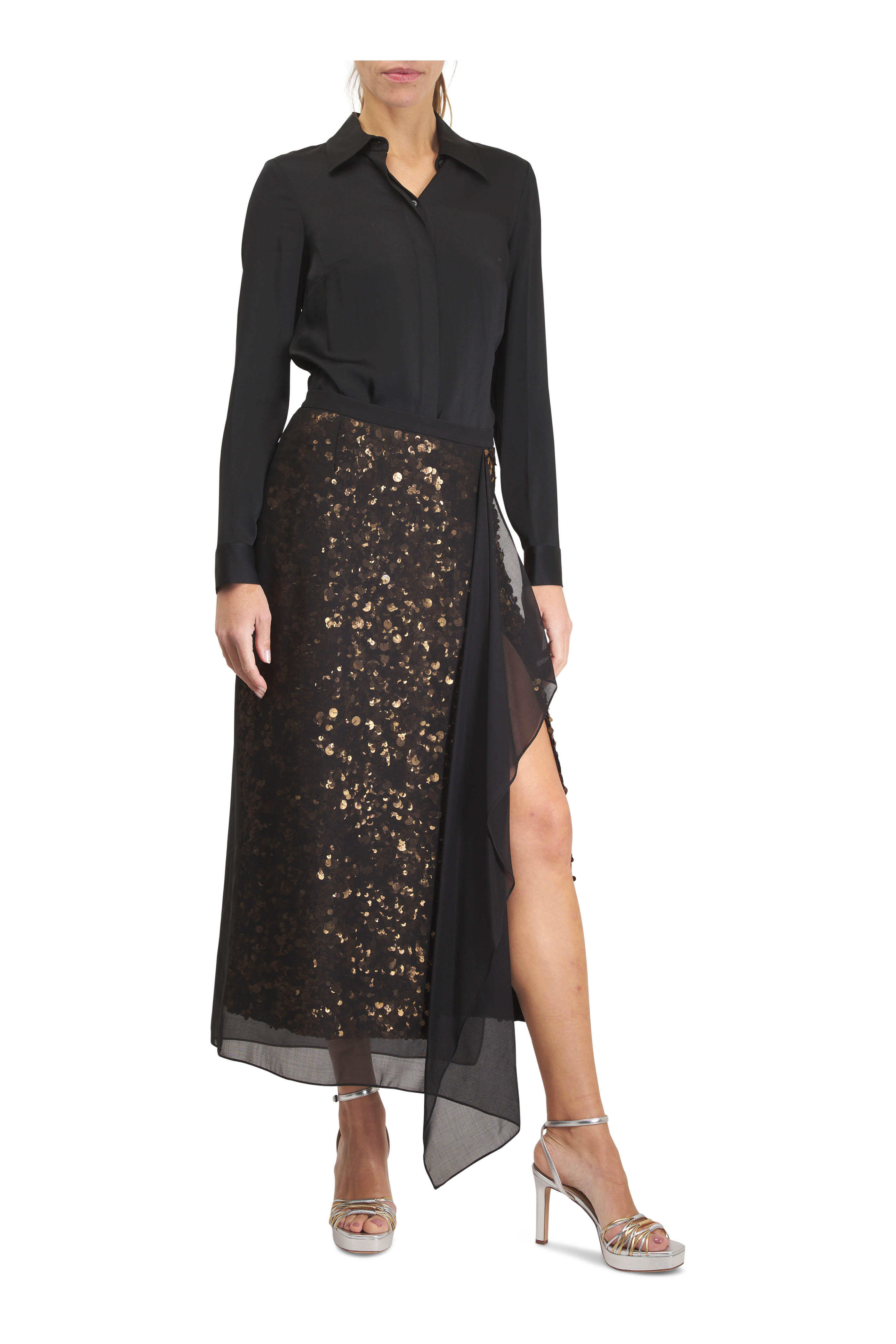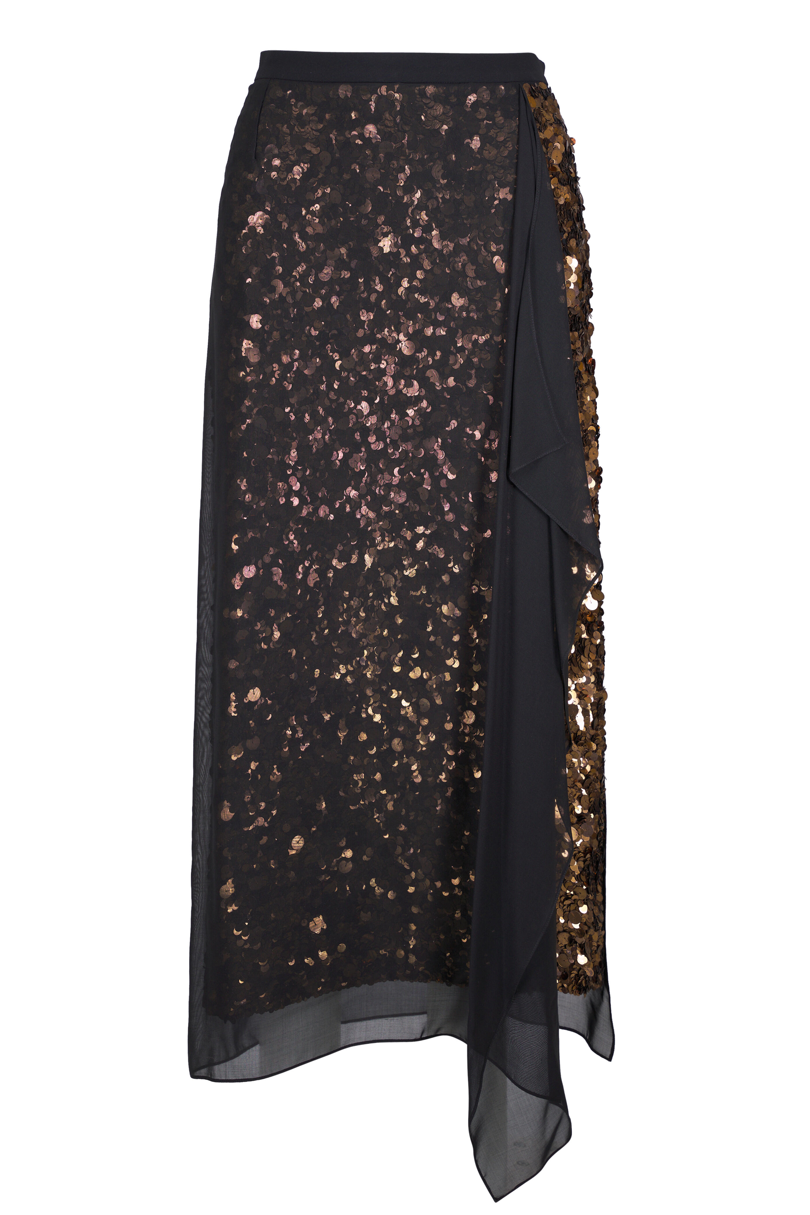 Thigh high slit. Hand embellished sequins throughout. Georgette overlay. Made in Italy. Midi length. 100% wool; lining: 100% silk. Dry clean.