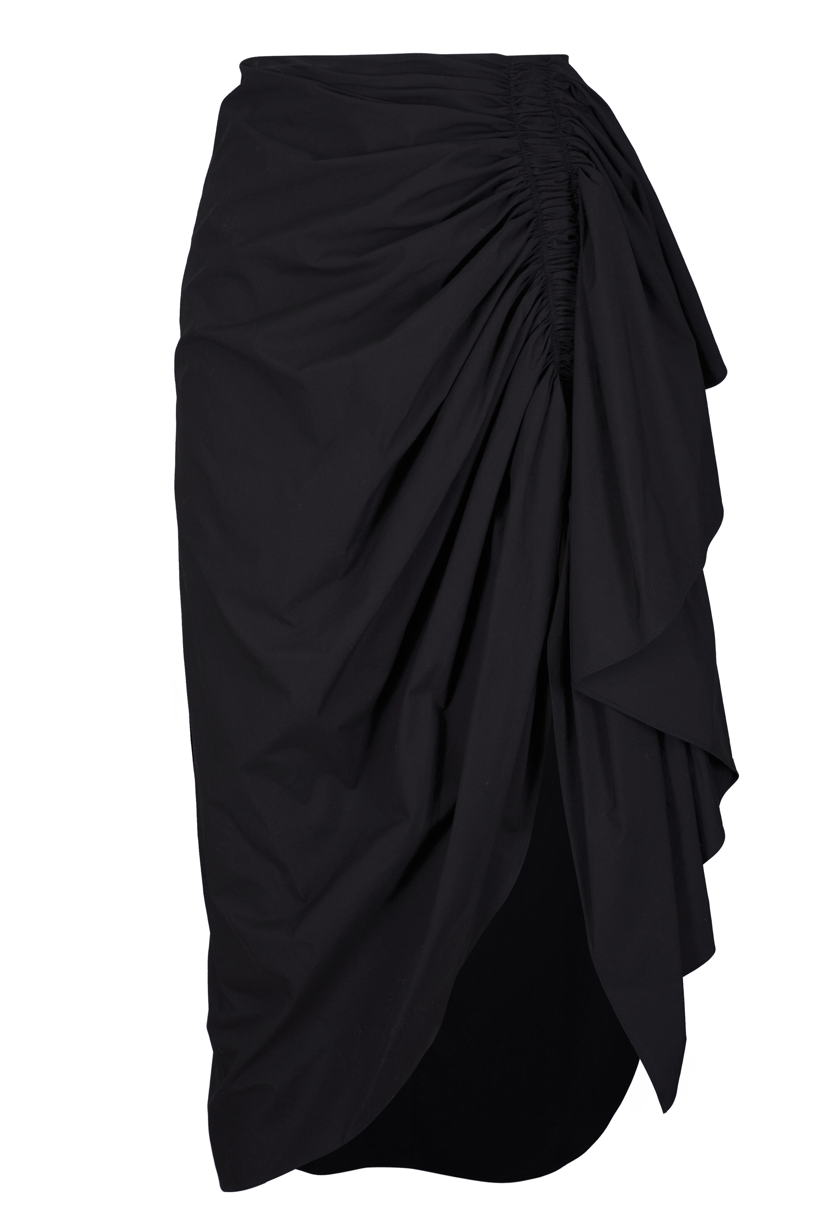 Concealed back zip. Ruched detailing. Fabric from Italy. 100% cotton. Dry clean.