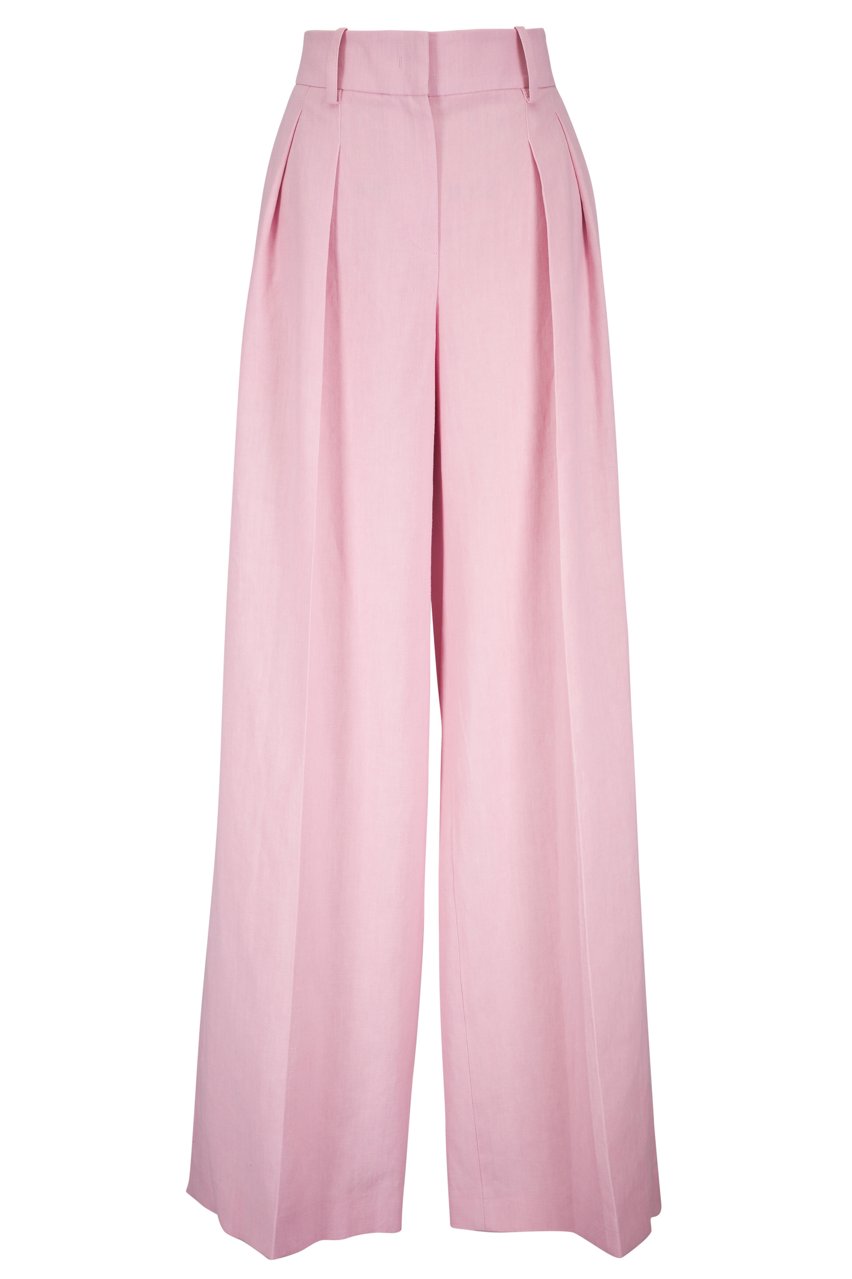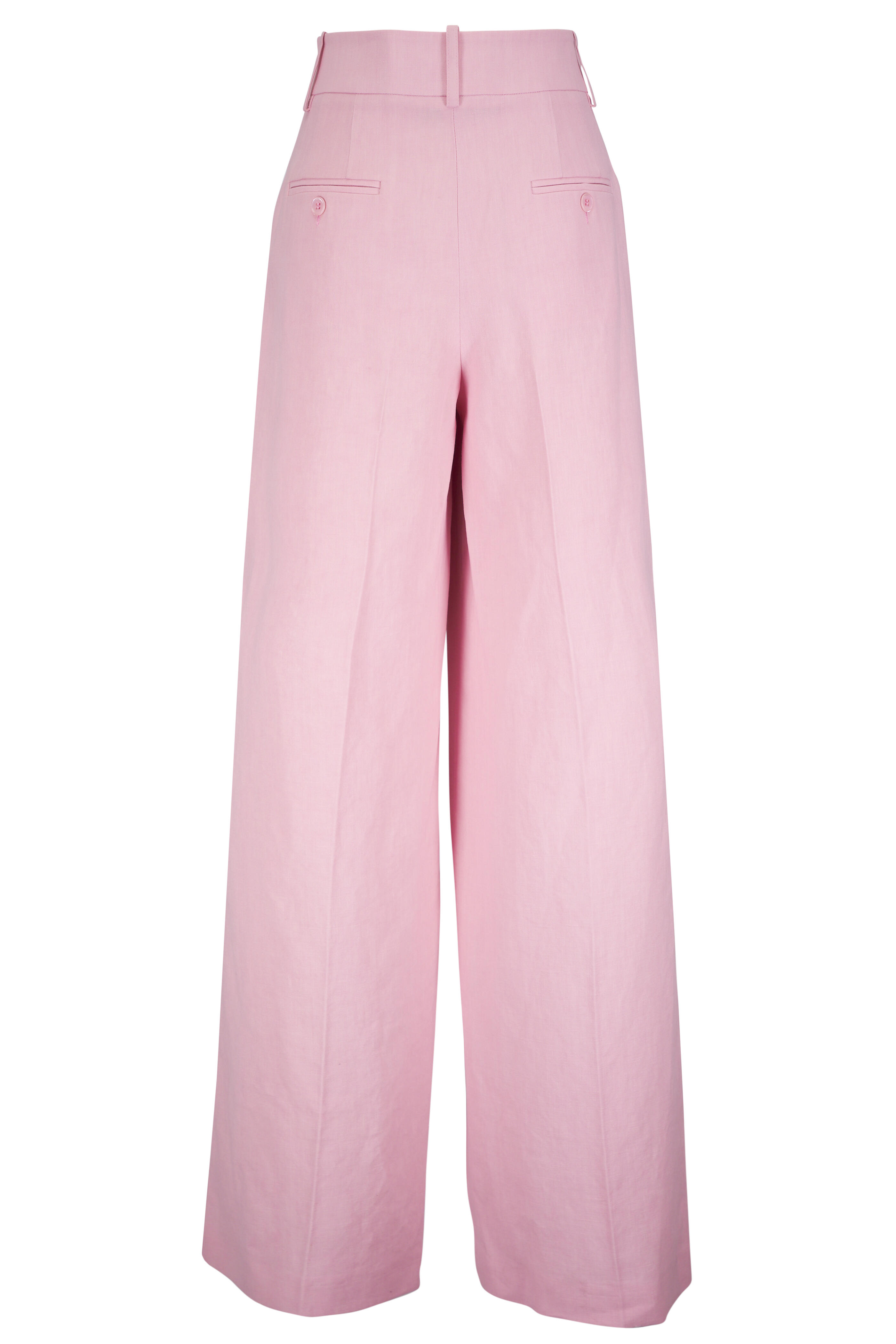 Zip fly; hook-and-bar closure. Banded waist; belt loops. Side slip pockets; back buttoned welt pockets. Pleated front. Made in Italy. Inseam: 34". 100% linen. Dry clean.