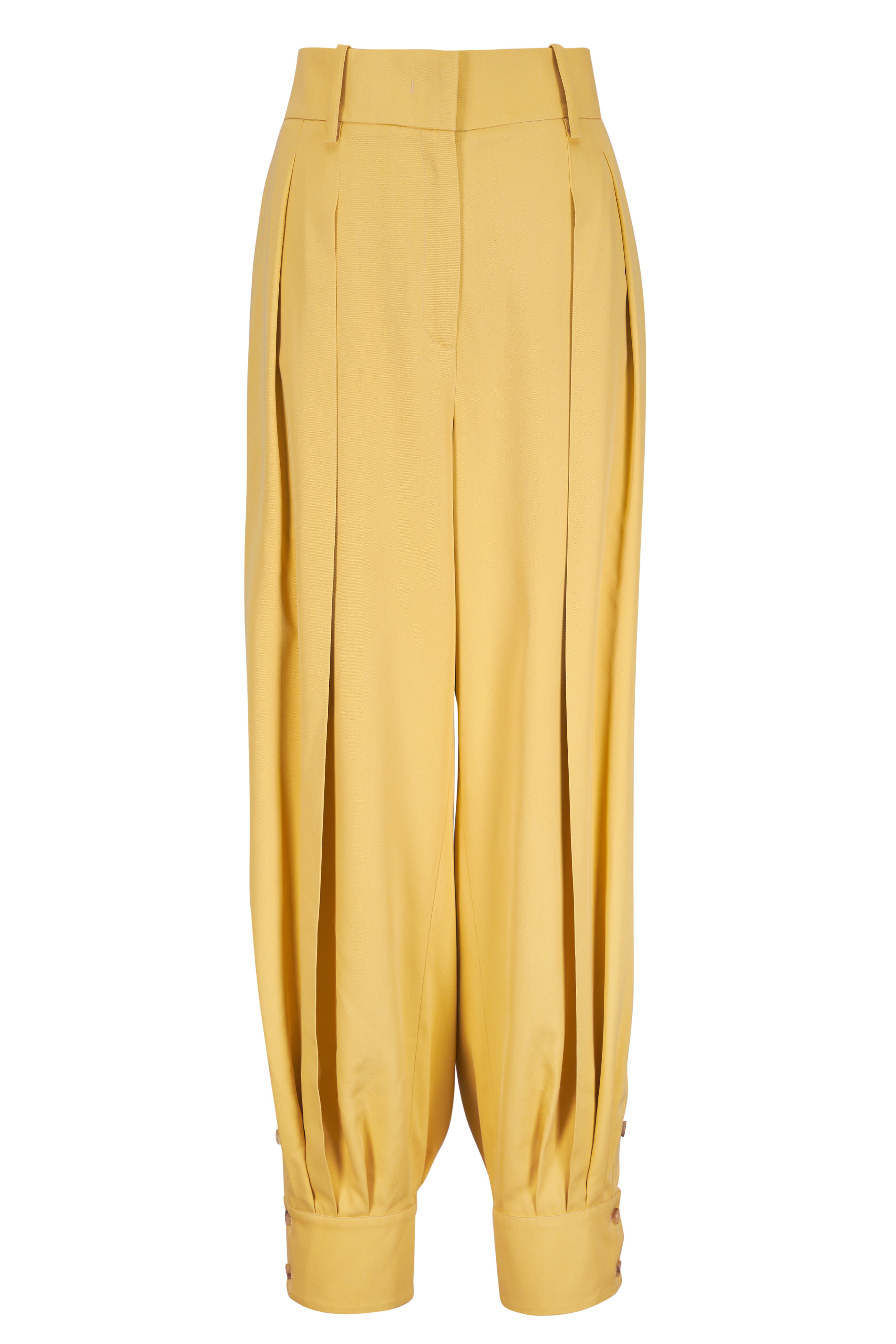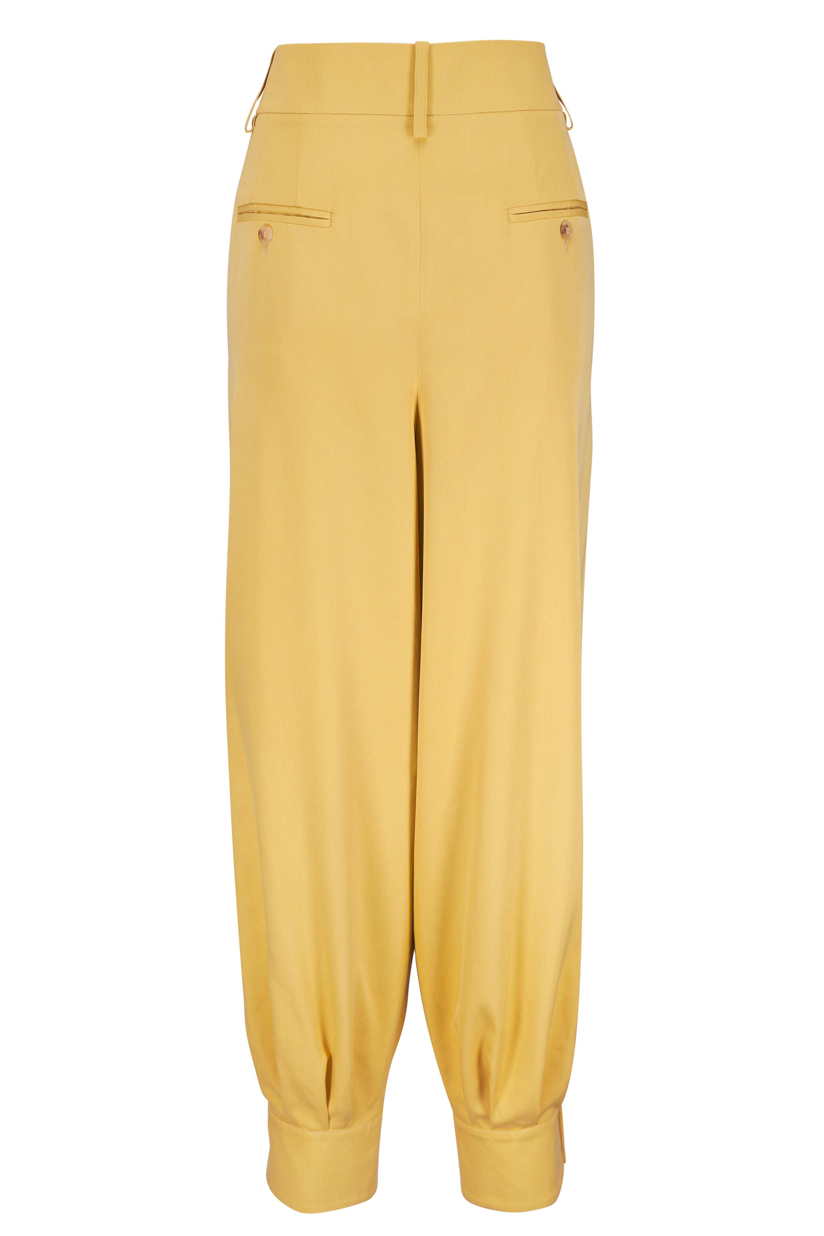 Front zip; hook and eye closure. Banded waist; belt loops. Front slip pockets; back besom pockets. Double button cuffed hem. Pleat detail. Made in Italy. Hits at ankle. 100% silk; lined. Dry clean.