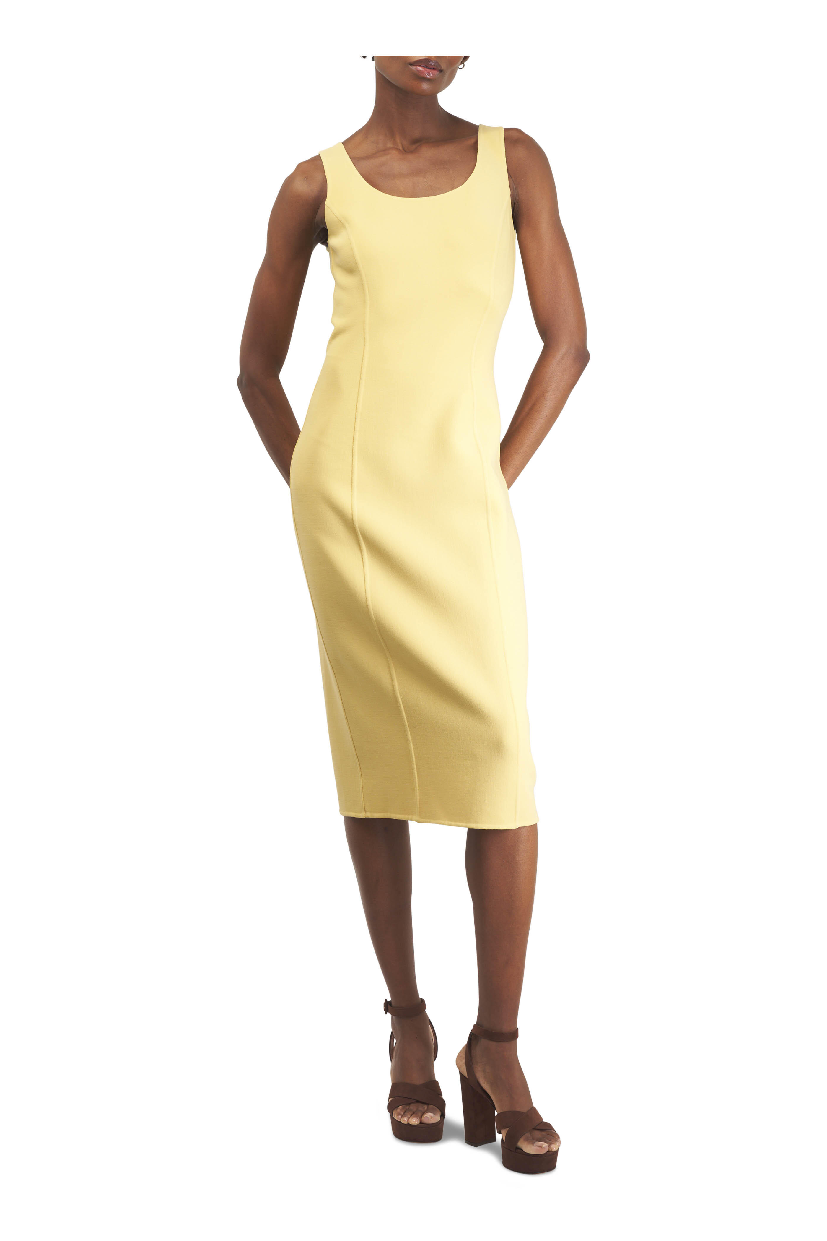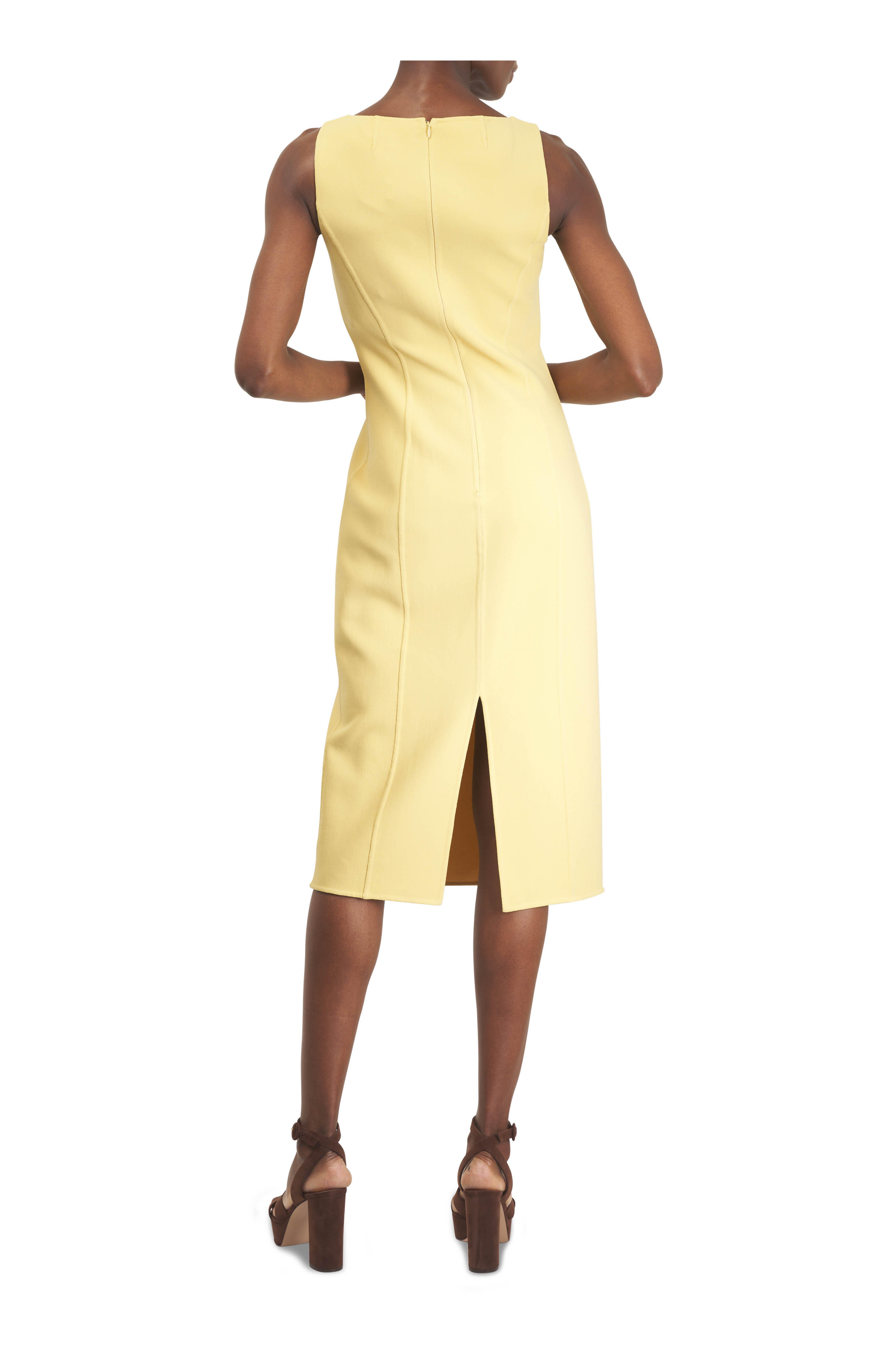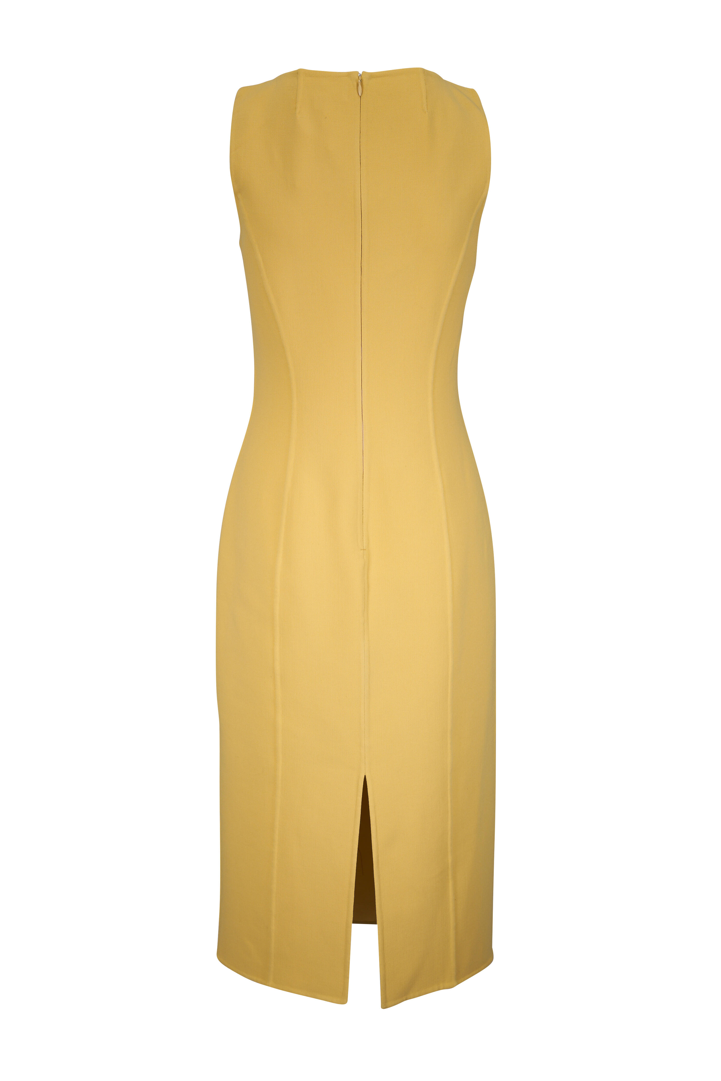 Scoop neckline. Concealed back zip. Back vent. Raised seam details. Made in Italy. Hits just below knee. 96% wool, 4% elastane. Dry clean.