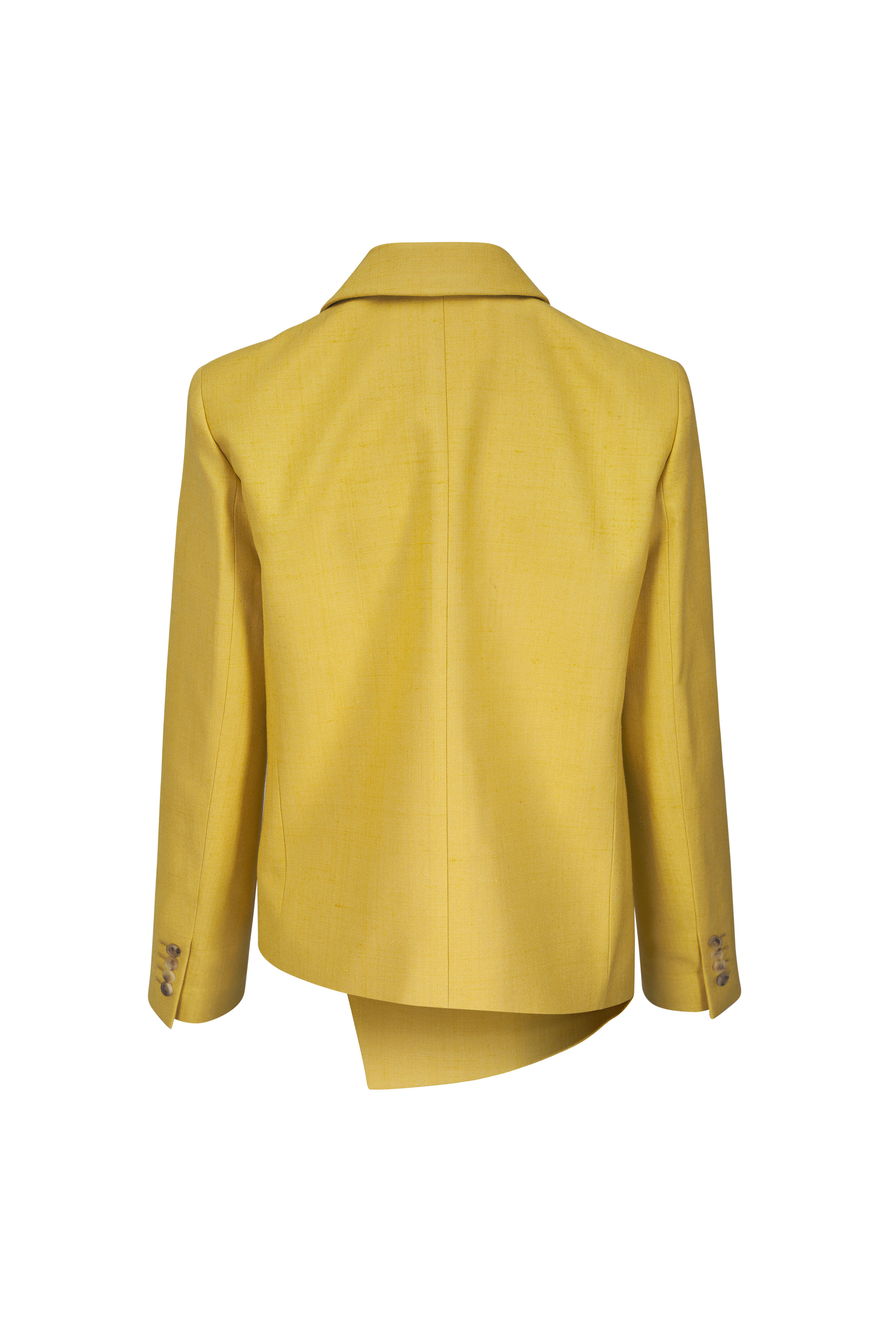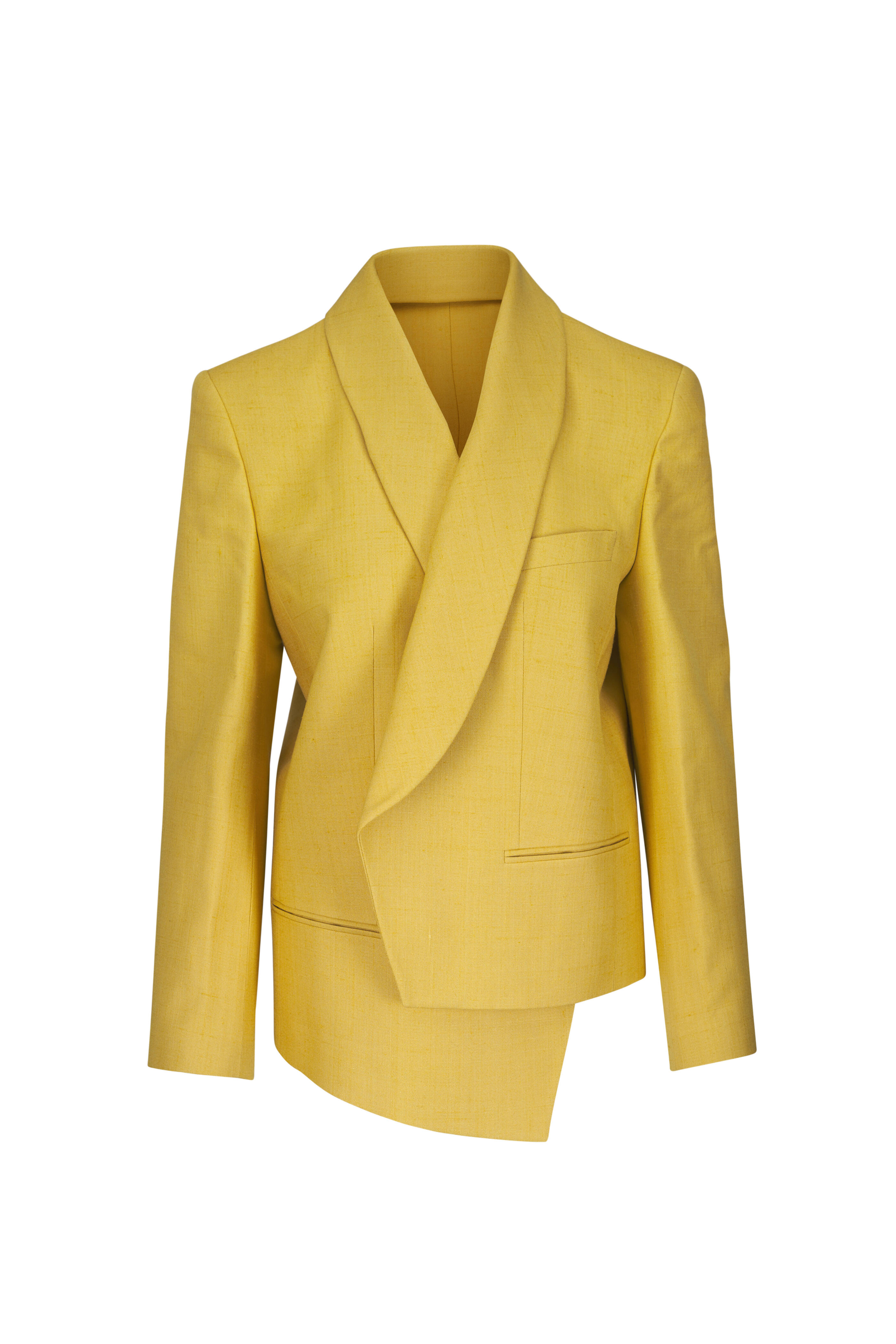 Shawl collar. Asymmetrical open front. Lower welt pockets; chest patch pocket. Four button cuffs. Made in Italy. Approximately 25 ½" back of collar to hem (measurements taken from size 8). 100% silk; lined. Dry clean.