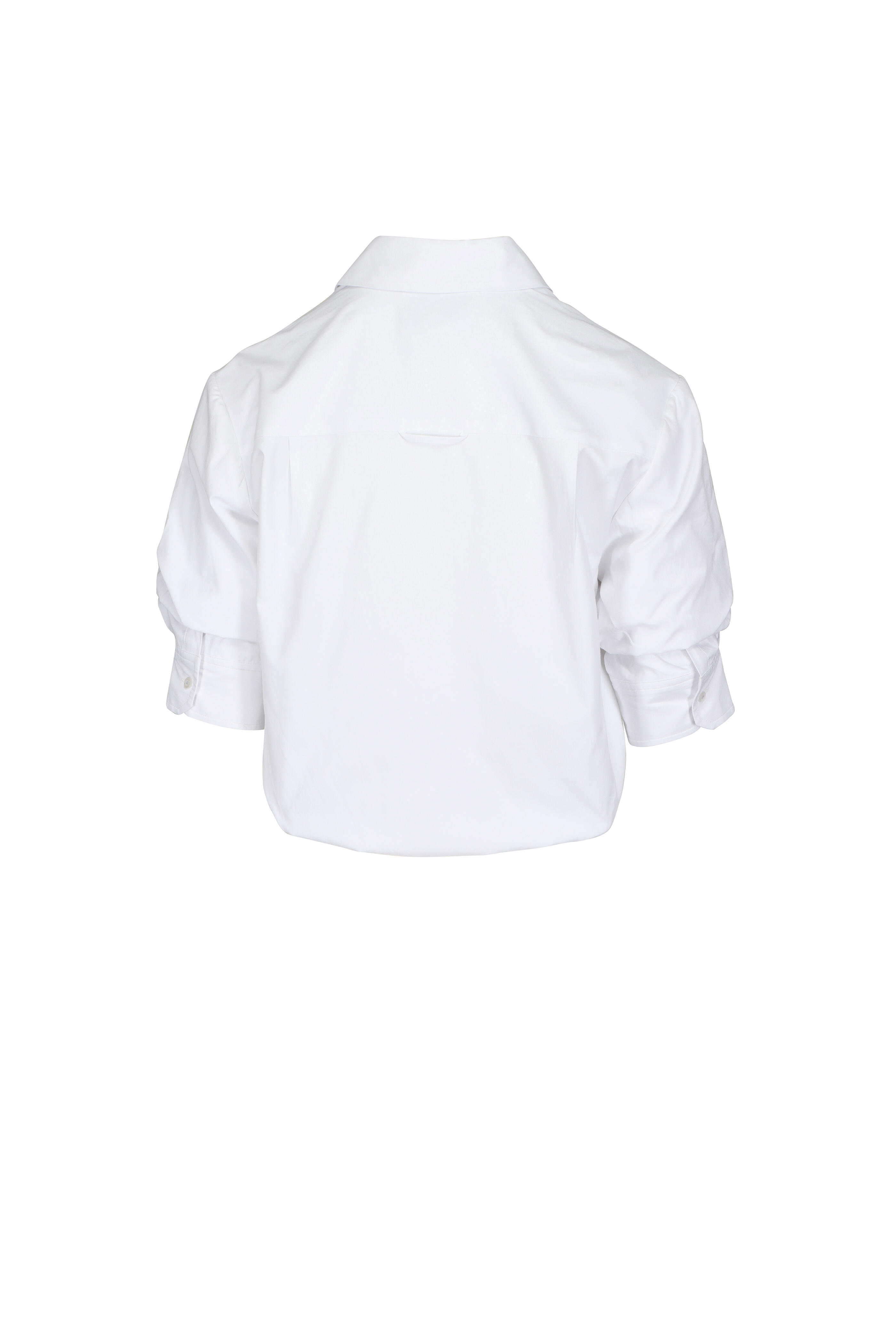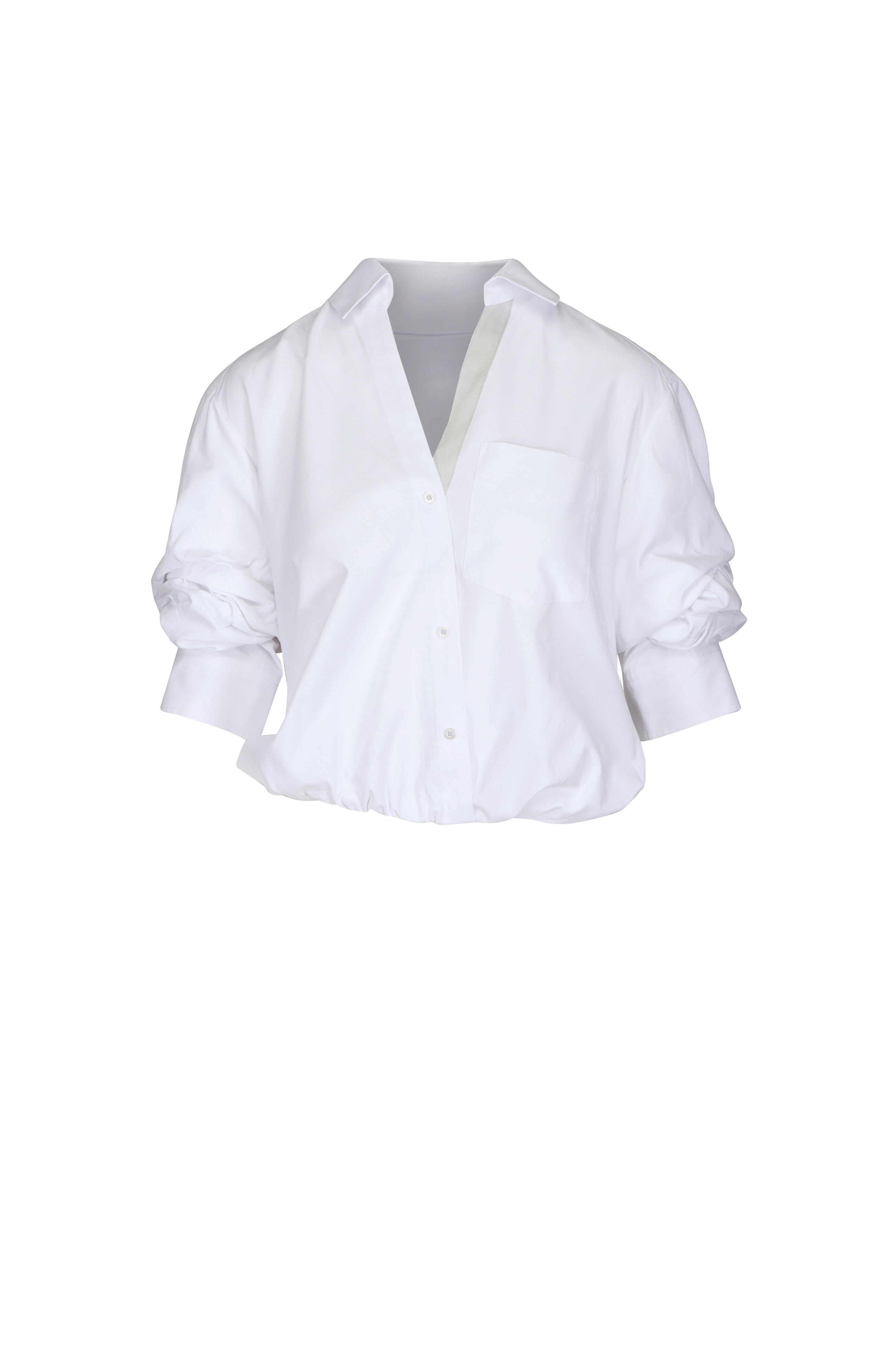 Collared neckline. Asymmetrical placket. Button closure at cuffs. Back yoke with pleats. Pre-styled scrunched sleeves. Elasticized hem. Imported. Sleeve length 12.25” from center back, body length 23” (size S). 65% Polyester, 35% cotton. Dry clean.