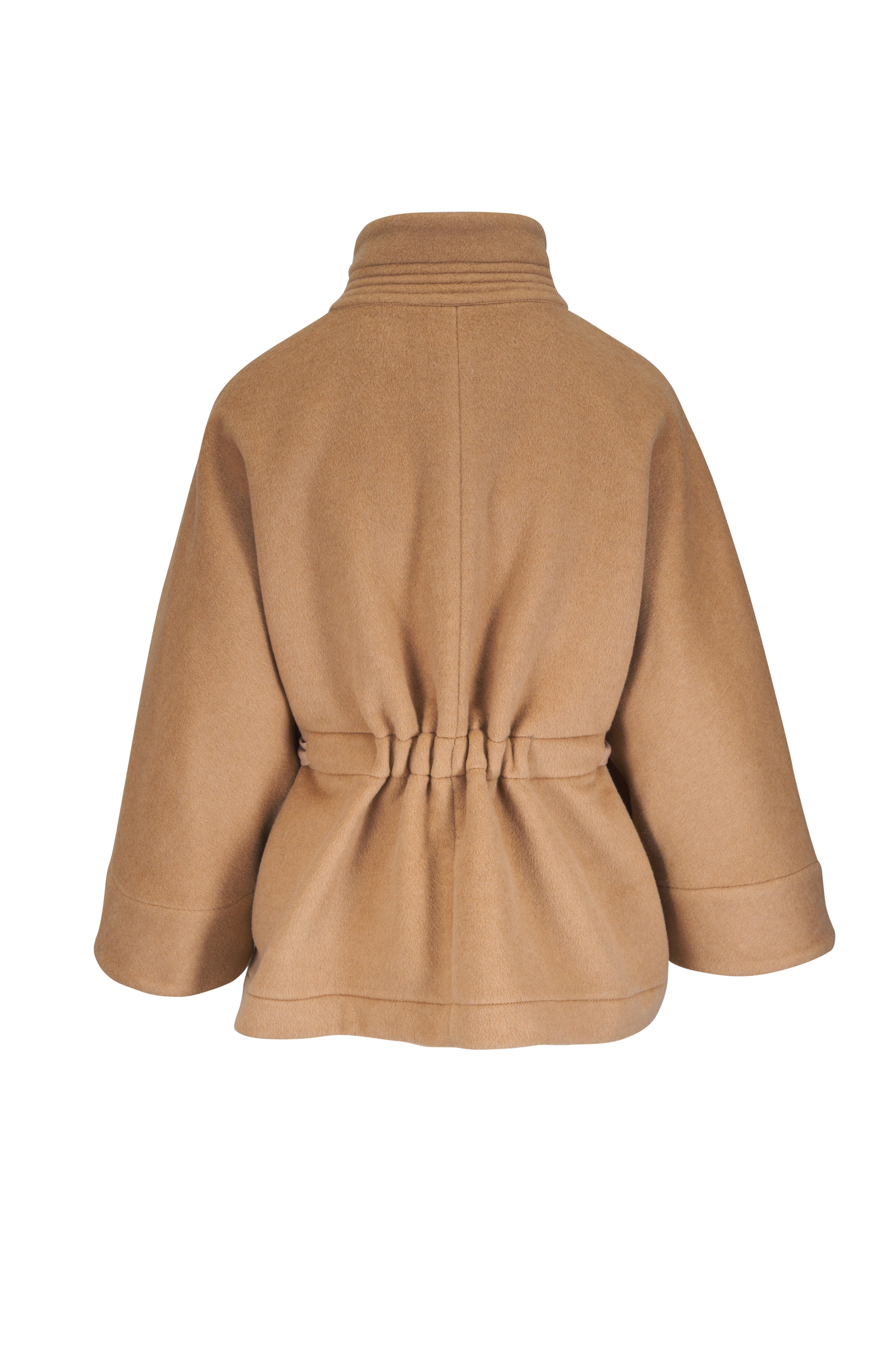 Stand collar. Concealed front zip. Attached belt. Imported. 92% virgin wool, 8% cashmere. Dry clean.