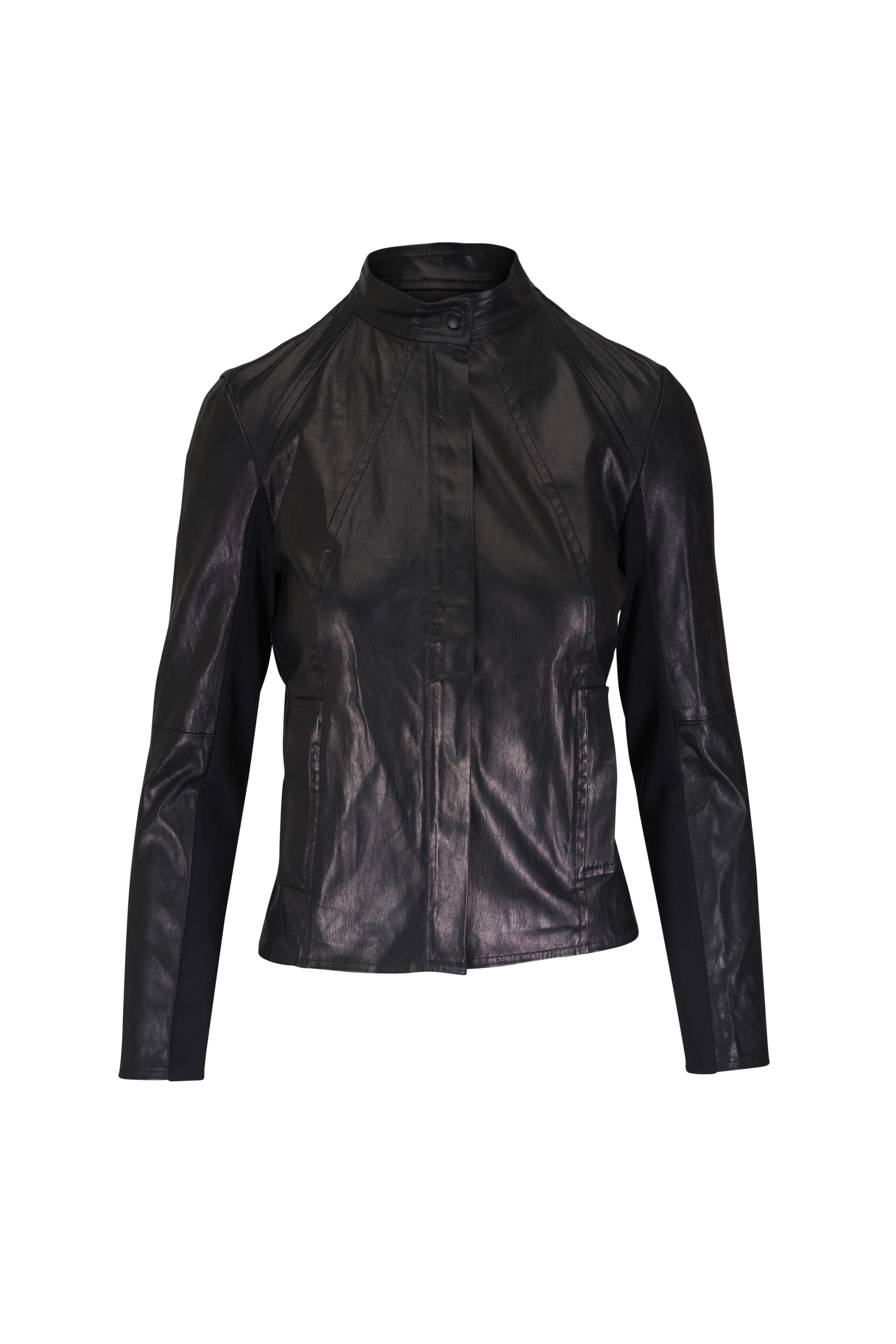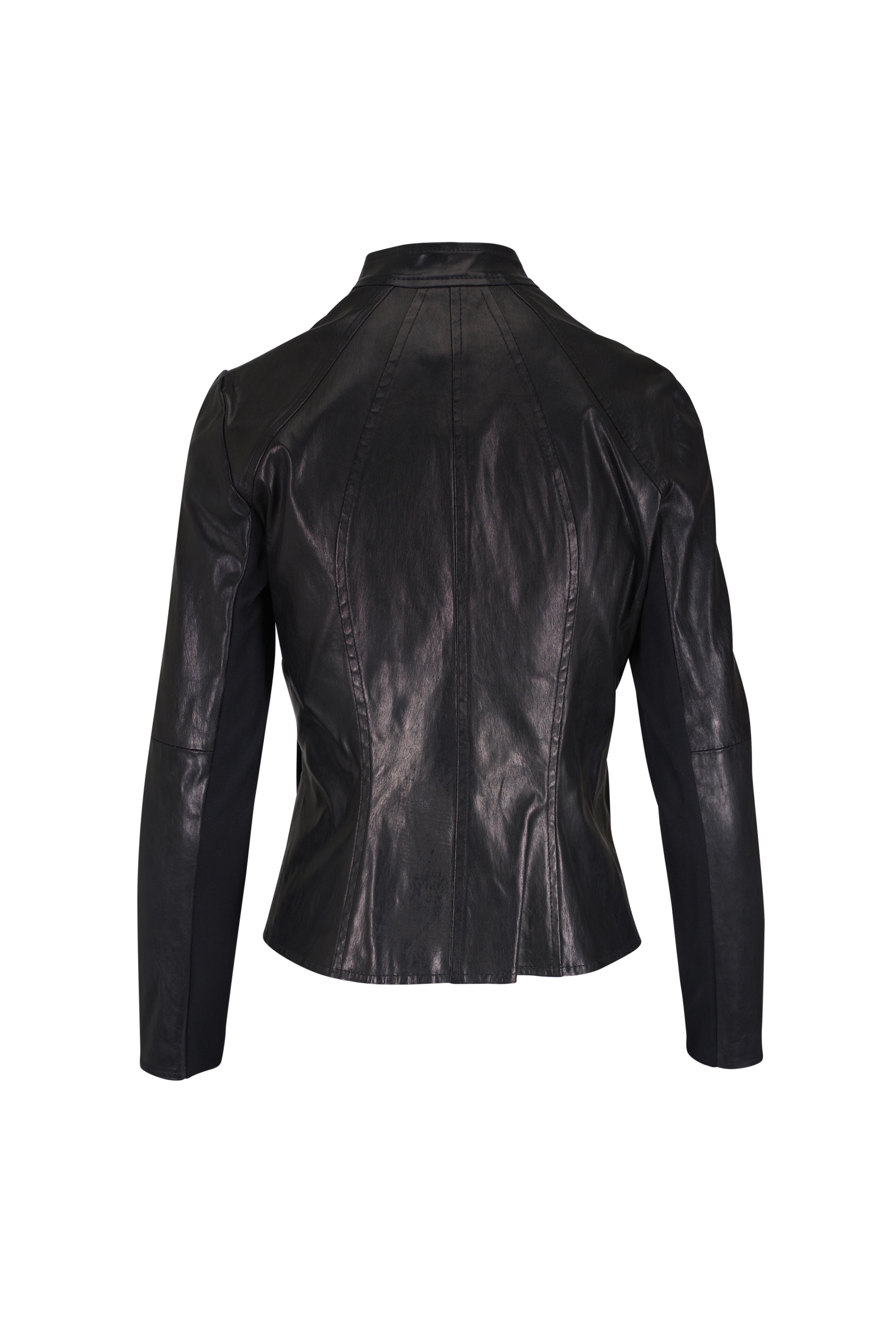 Specialist clean. Oversized notch lapels. Asymmetrical zip. Zip pockets. Raw edge finish. Made in the USA. 100% lambskin; unlined.