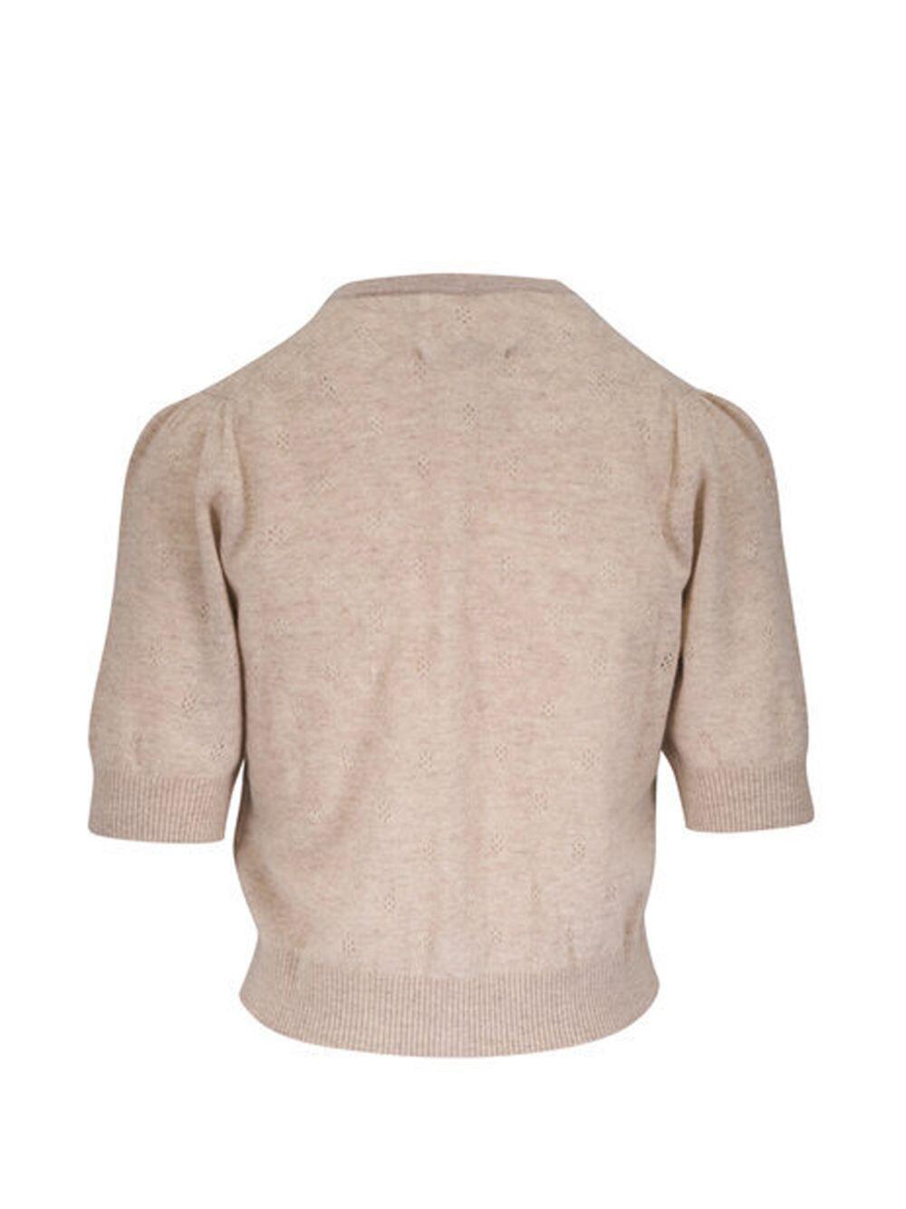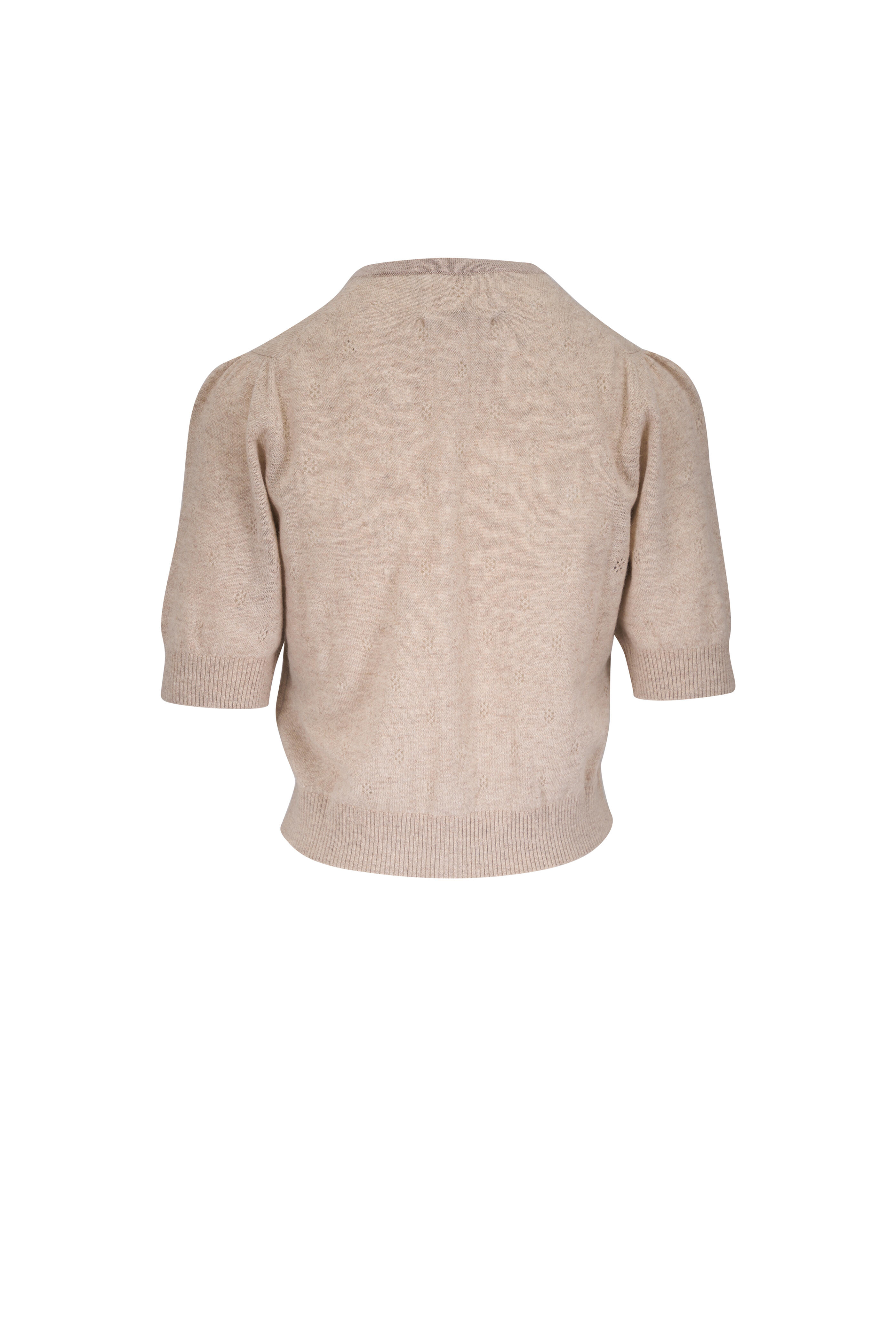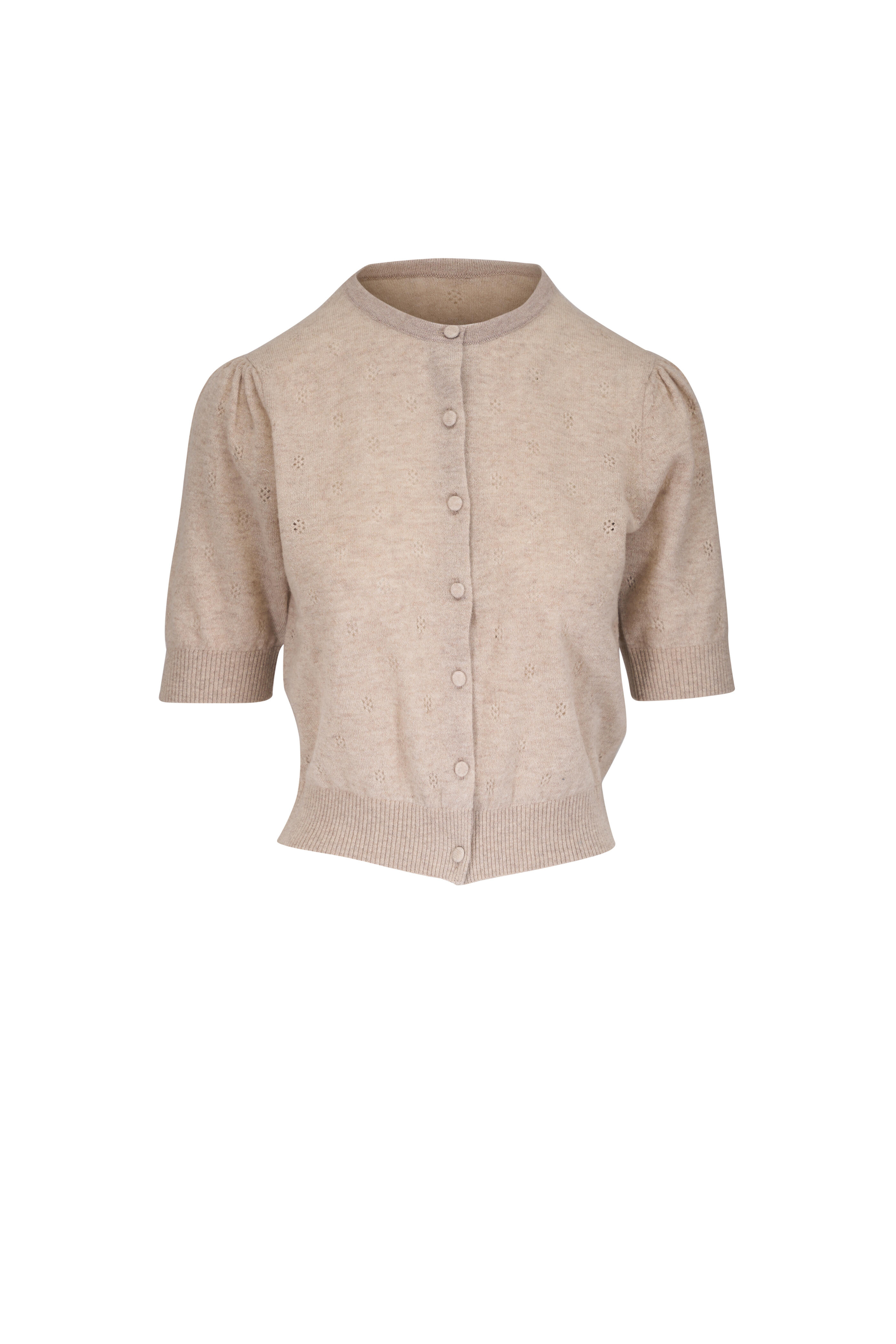 Crew neckline. Front button placket. Ribbed trims. Blouson sleeves. Imported. 19" length (size S). 55% wool, 45% cashmere.