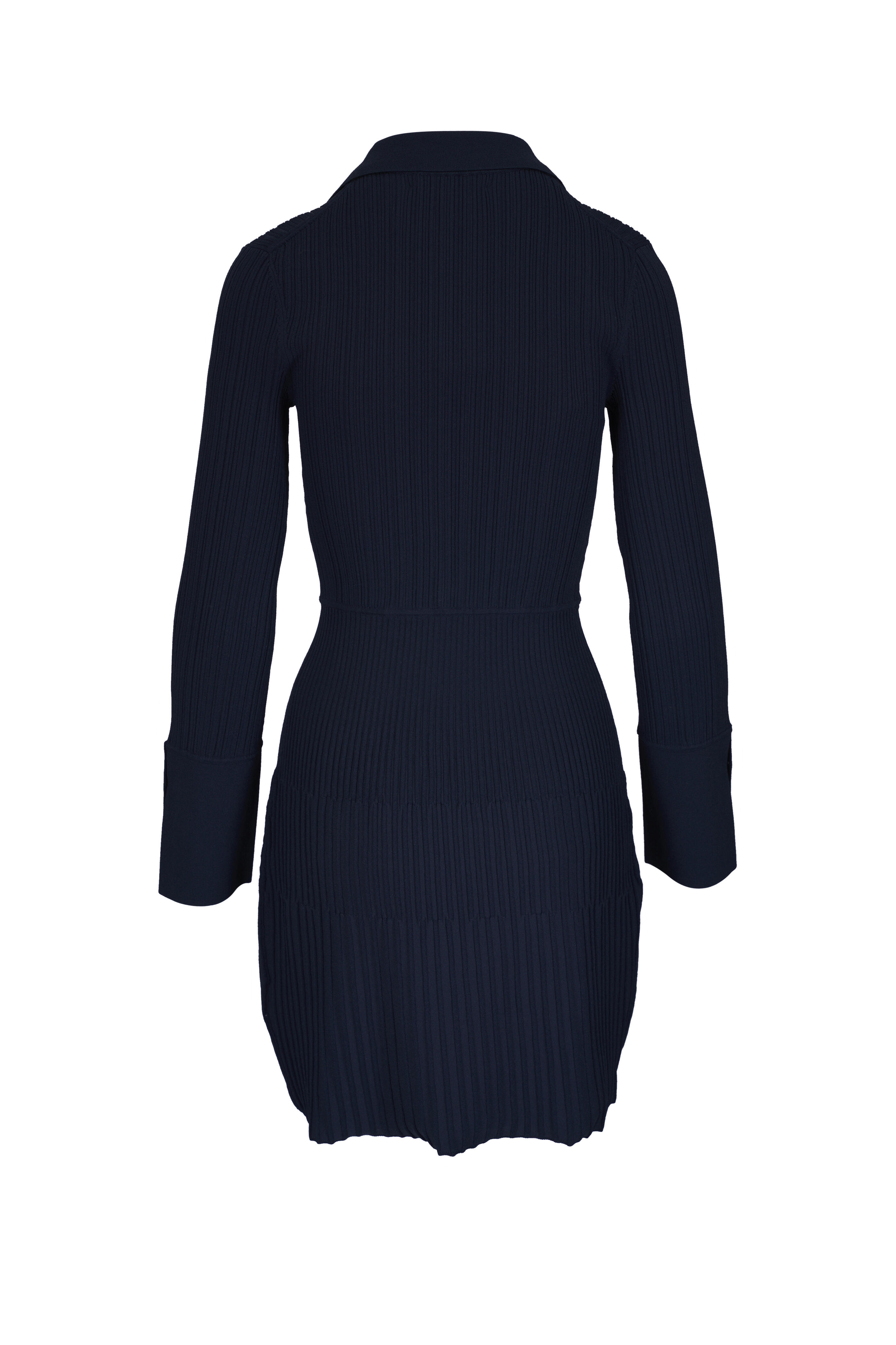 Spread collar. Partial front button placket; gold buttons. Faux front pockets. Single button elongated cuffs. Ribbed throughout. Imported. Approximately 37 ½" shoulder to hem (measurements taken from size M). 60% viscose, 22% nylon, 14% polyester, 4% elastane. Dry clean.