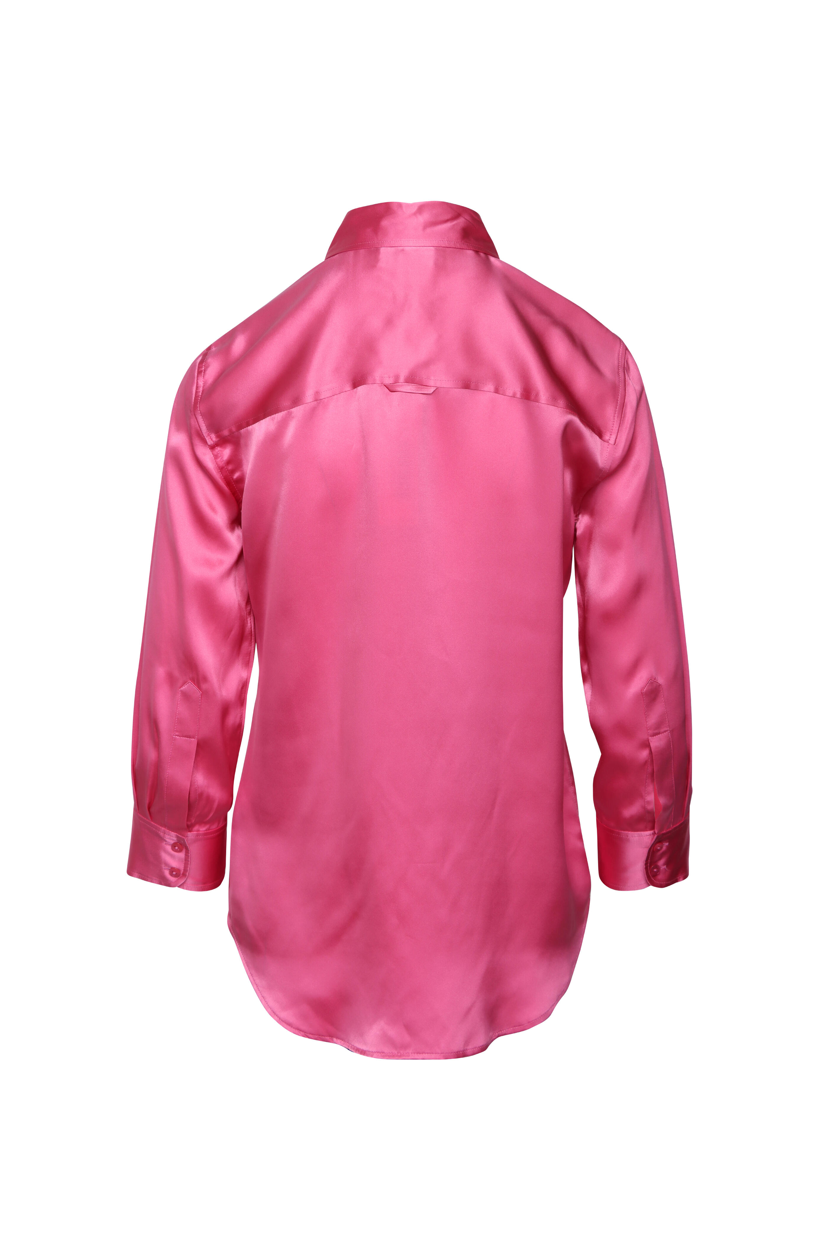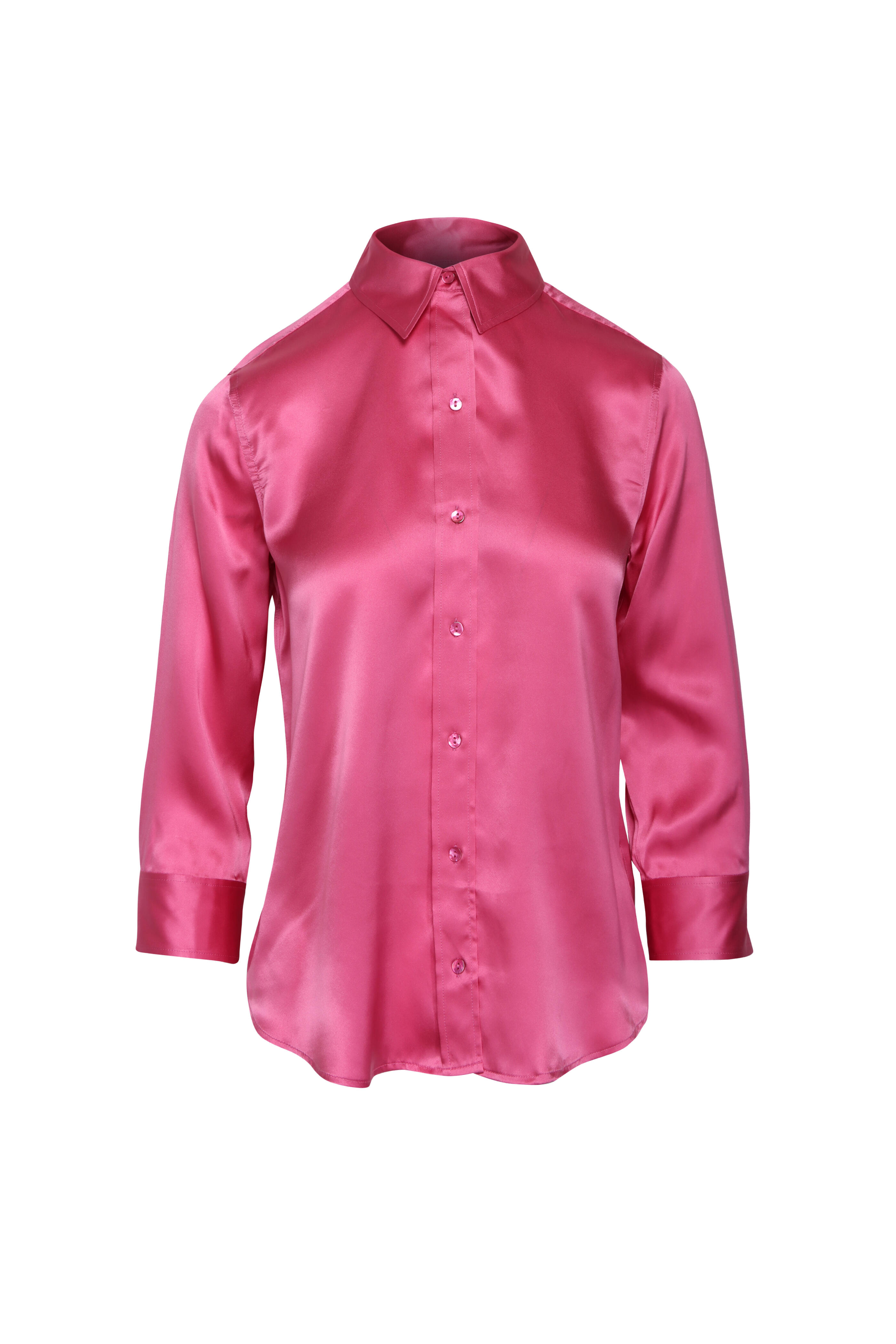 Collar. ¾ length sleeves; button cuffs. Button up front closure. Slim fit. Rounded shirttail hem. Imported. Sleeve 19.2” (Size XS). Length 26” (Size XS). 100% silk. Dry clean.