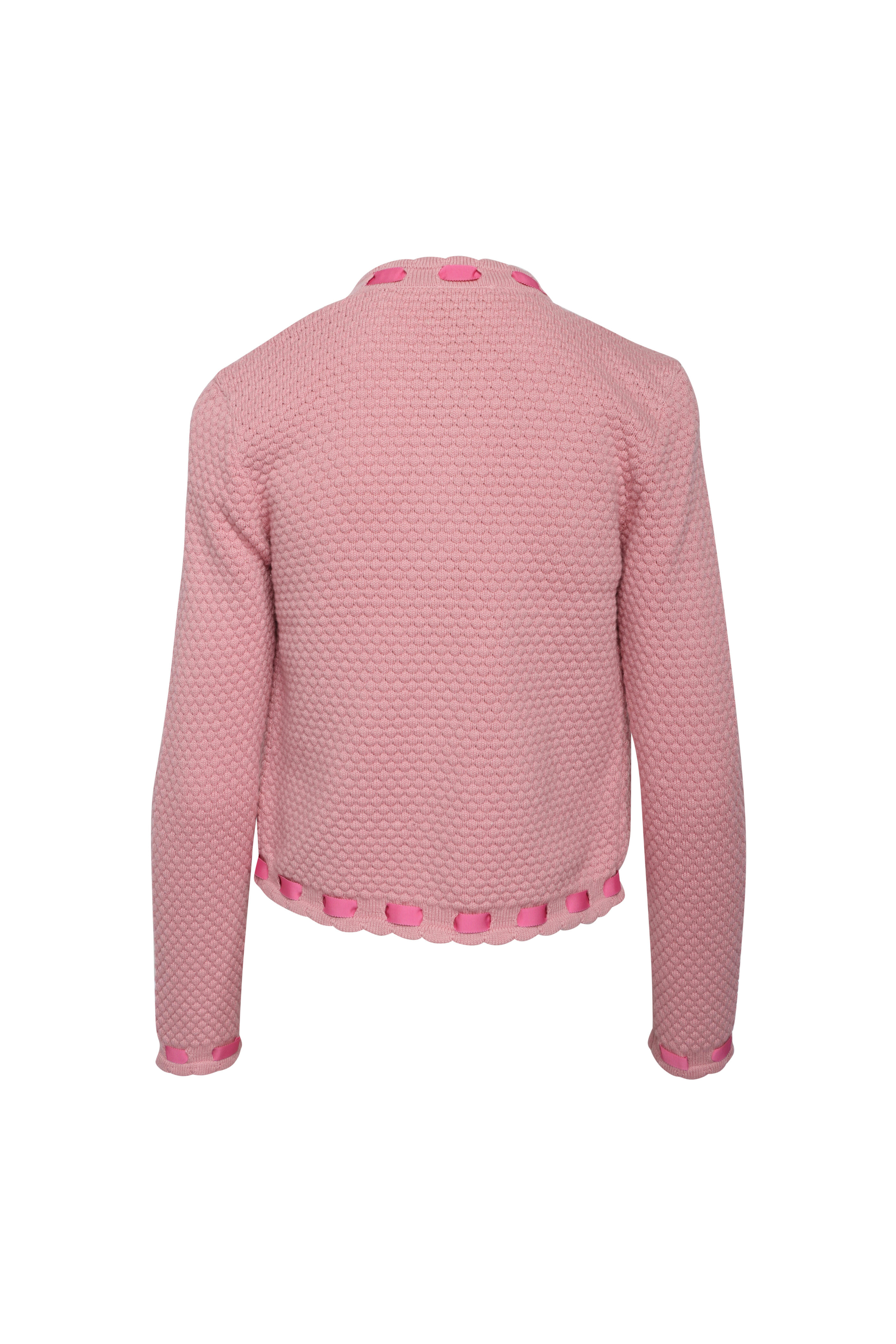 Round neck. Structured shoulders. Long sleeves. Open front. Chest welt pockets. Hip welt pockets. Contrast ribbon trim detail. Imported. 60% cotton, 30% nylon, 10% wool. Dry clean.