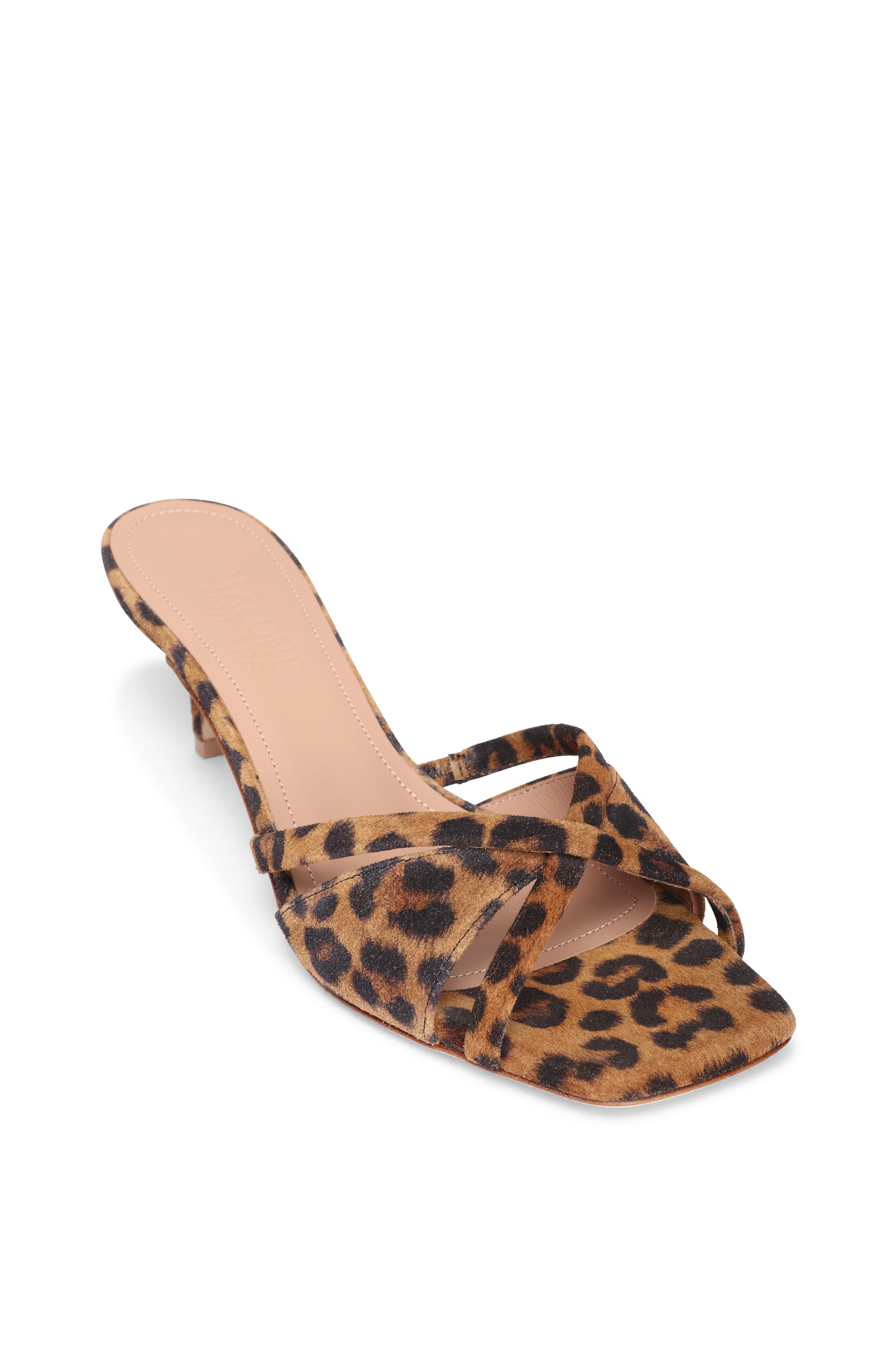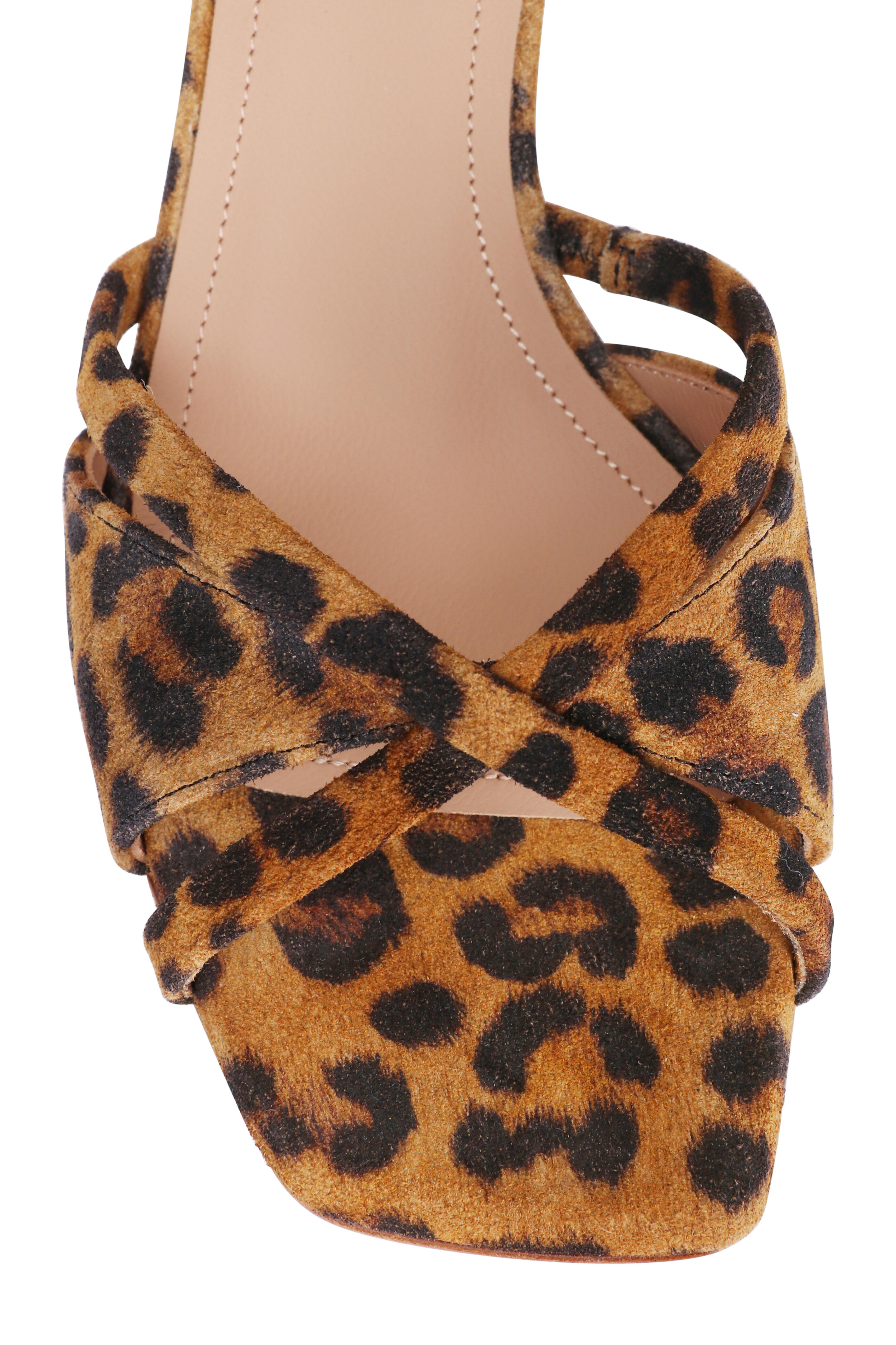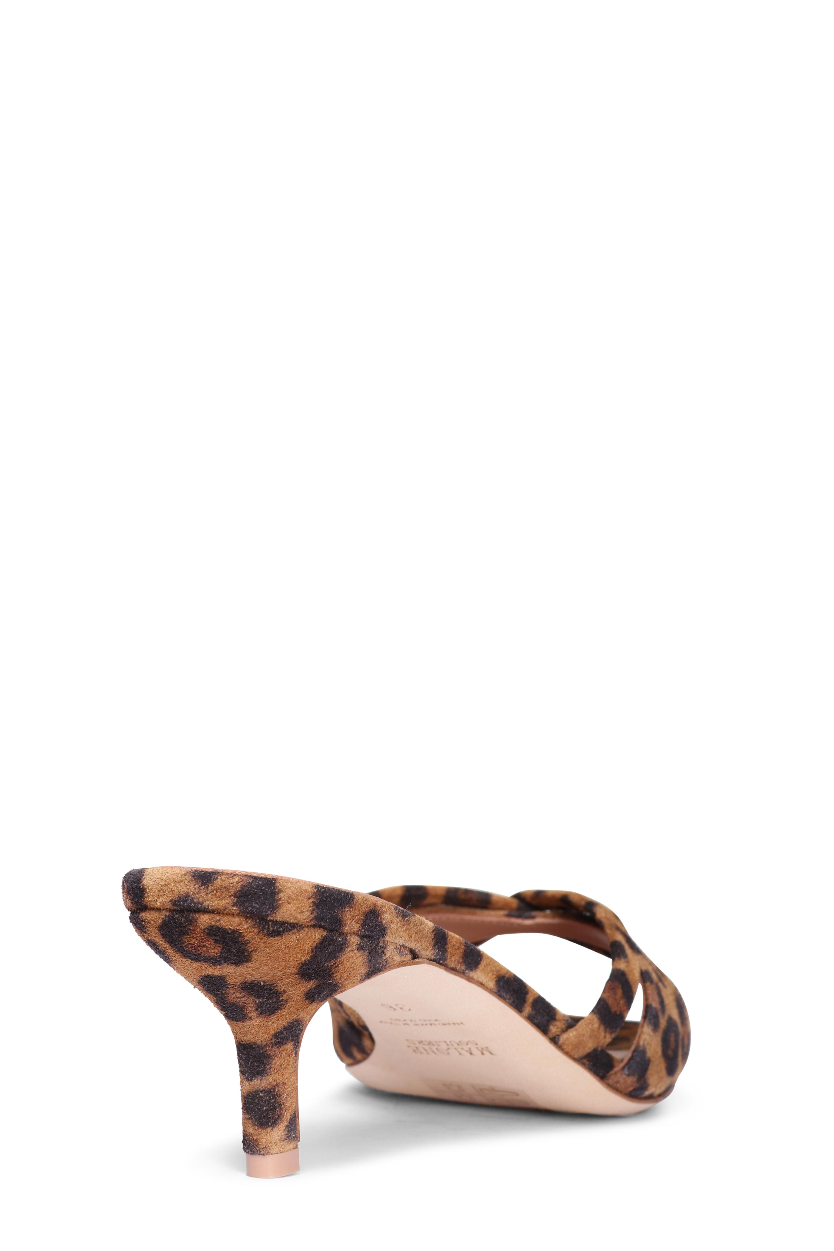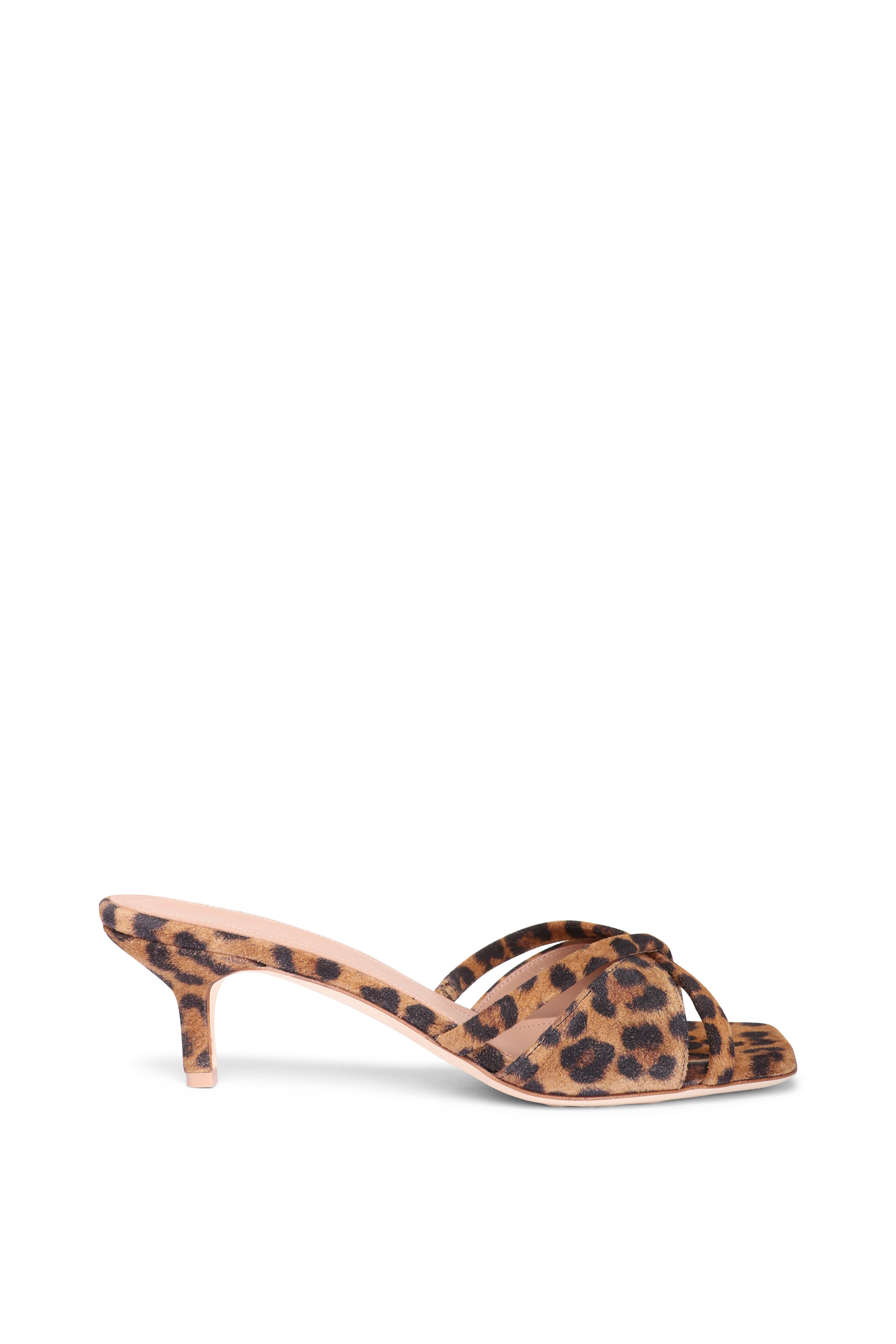 Suede upper. Leather lining and sole. Open square toe. Slip-on style. Criss-cross vamp. Leopard design. Made in Italy. Heel measurement: 45mm.