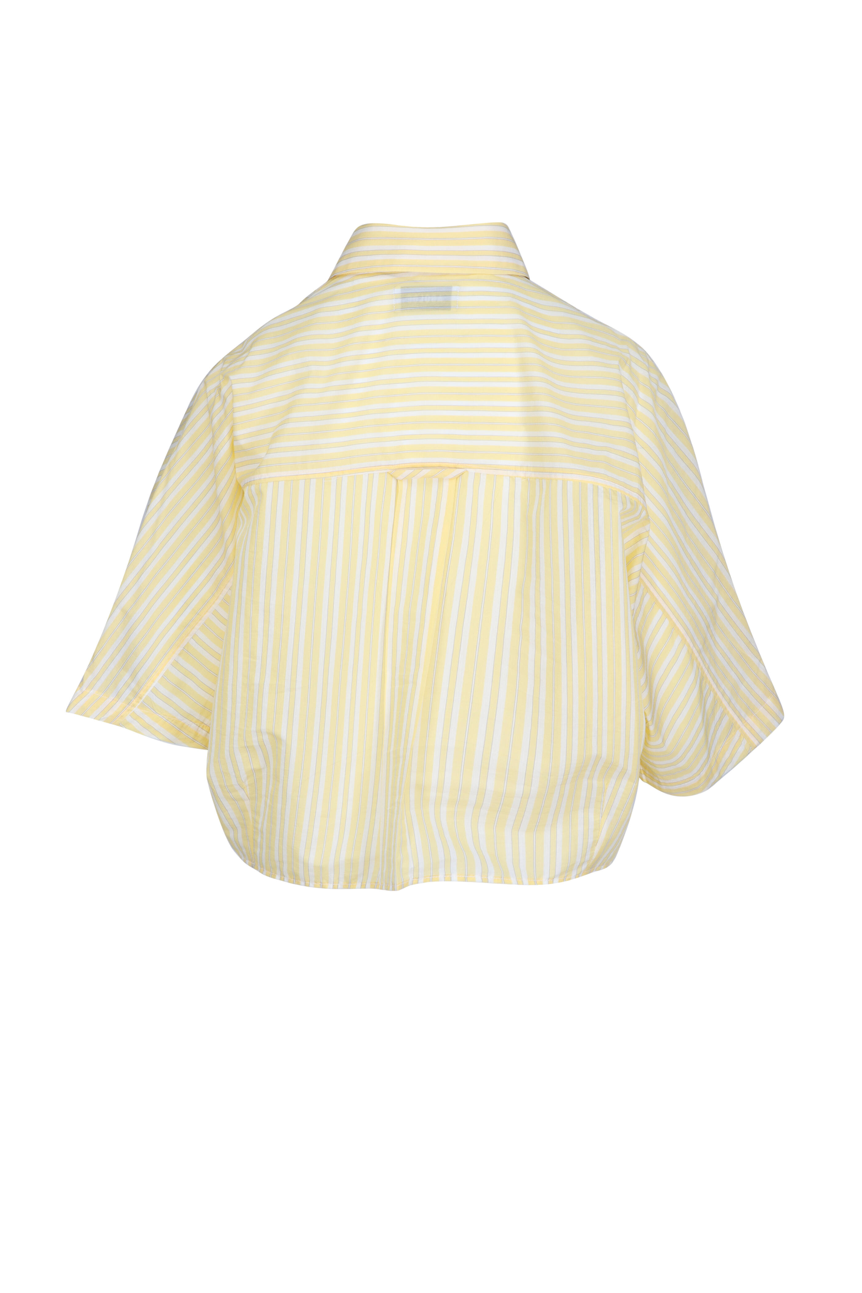 Point collar. Front button closure. Elbow-length sleeves. Imported. Boxy fit. 74% cotton, 26% nylon. Machine wash.