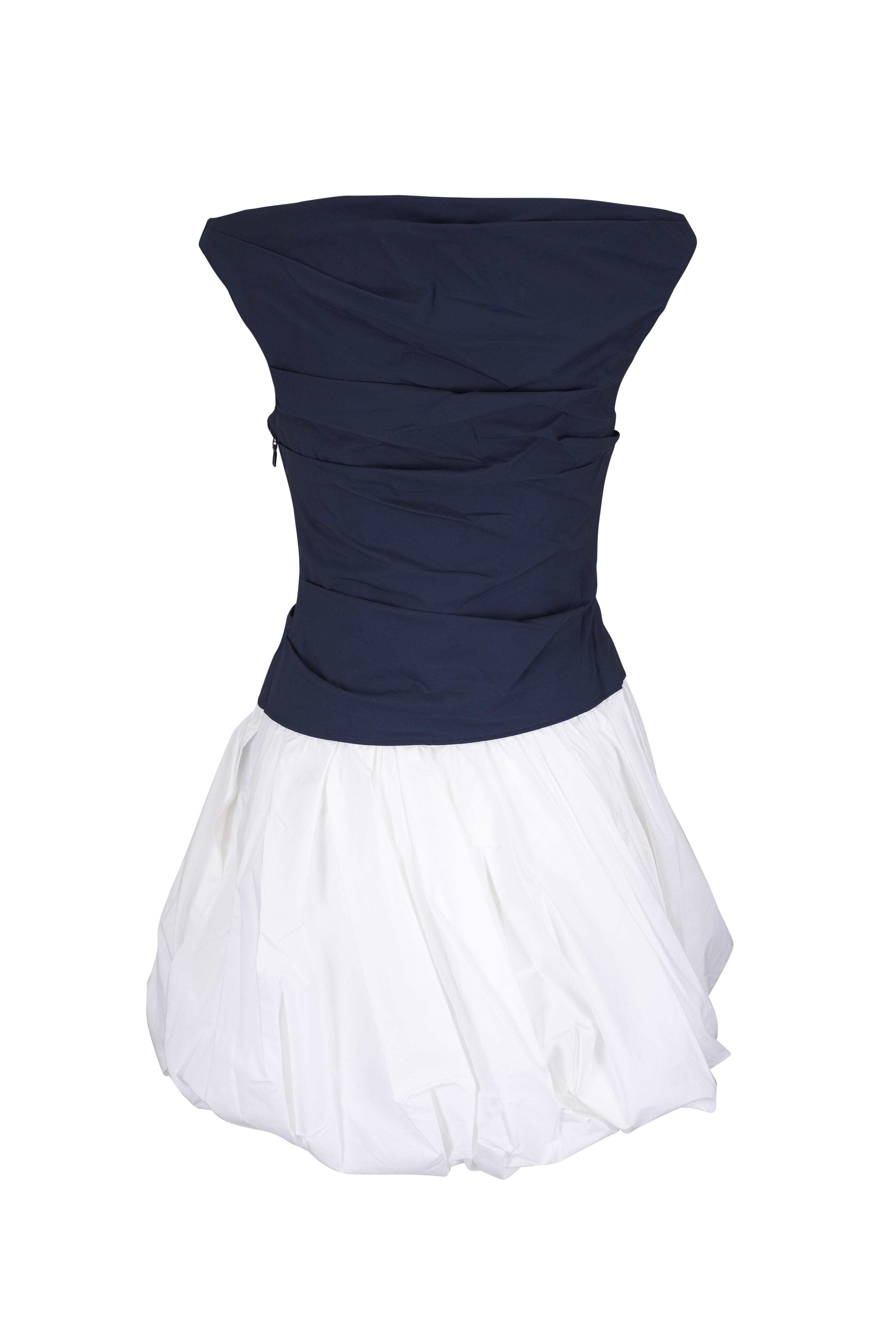 Boat neckline. Sleeveless. Side zip. Softly ruched bodice. Imported. 63% Cotton, 37% Polyester. Dry clean.