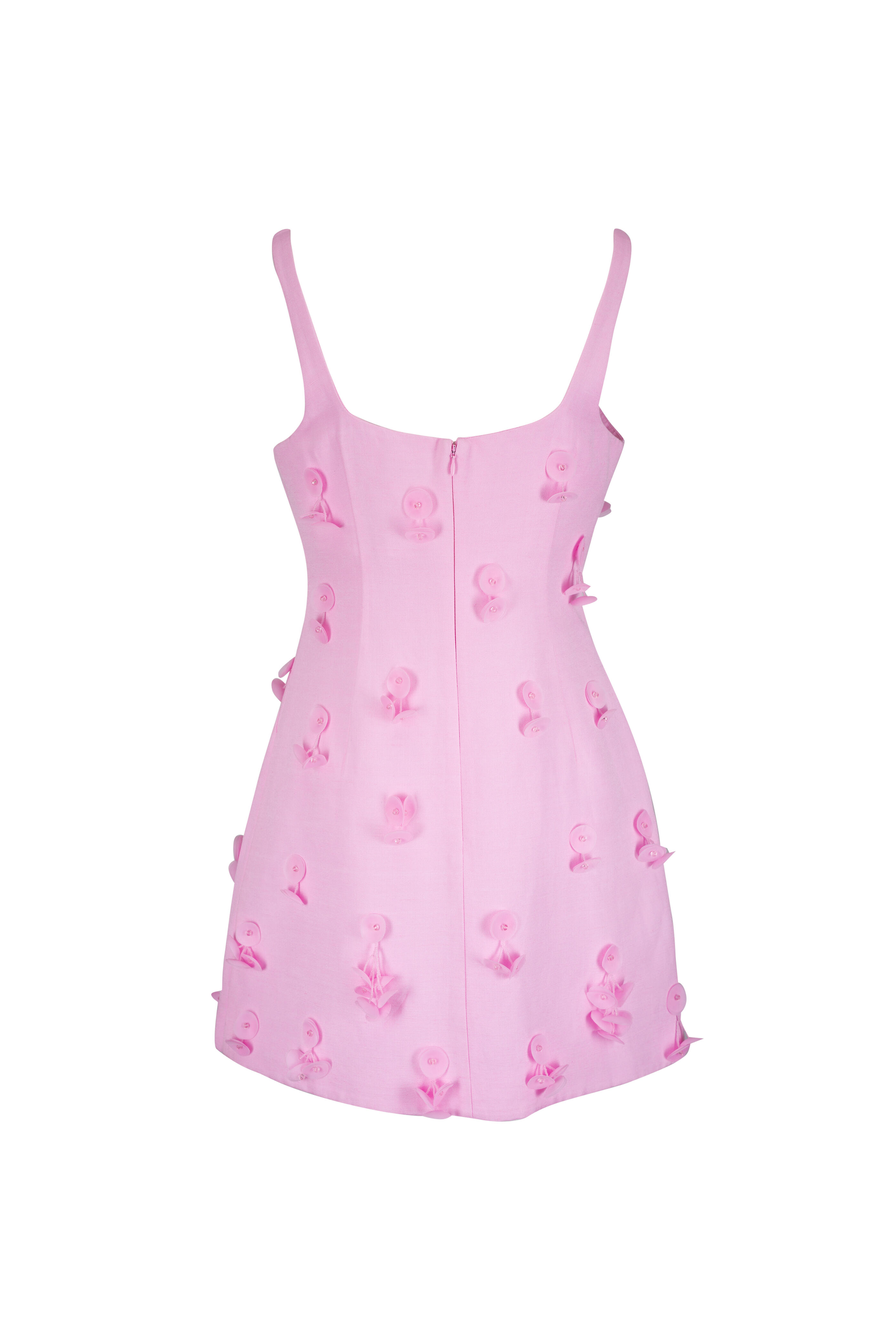 Square neckline. Concealed back zip. All over dimensional floral appliqués. Imported. 33" shoulder to hem. 65% linen 35% viscose; lined: 100% cotton. Dry clean.