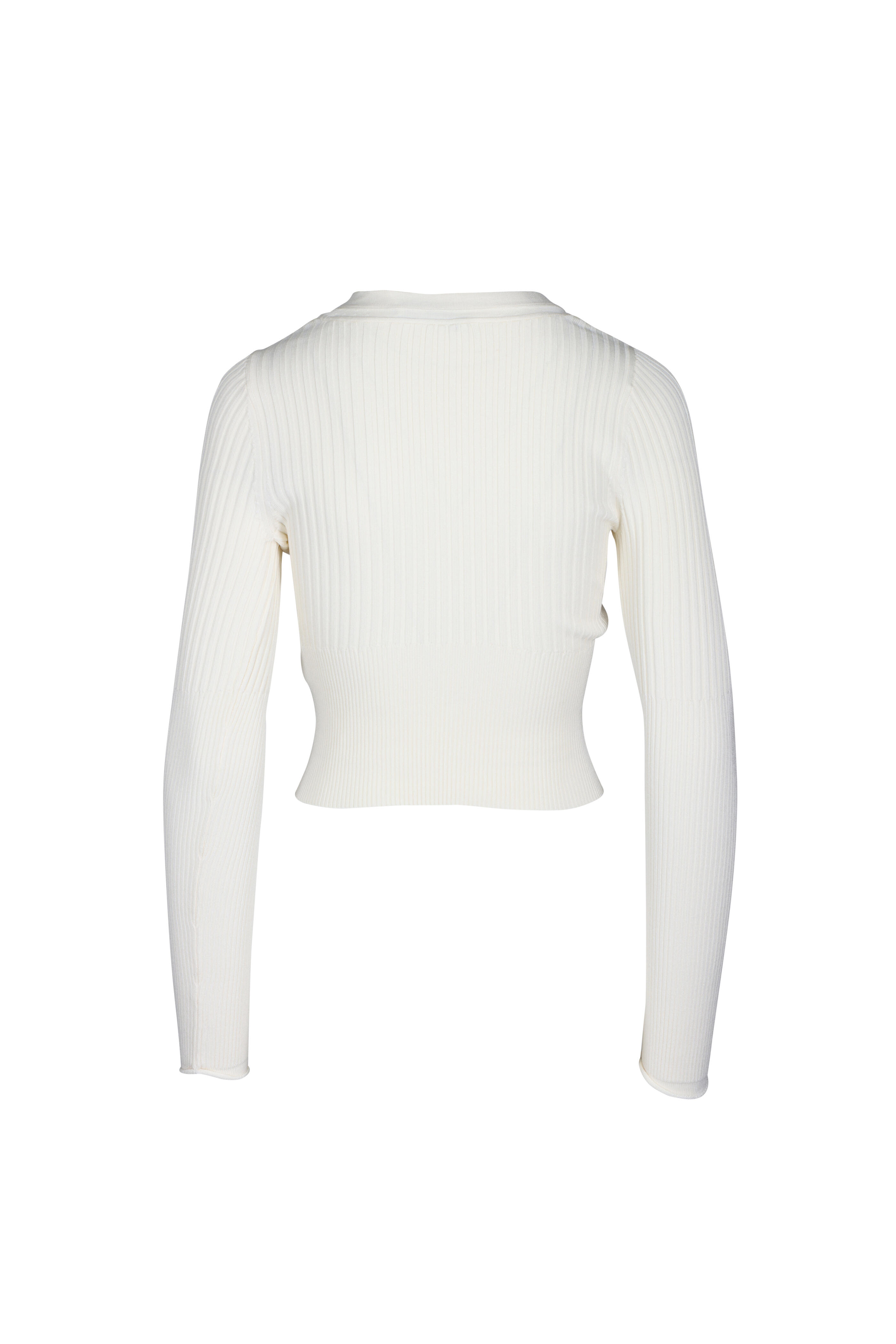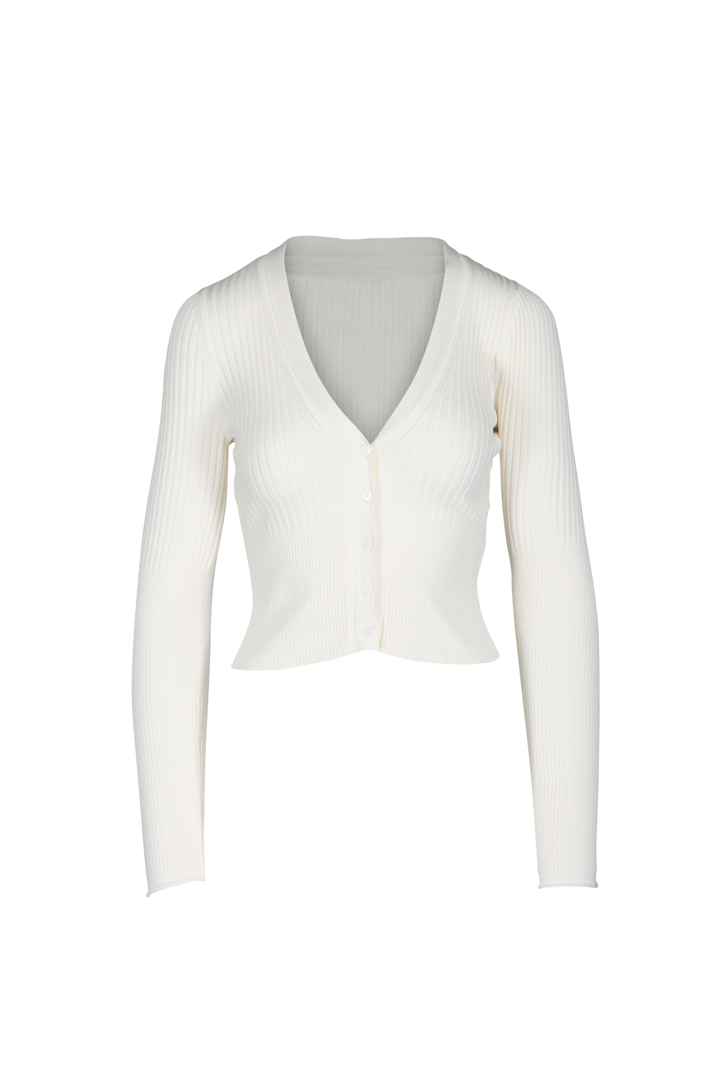 Spread collar. Front button placket. Ribbed throughout. Imported. 72% rayon, 27% nylon, 1% spandex. Dry clean.