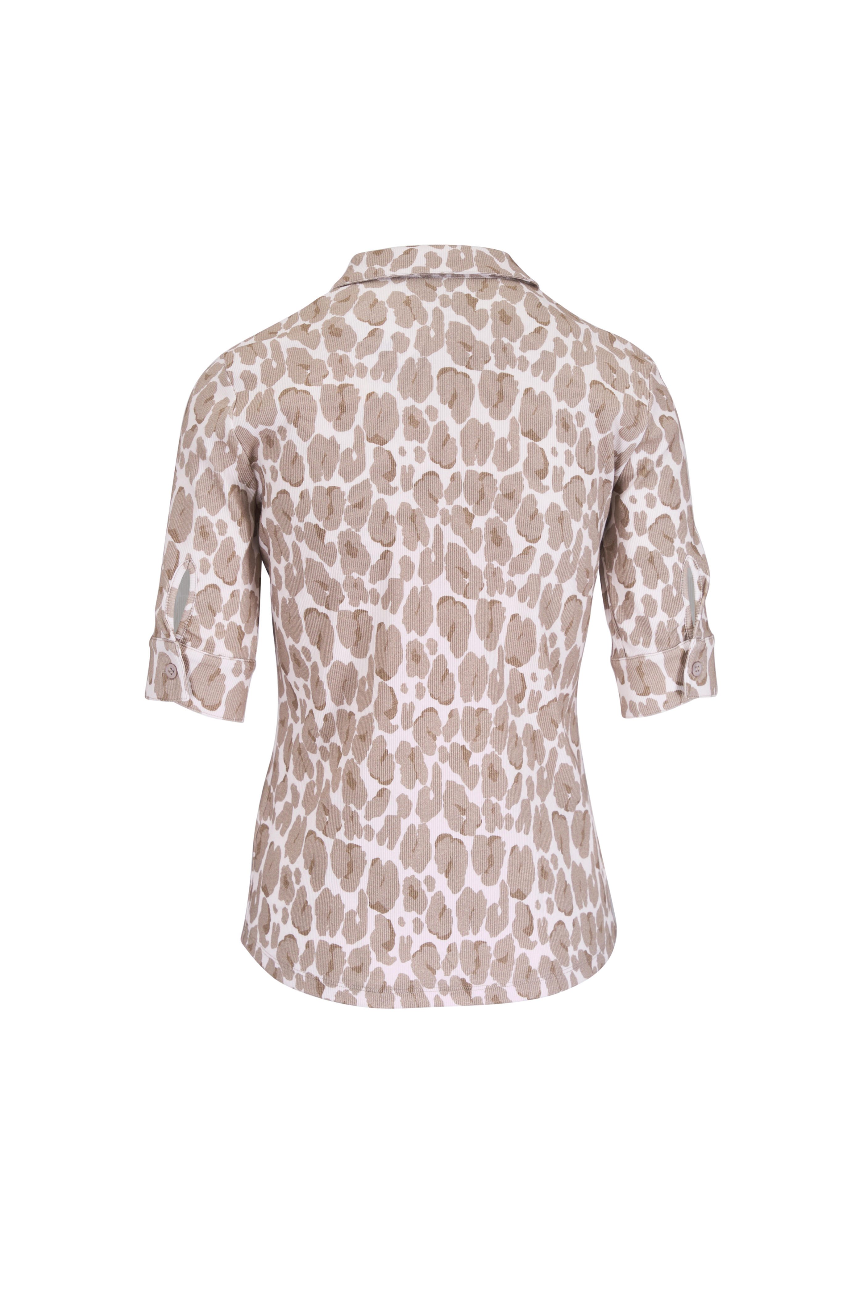 Spread collar. Front button placket. Three quarter sleeves; single button cuffs. Made in Portugal. 97% organic cotton, 3% elastane. Machine wash.