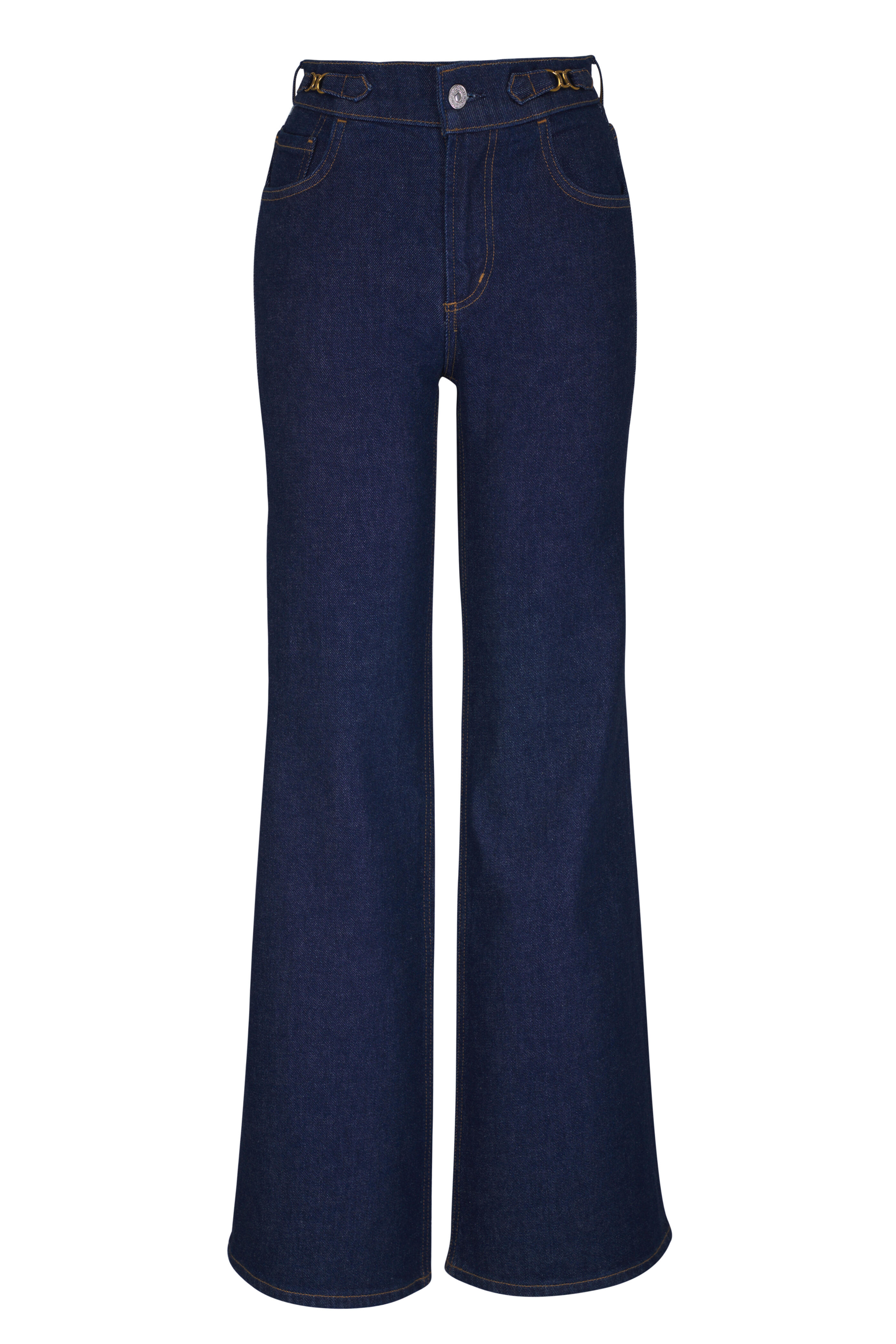 Zip fly; button closure. Banded waist; belt loops. Five pocket styling. Horsebit detailing at the waistband. Imported. Inseam: 32". Leg Opening: 24". Rise: 11". 99% regenerative cotton, 1% elastane. Machine wash.