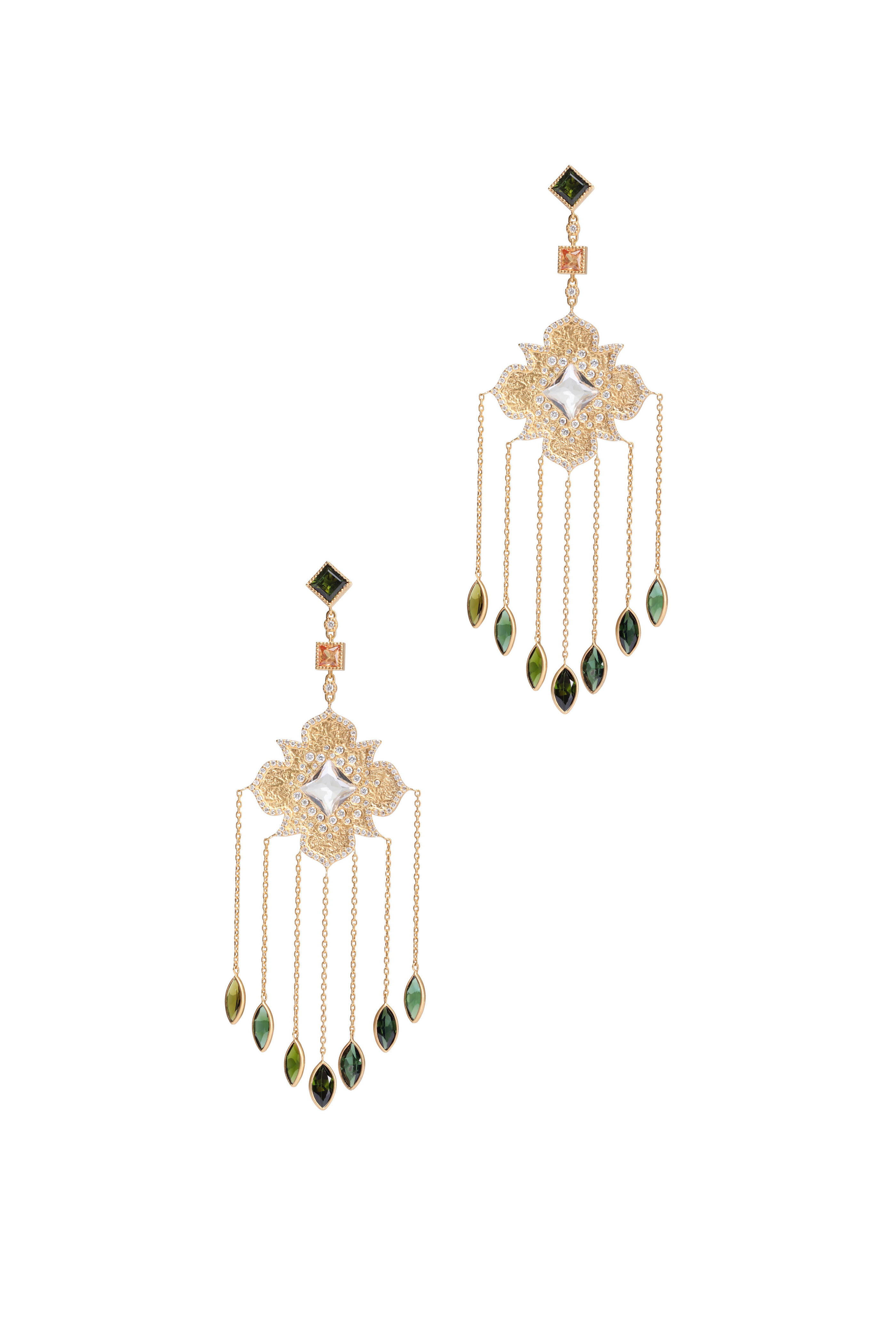 20k gold. Diamond. Green tourmaline. Mixed cut gemstones. Engraved detailing. Diamond halo. Green tourmaline stud. Cable chain links. Drop style. Push back post. One of a kind. Handmade. Based in New York.