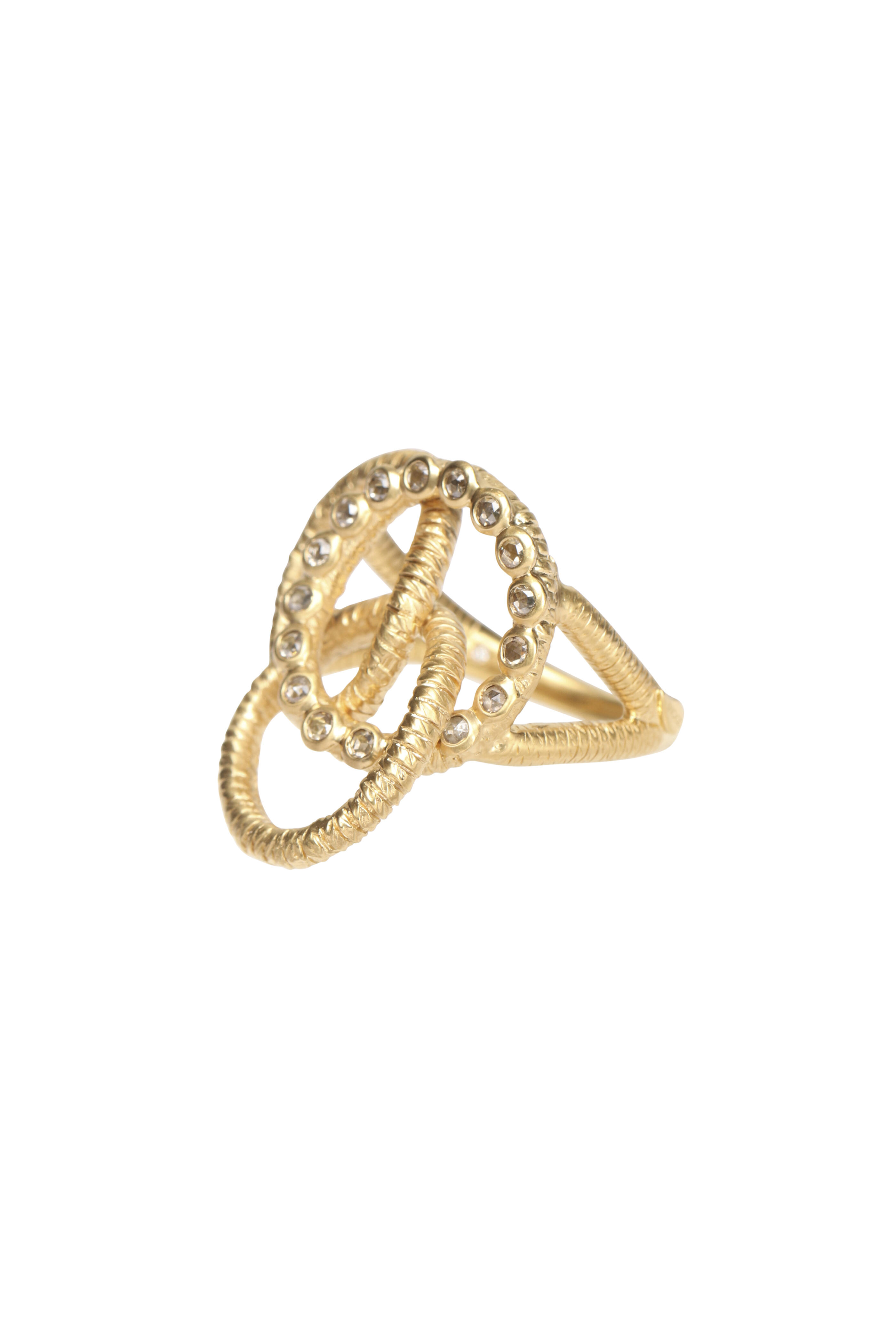 20k gold. Diamond 0.46 total carat weight. Three rings wrapped together. Engraved detailing. Gold bezel. One of a kind. Handmade. Based in New York. Call for ring size.