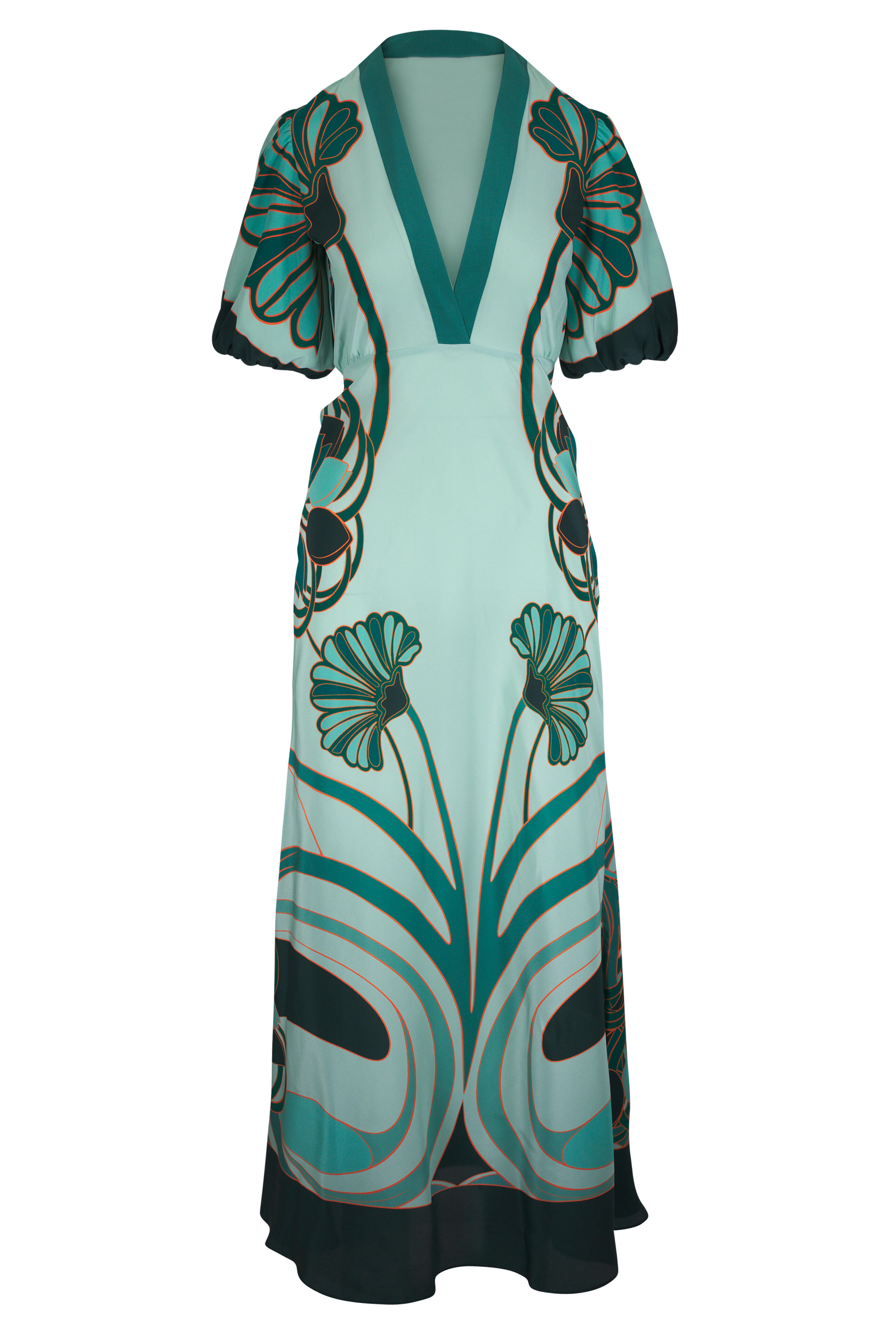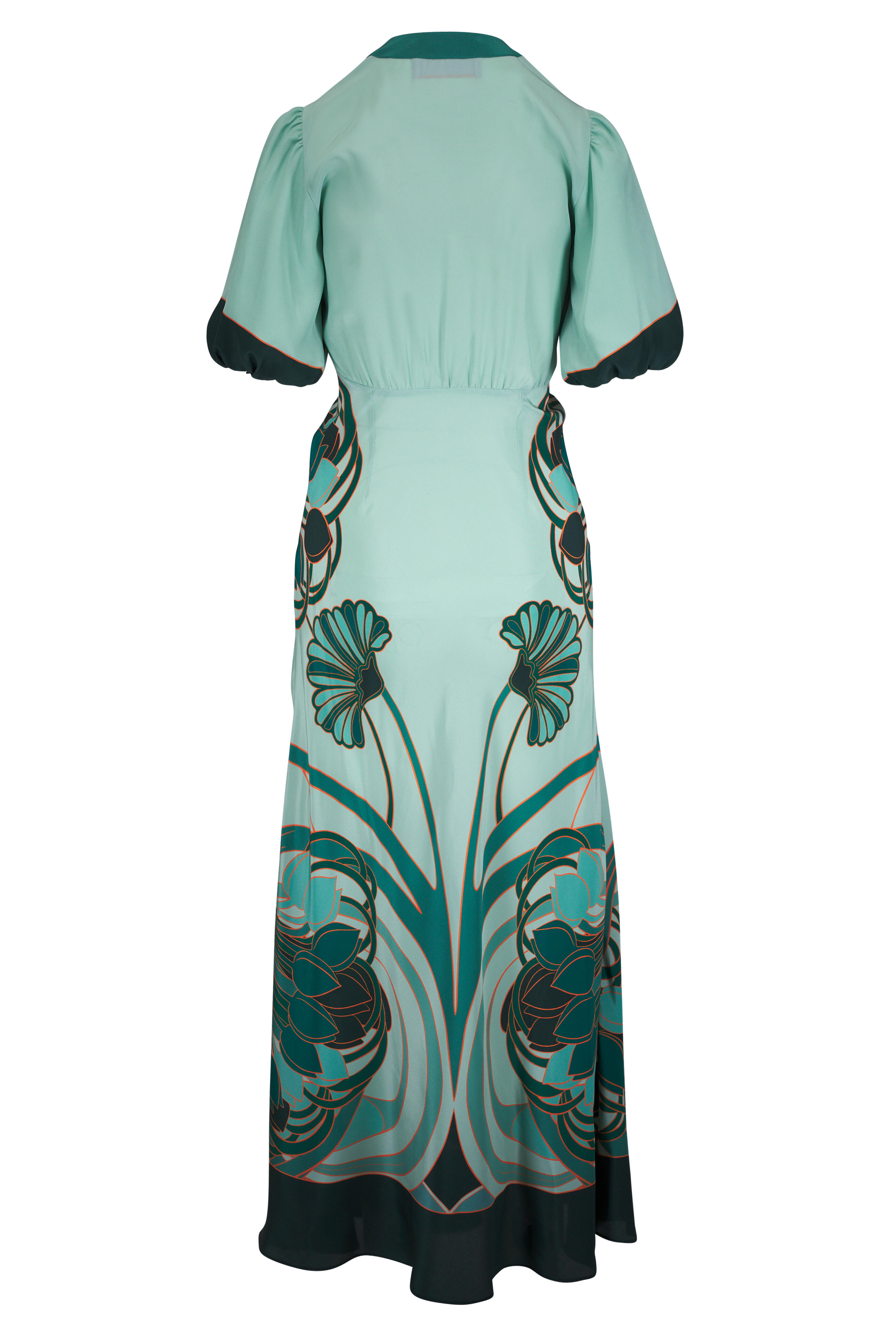 V-neckline. Concealed side zip. Cinched cuffs. Straight hem. Made in Italy. 56" shoulder to hem. 100% silk. Dry clean.