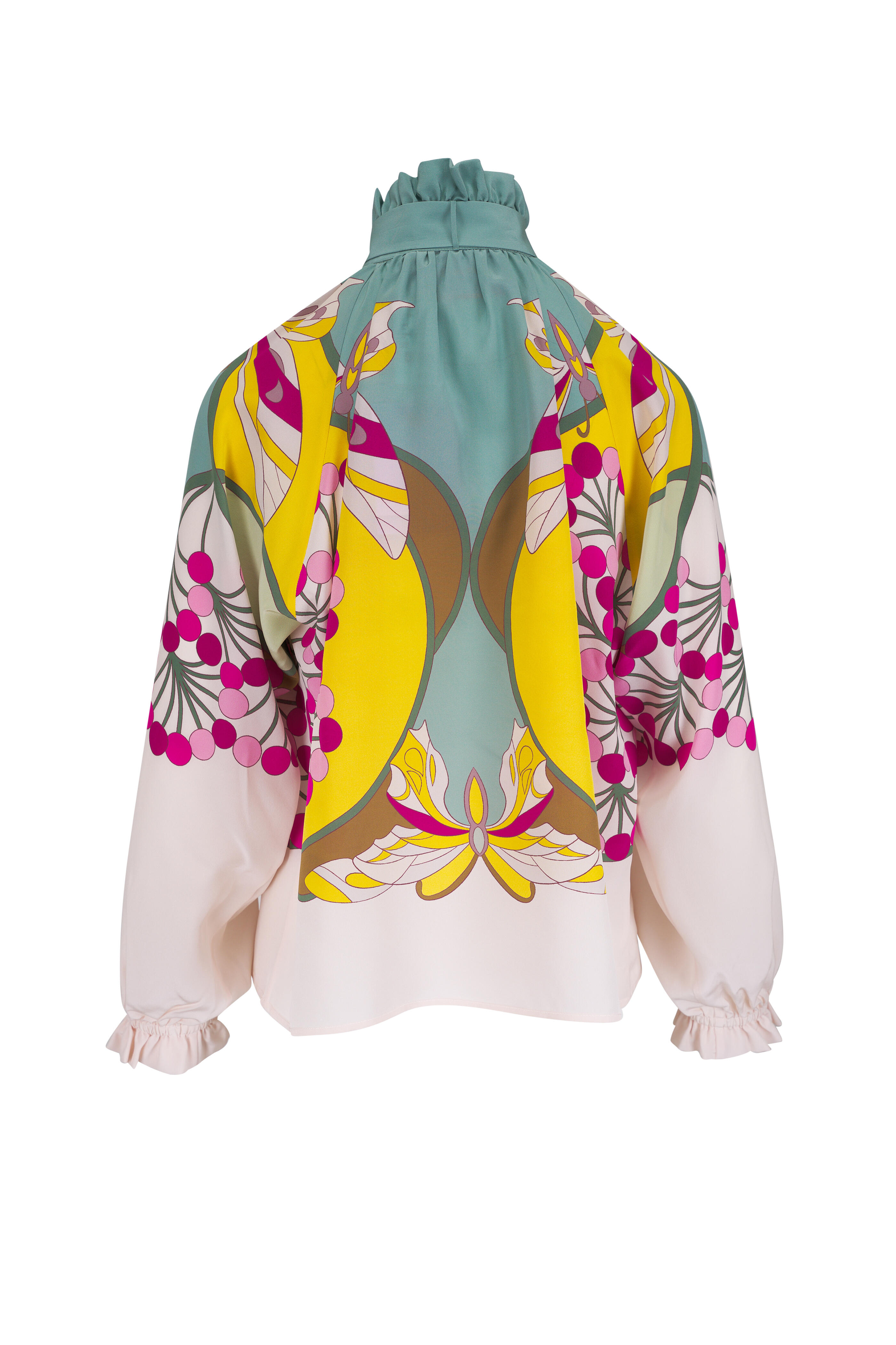 High ruffle neckline; attached self tie. Elasticized ruffle cuffs. Made in Italy. 100% silk. Dry clean.