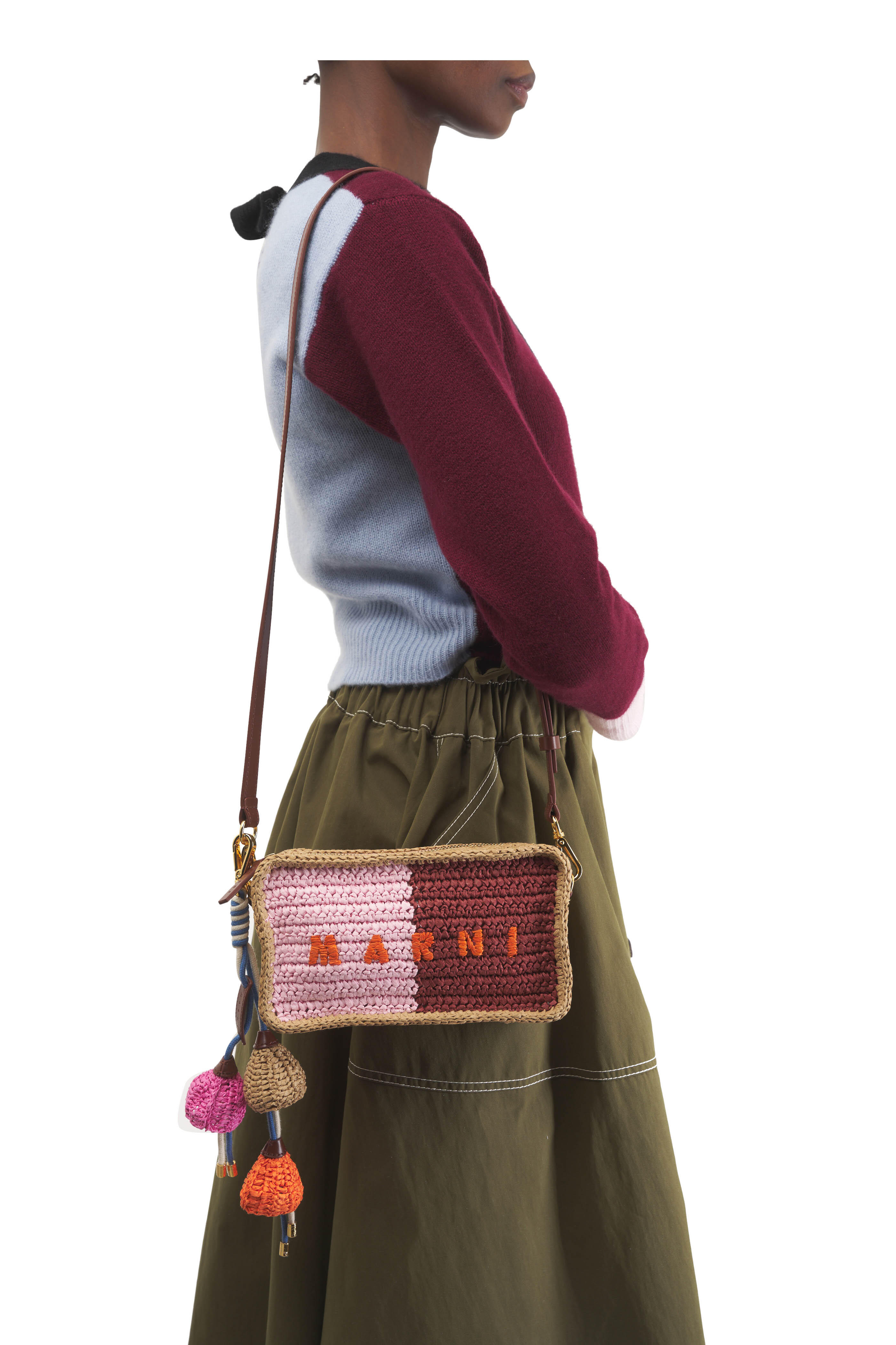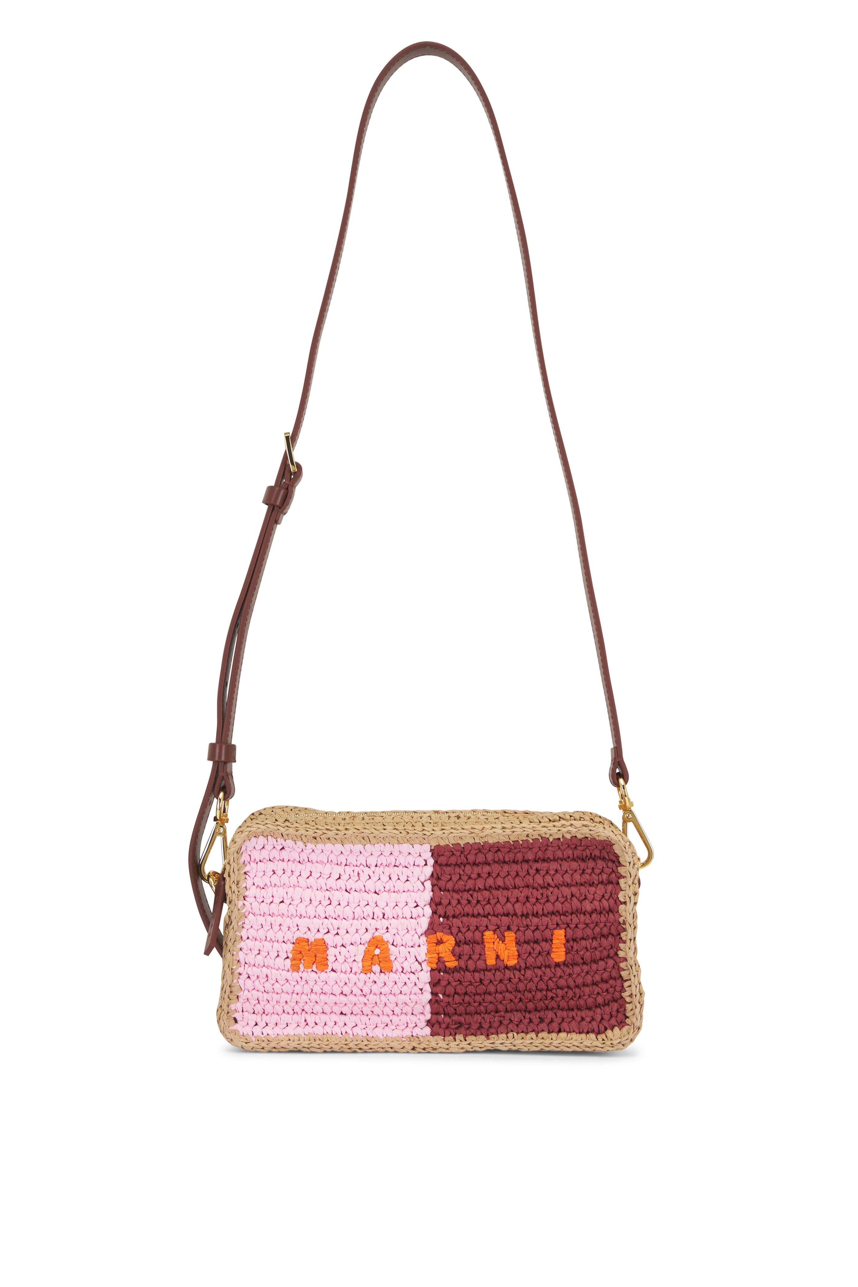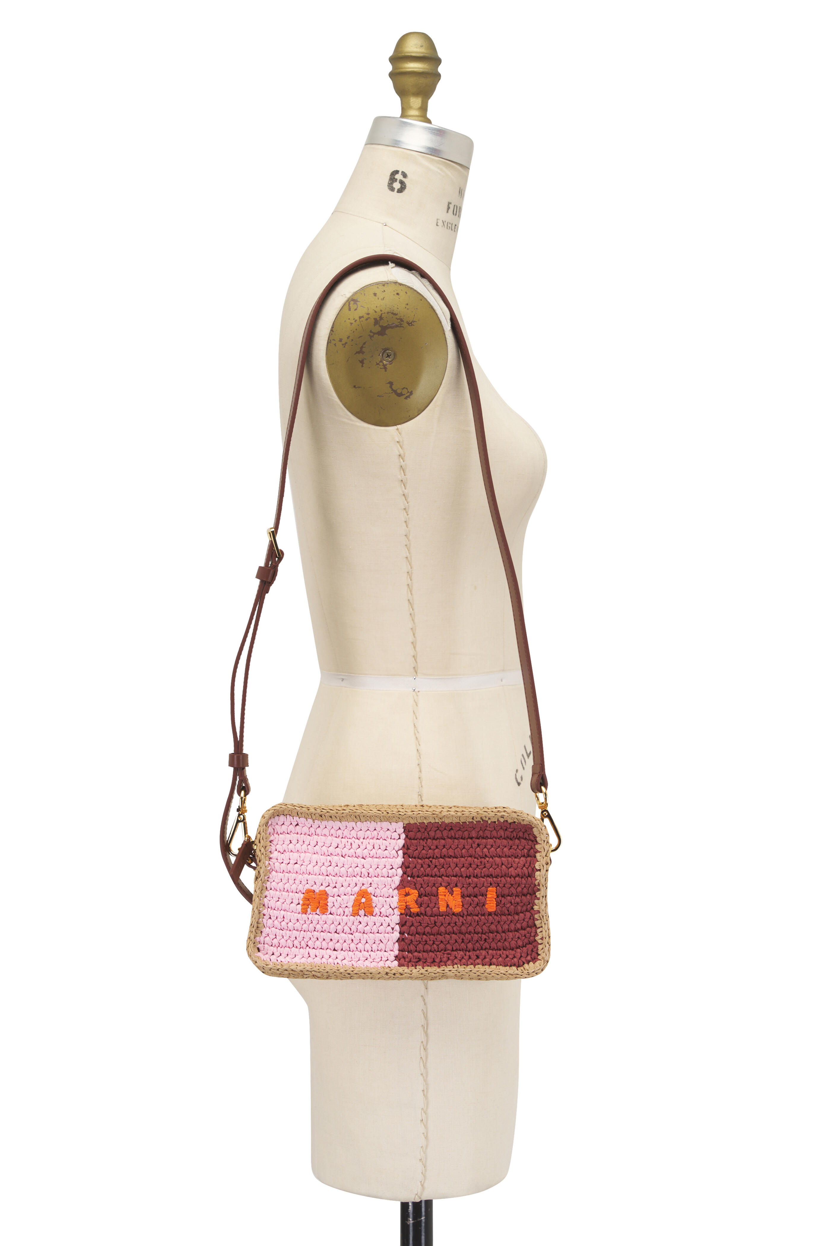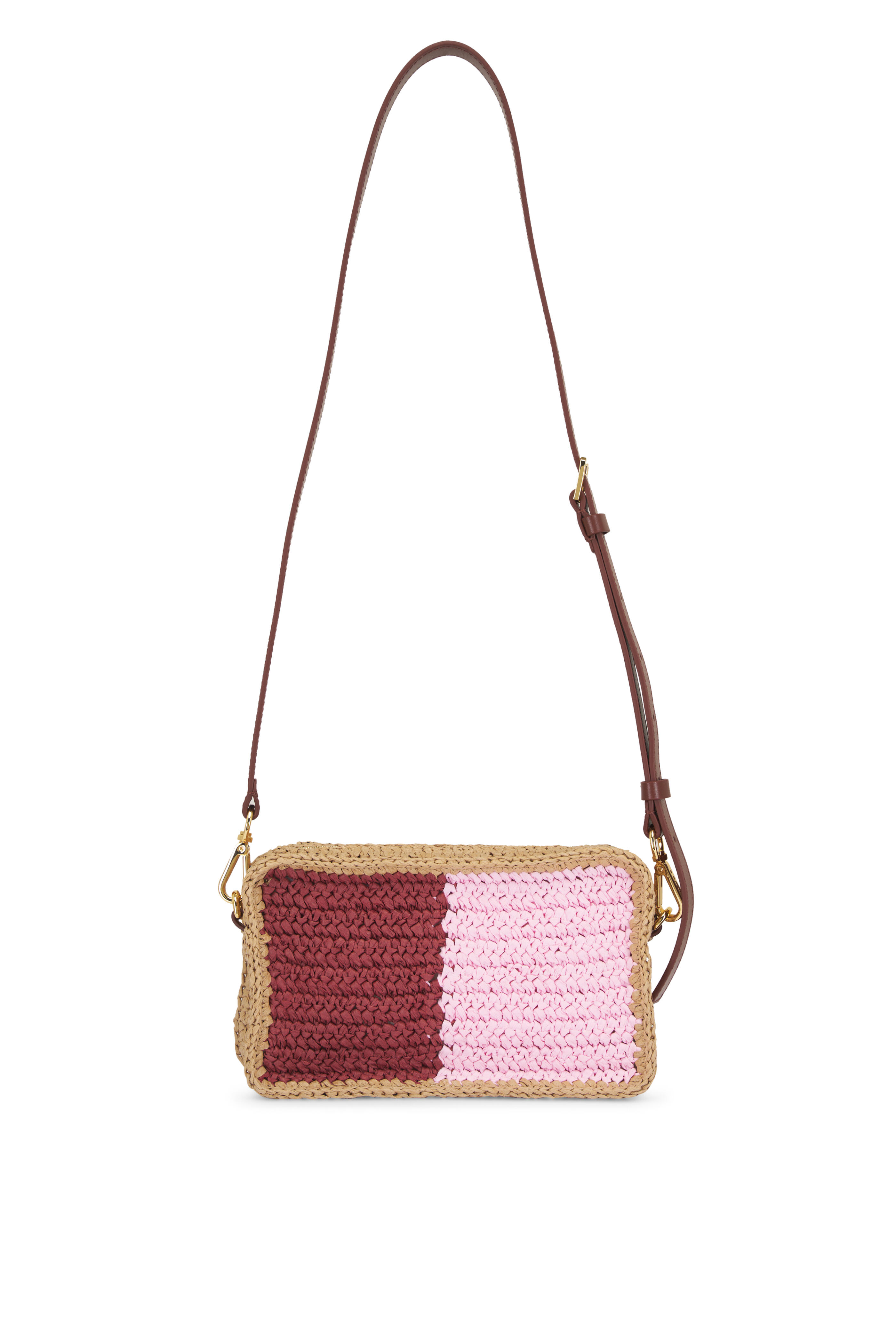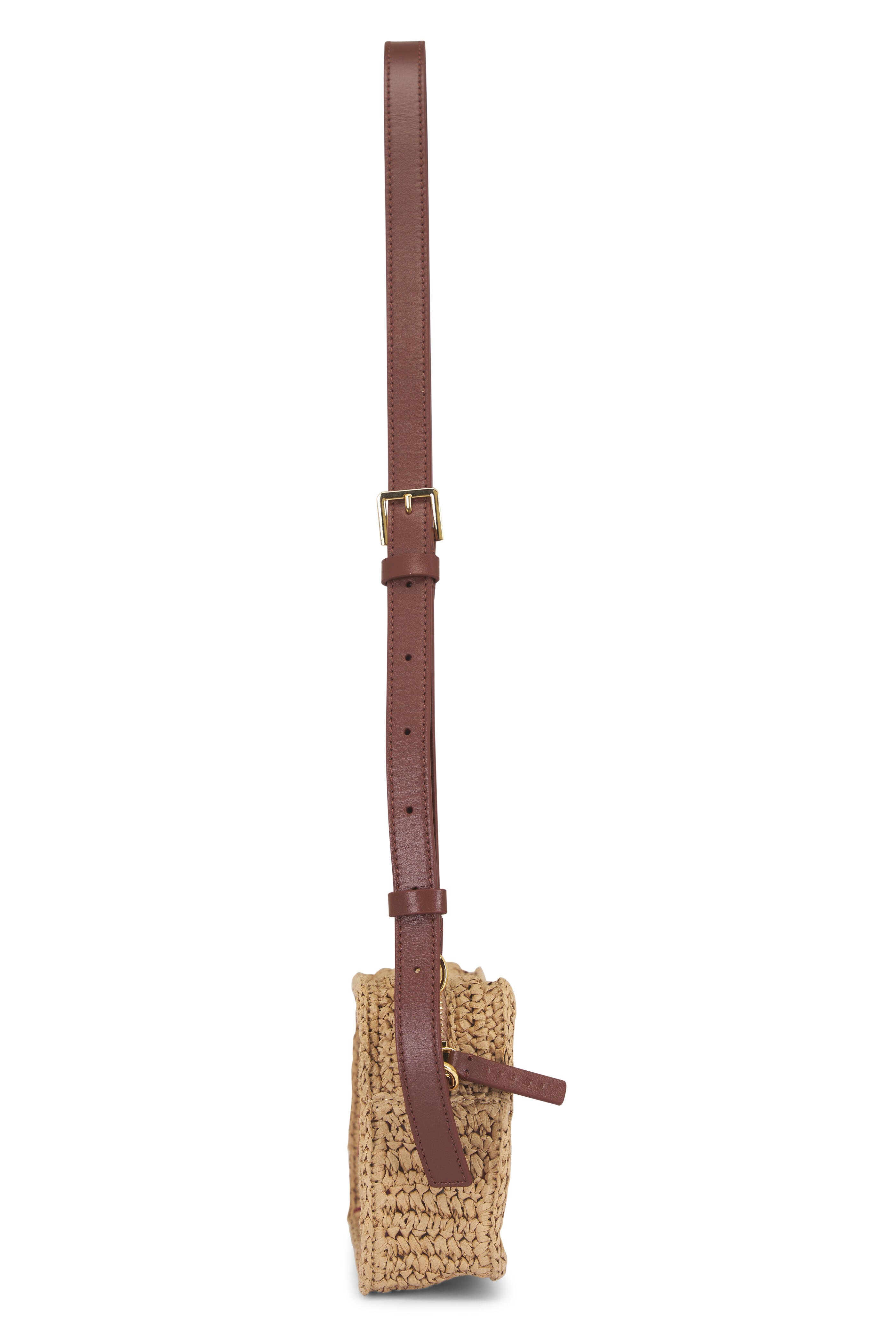 Cotton. Removable and adjustable leather shoulder strap. Top zip closure. Interior slip pocket. Leather trim. Raffia palm application. Cotton lining. Imported. Color: Pompeii, Wild Cherry, Carrot, Rose. Height: 5.5". Length: 8.66". Width: 2.56". Shoulder strap length: 54.72".