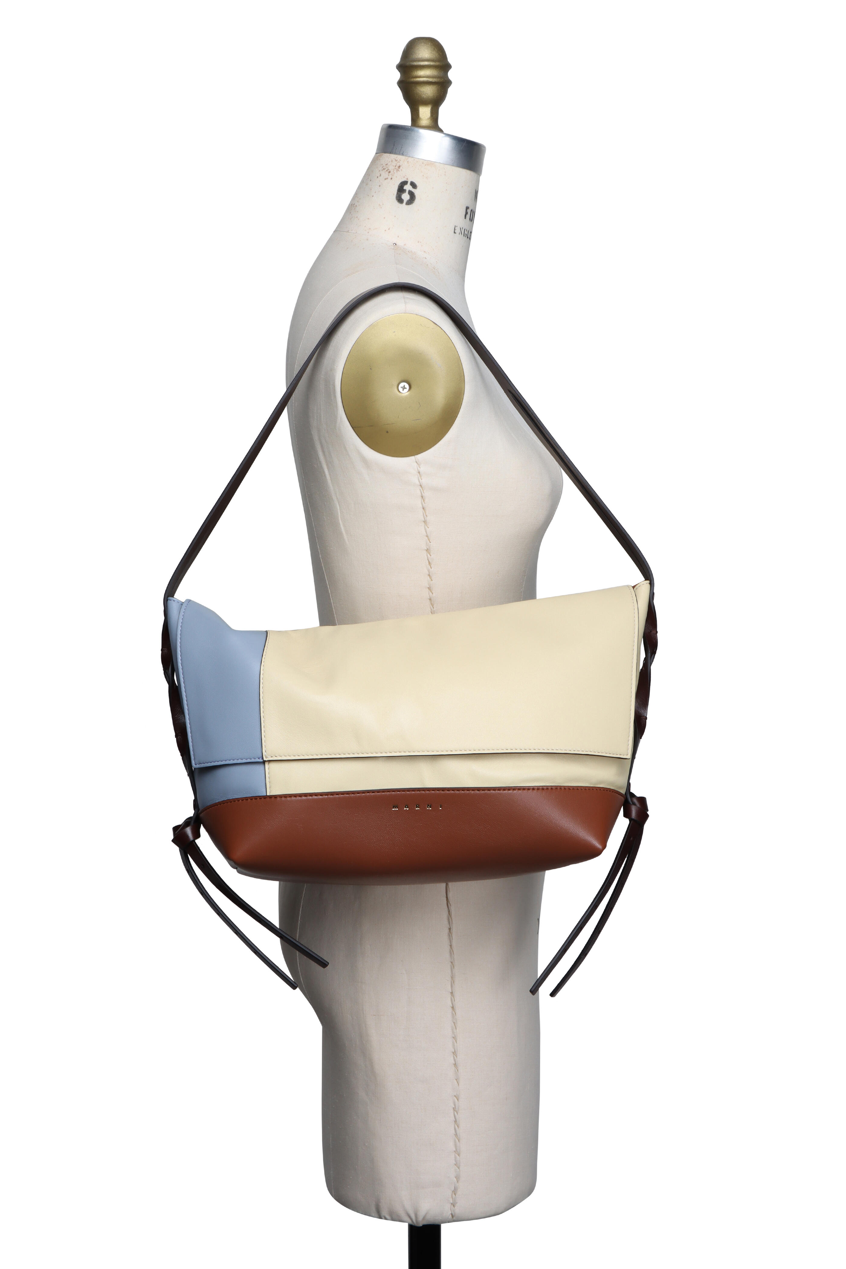 Lambskin leather outer. Cotton & acrylic lining. Fold over flap; magnetic closure. Single split leather top handle. Hand-finished twist, stiches, and knots on each side. Gold foil logo detail. Interior wall zip pocket. Made in Italy. Dimensions: 13.5” W x 6.5” H x 5.5” D. Strap drop: 9.3”.