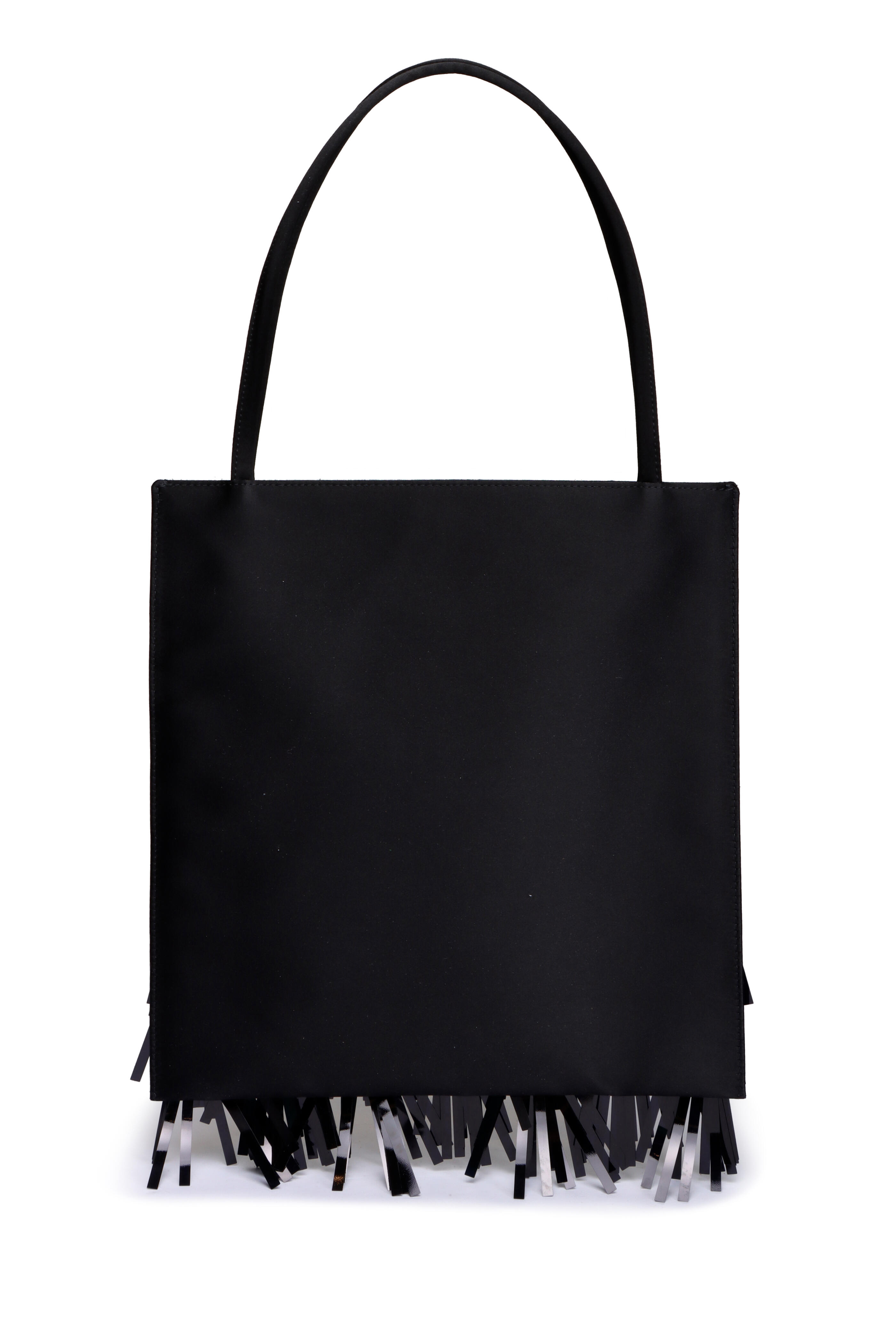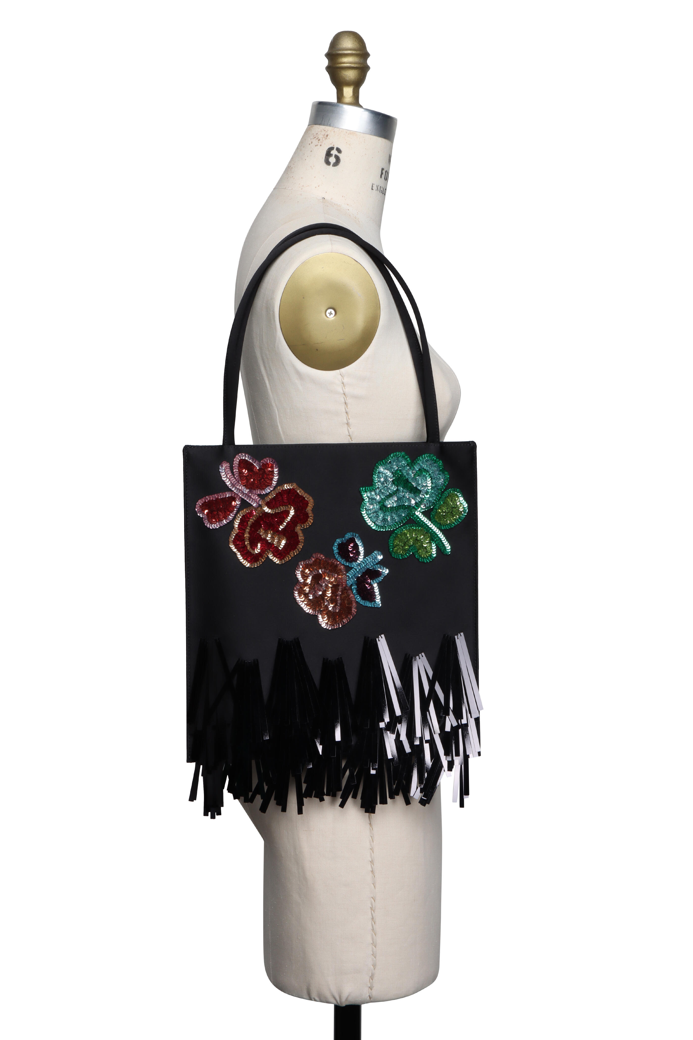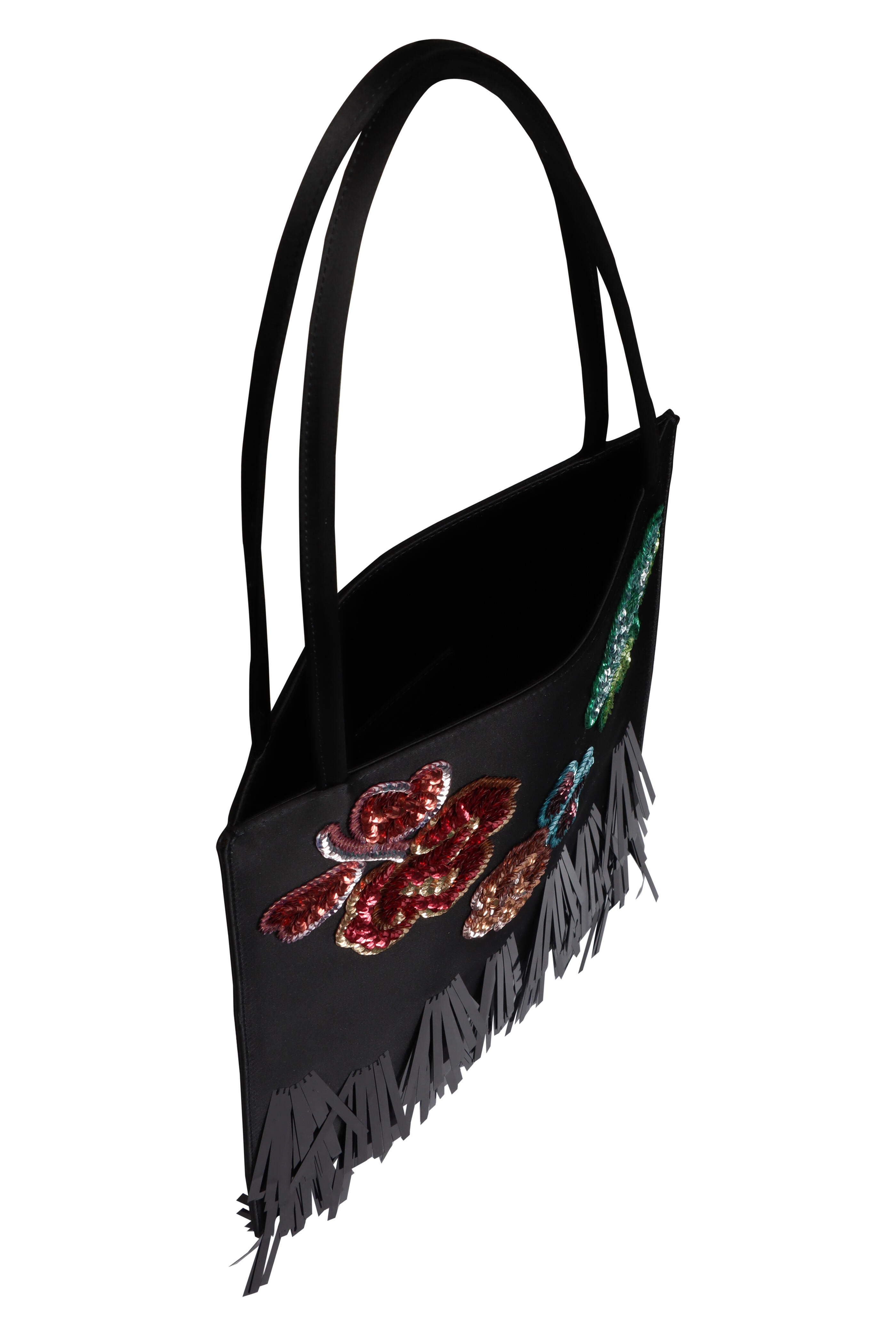 Satin outer and lining. Open top. Dual satin rolled top handles. Featuring floral motifs. Fringed detailing. Made in Italy. Dimensions: 11.6” H x 10.8” W. Handle drop: 8.25”.