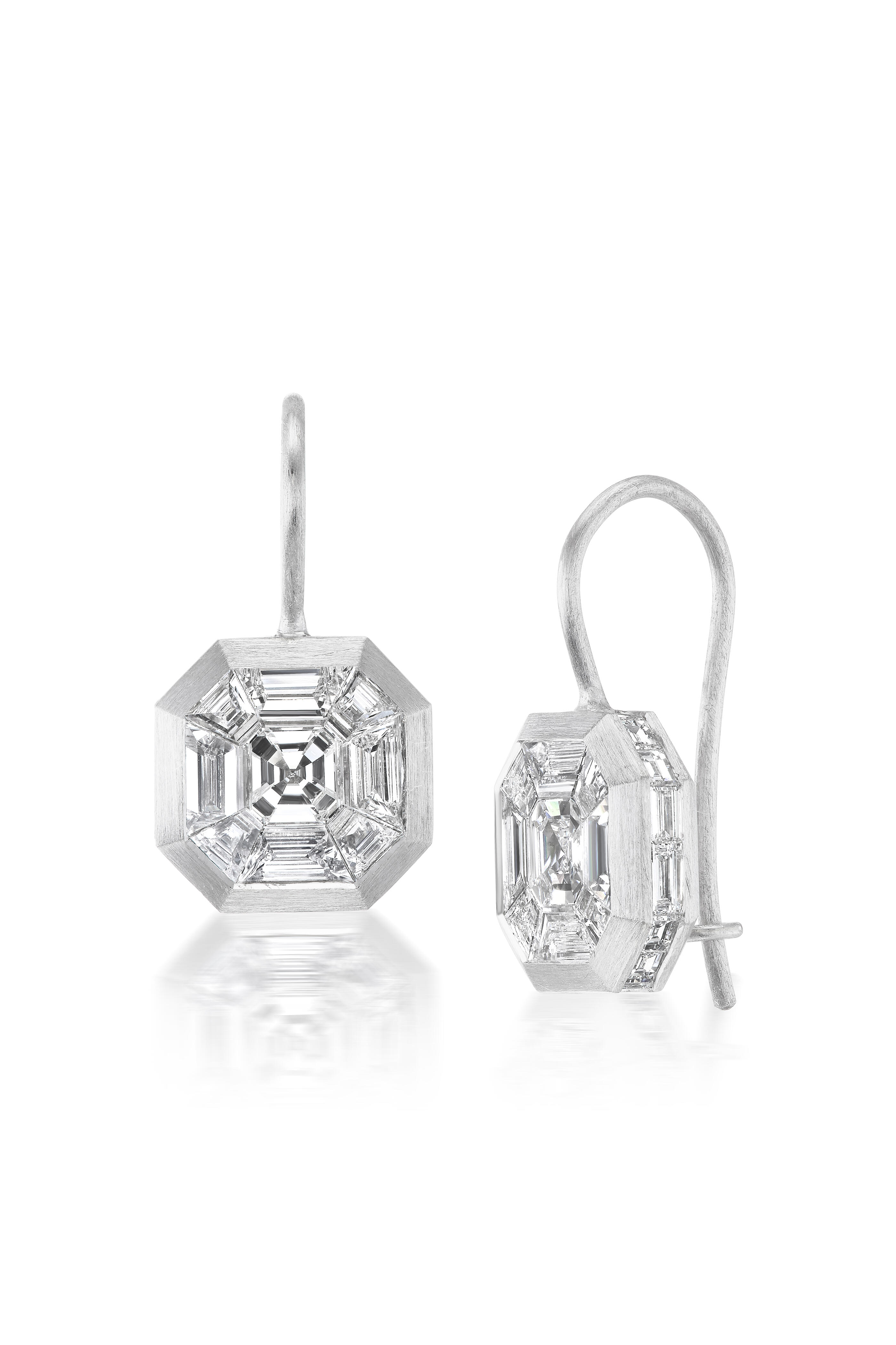 A study in illusion, these drop earrings showcase 3.25 carats of VVS–VS/G–F diamonds, masterfully assembled in an Asscher-cut mosaic that gives the appearance of a single 4-carat stone. The octagonal bezel setting in 18-karat white gold with a satin matte finish frames the composition with refined geometry. Sophisticated and sculptural, they embody understated brilliance with a distinctly modern edge.