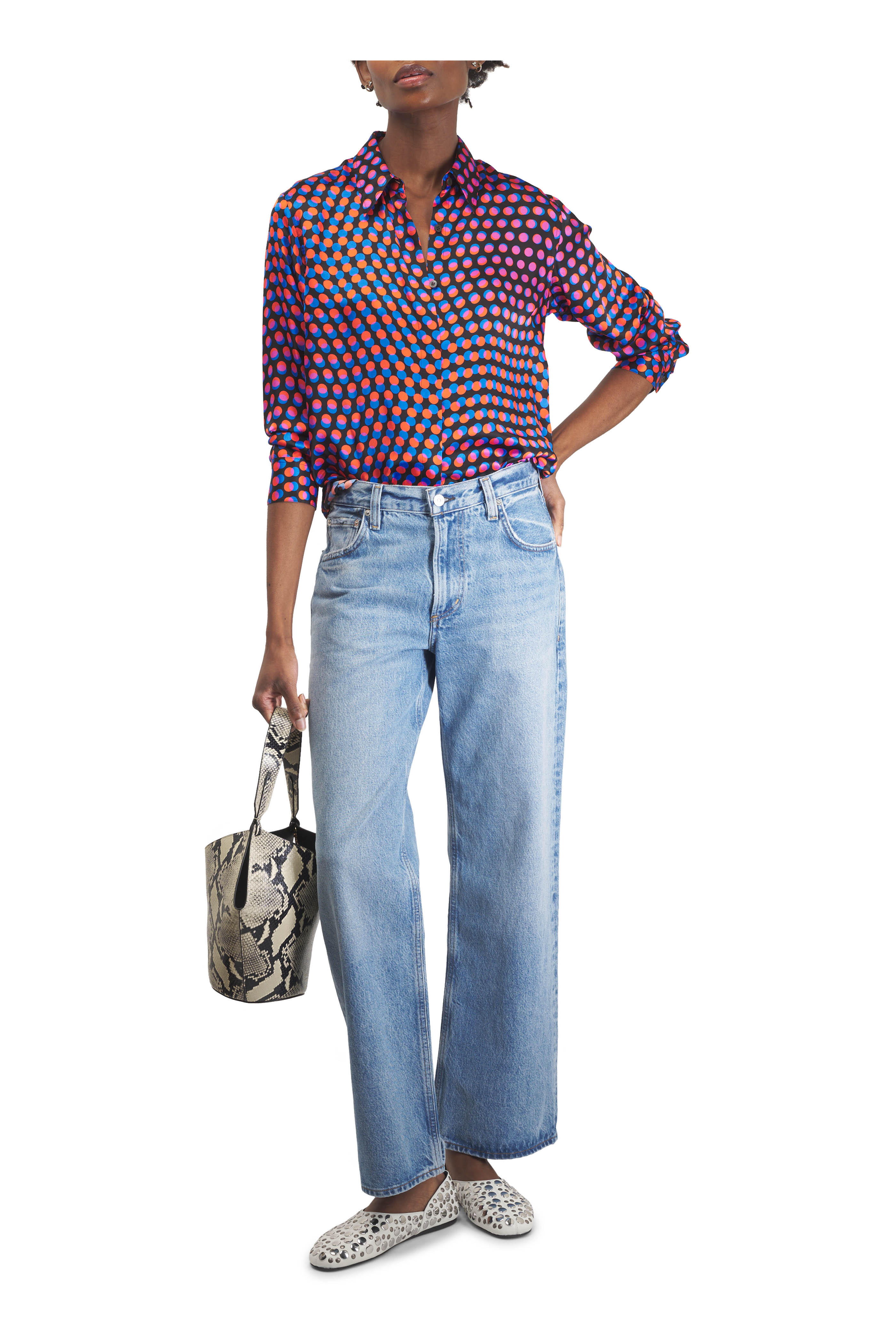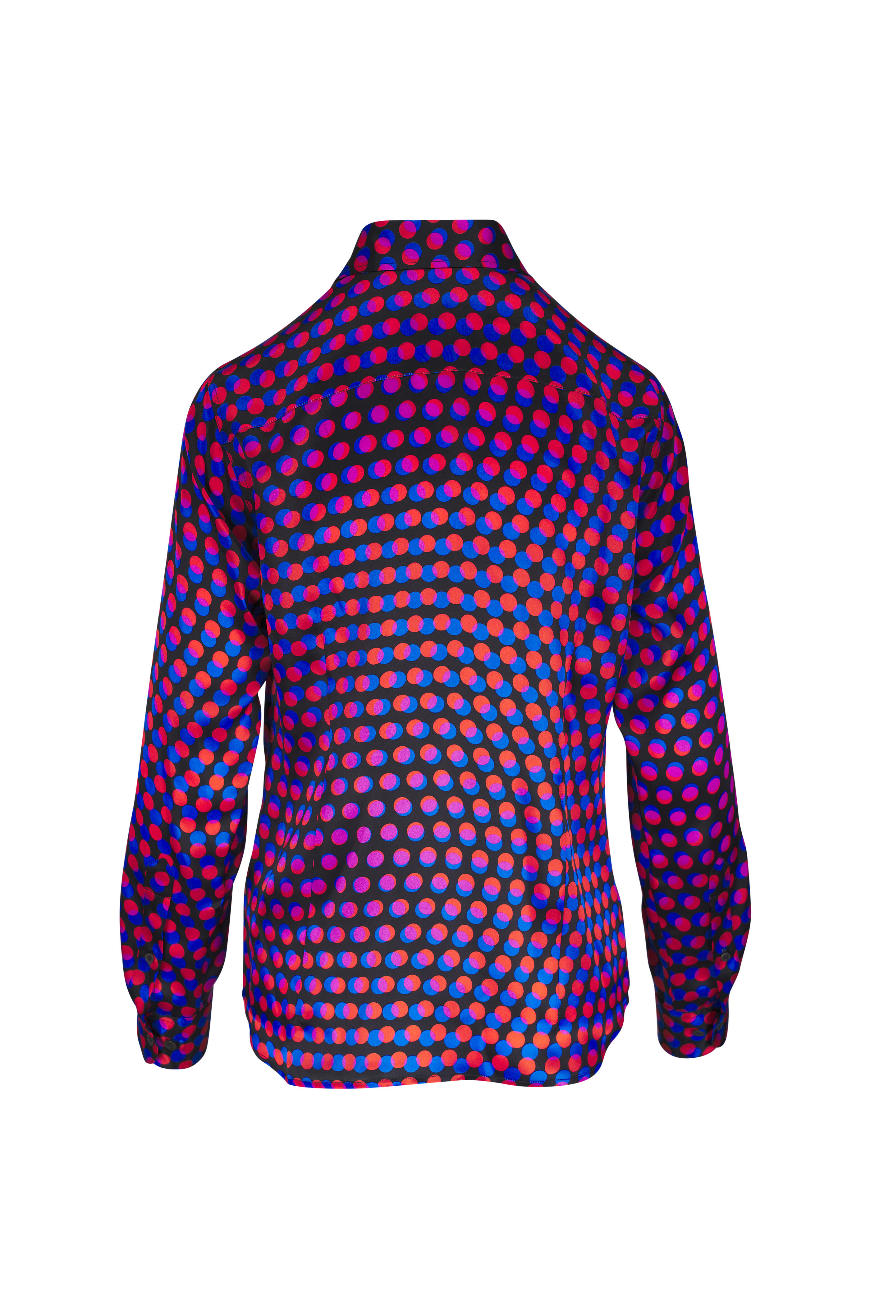 Pointed collar. Hidden front button closure. Wide cuffs. Imported. 100% Viscose. Dry clean only.